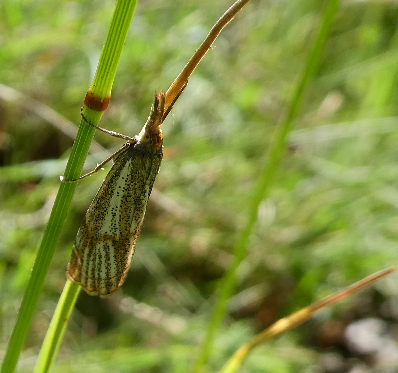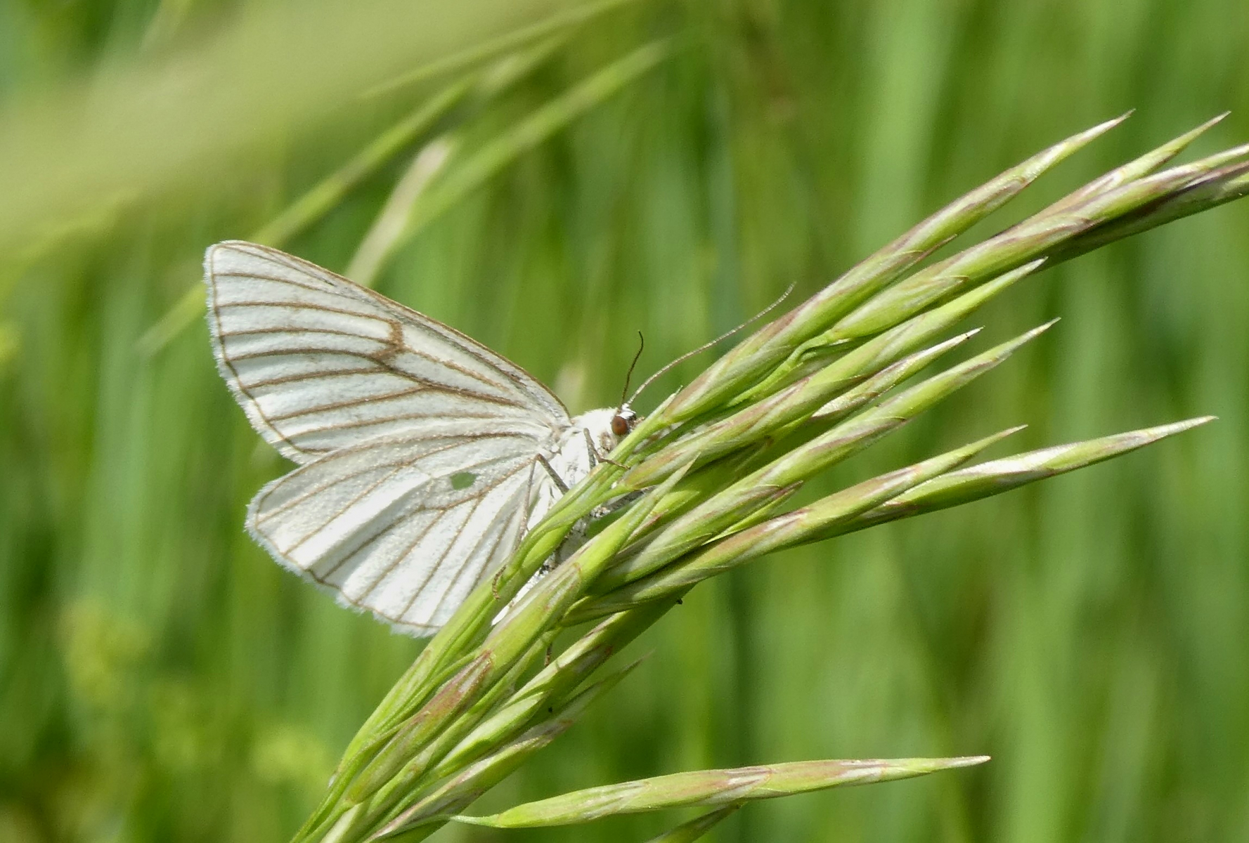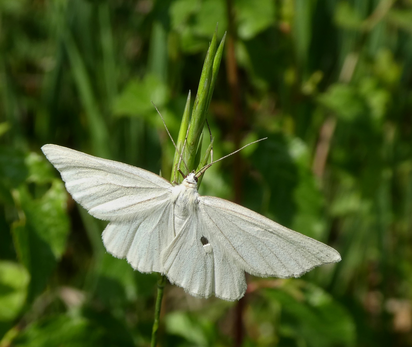 Ein leuchtendes Weiß-Gold fällt durchaus auf - ein Hartheu-Spanner (Siona lineata)