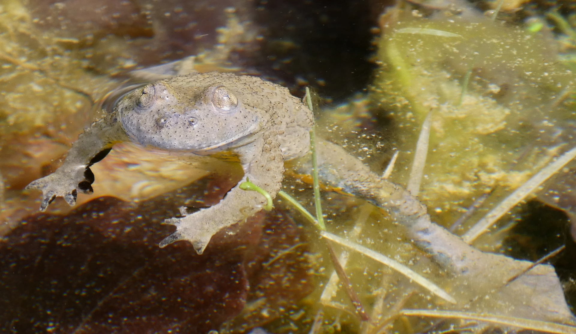 Plitsch, platsch machte es als ich an dem Bächlein vorbei lief, nur diese eine Gelbbauchunke war wohl im Tiefschlaf. Immerhin kann man die wunderbaren Farben auf der Unterseite ein klein wenig erahnen.