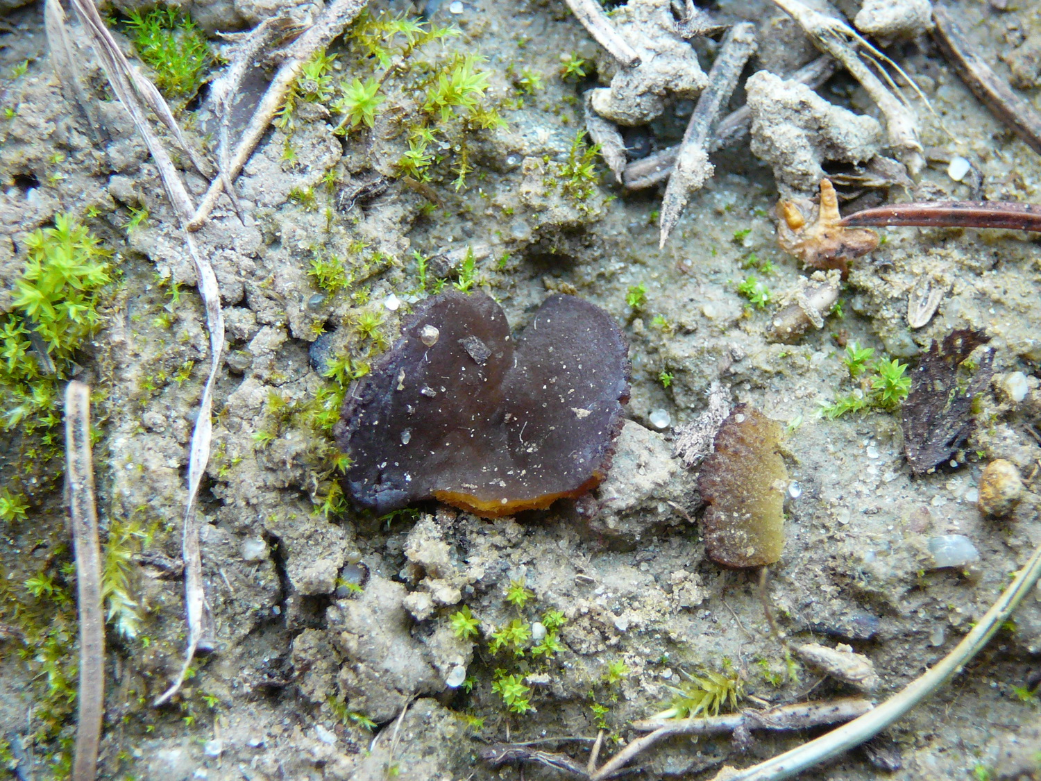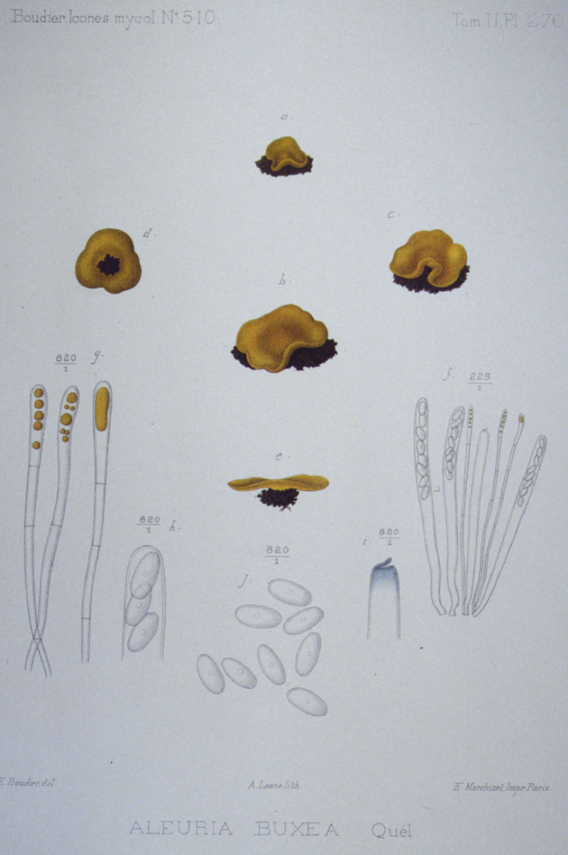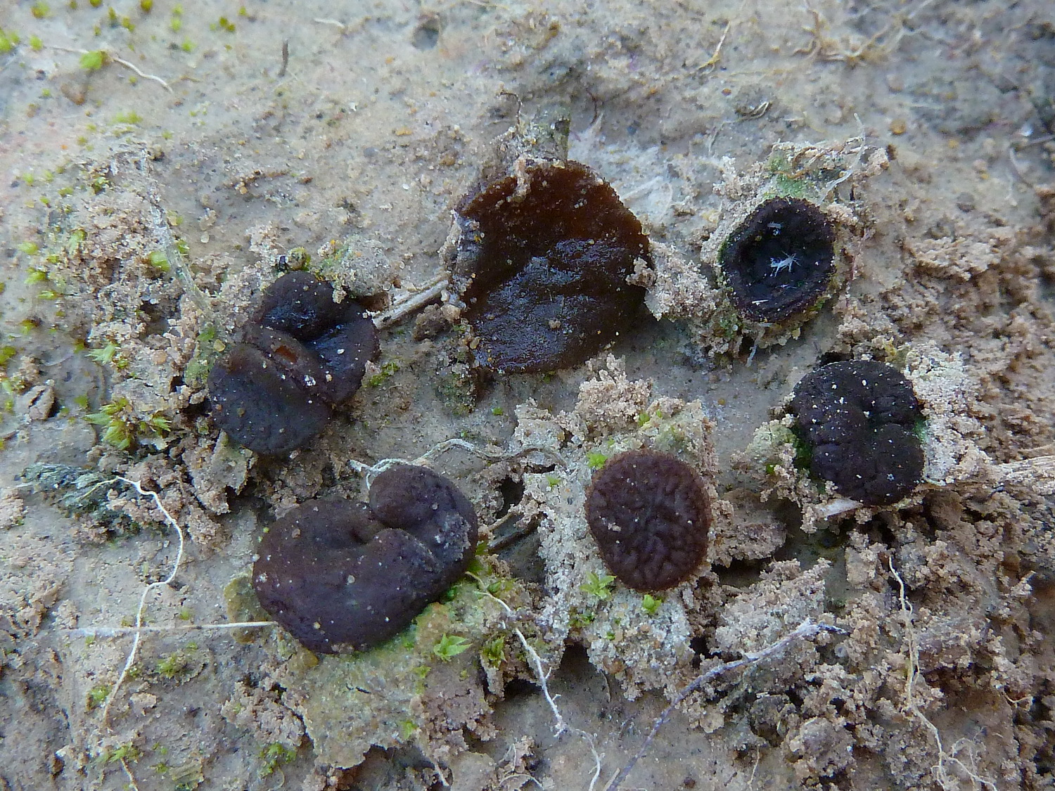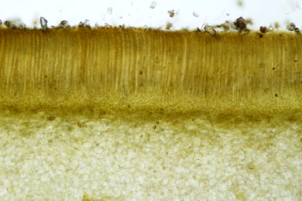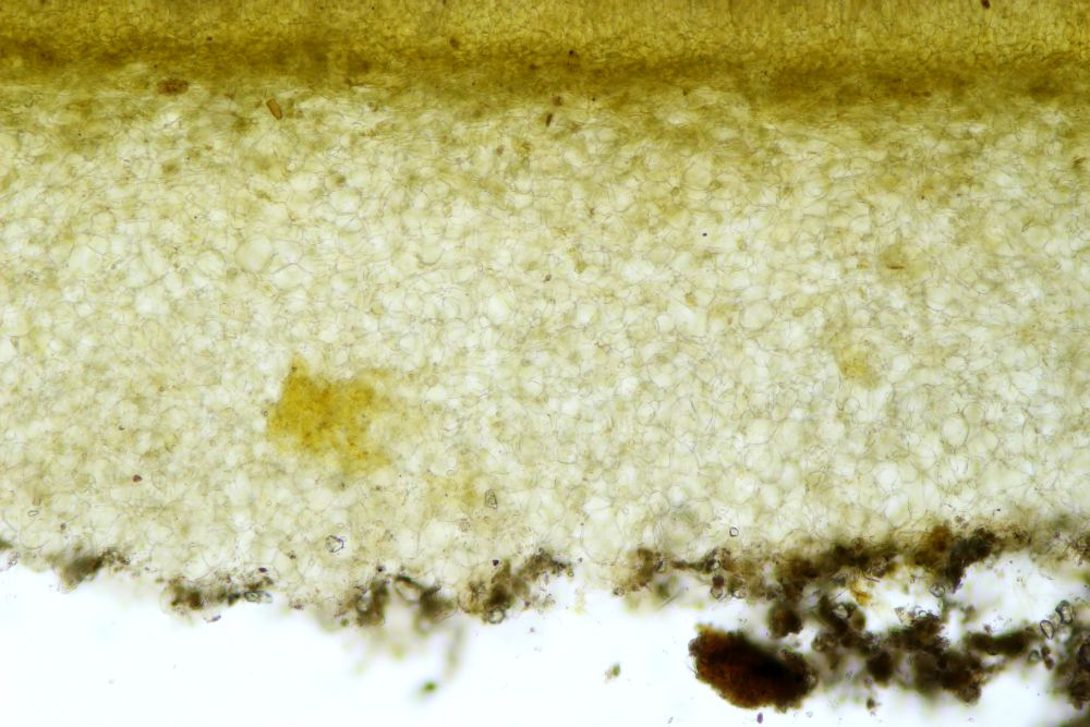 Apothecien flach ausgebreitet, im Schnitt olivgelblich, Unterseite leicht gestielt