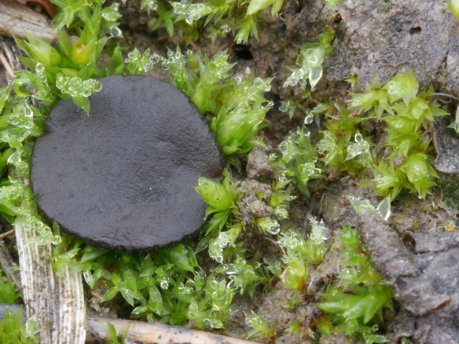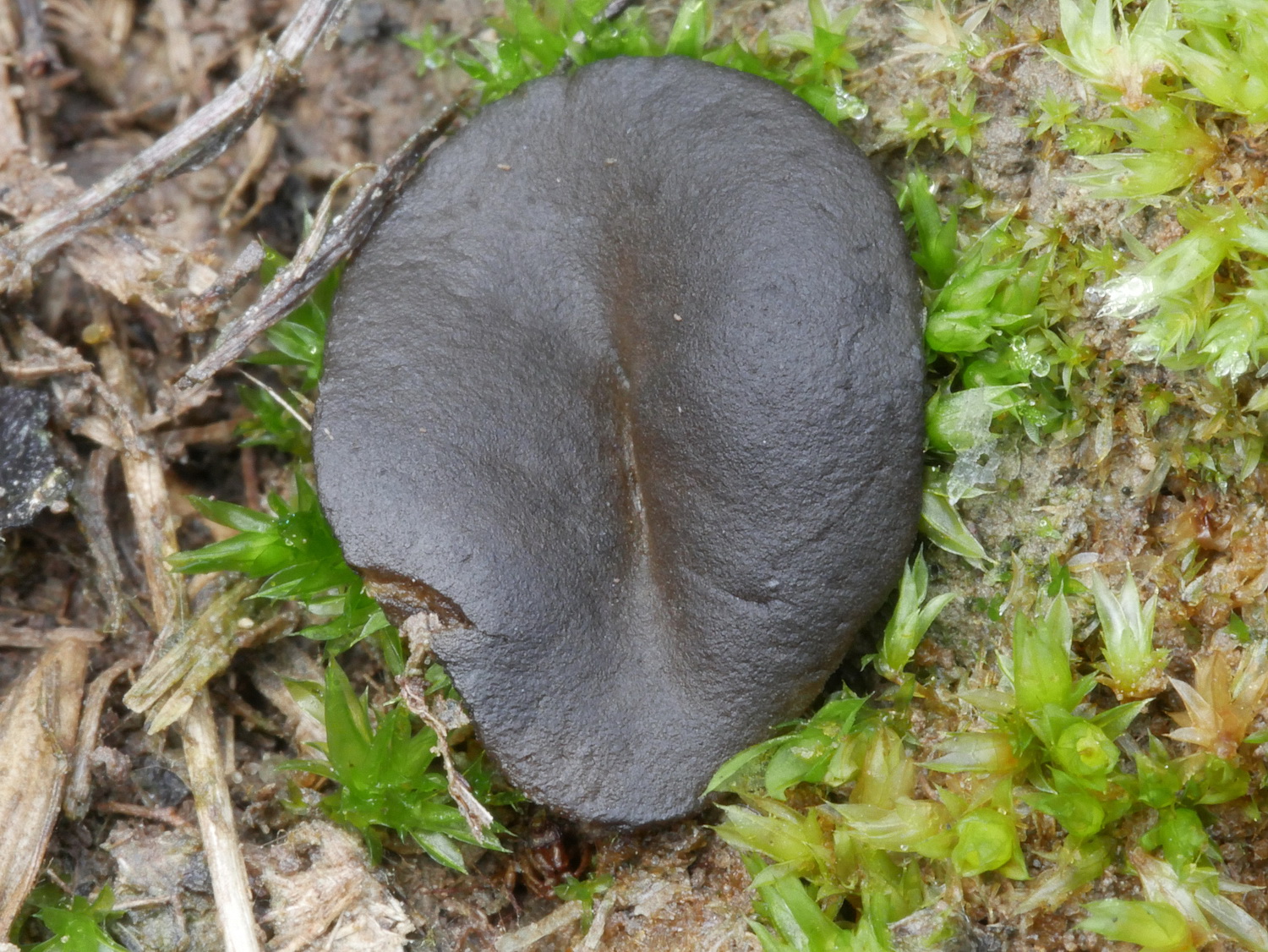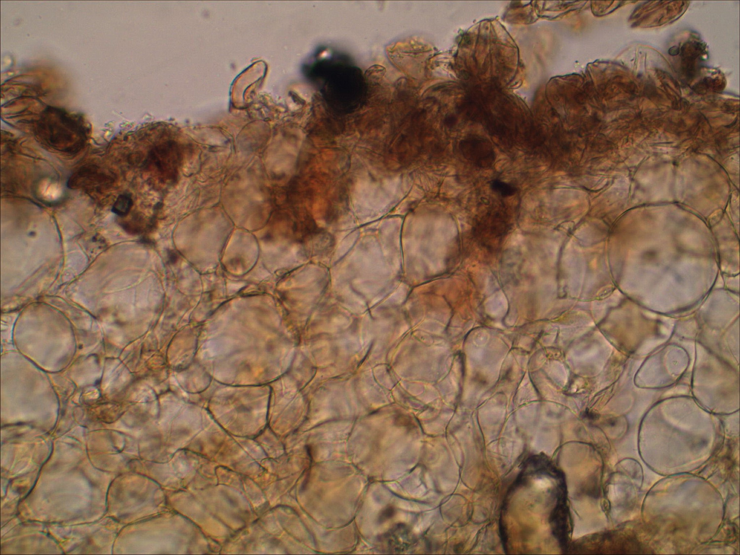 Apothecien flach ausgebreitet, im Schnitt olivgelblich, Unterseite leicht gestielt