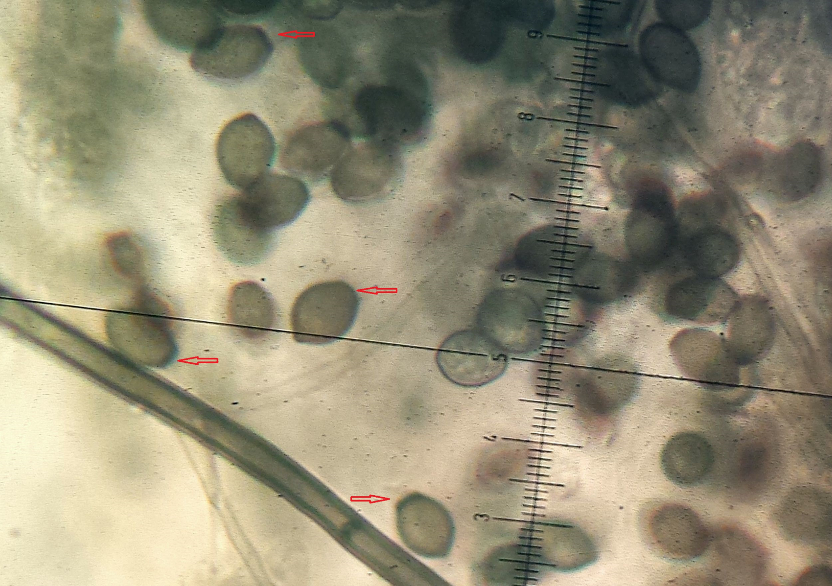 • Danke für die Literaturstelle. Ich hab die Sporen mit dem im Foto erkennbaren Messokular gemessen, selbst wenn man im Bild vergleicht, die 1-2 µm (hab grad noch mal im Doveri geschaut), vielleicht var. namibiensis :)