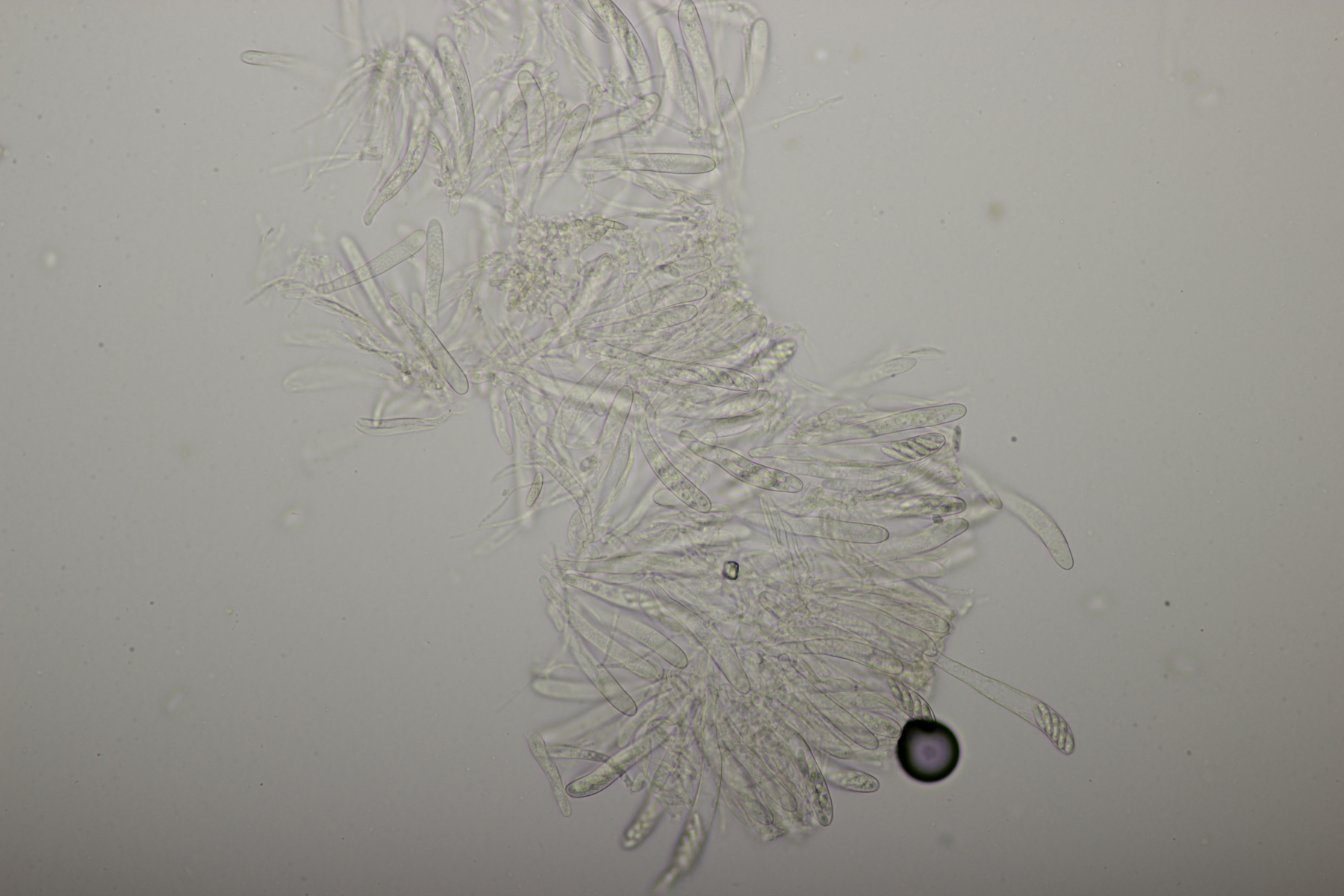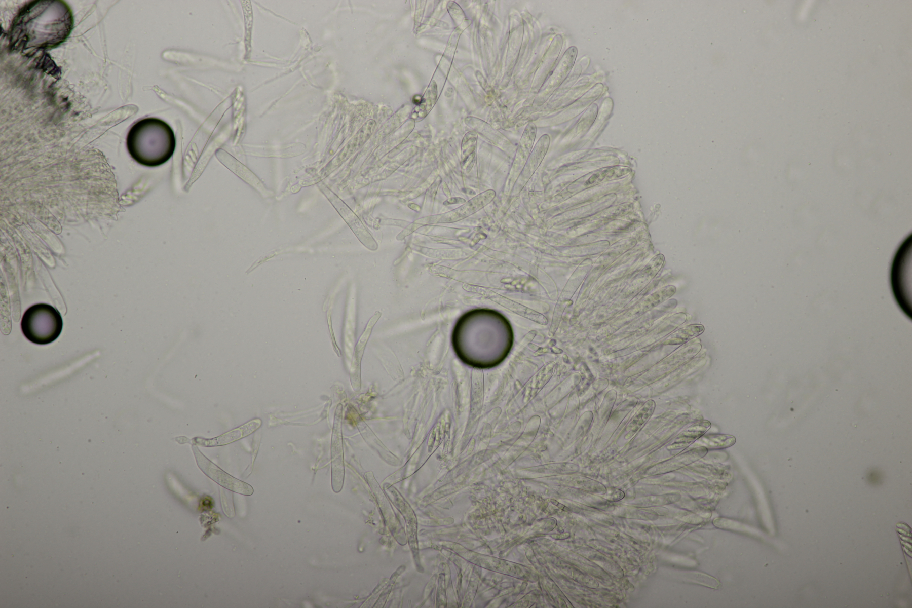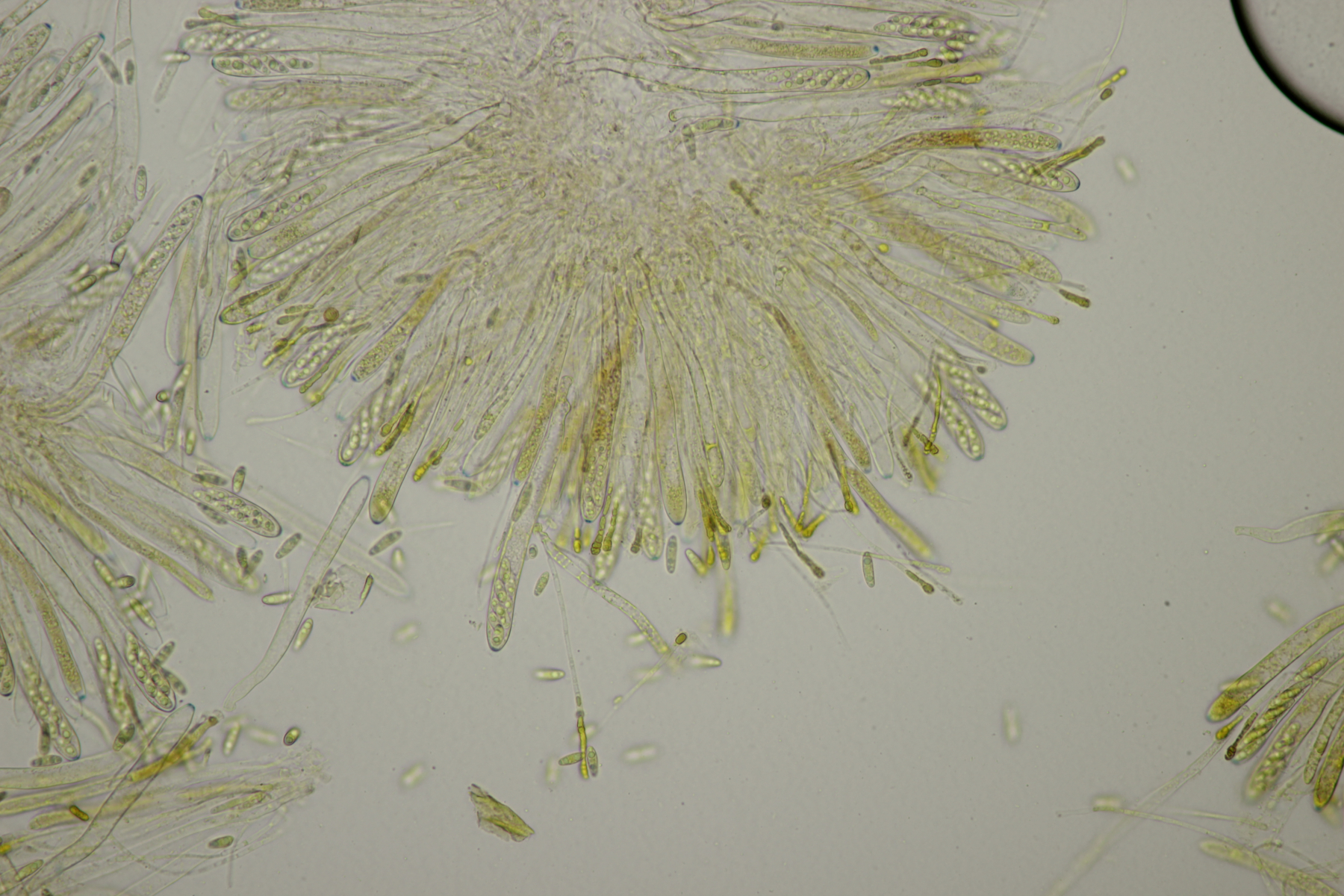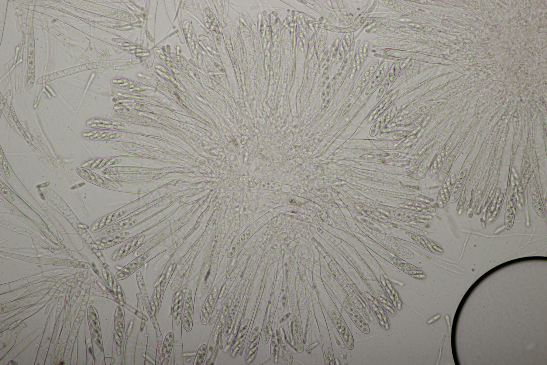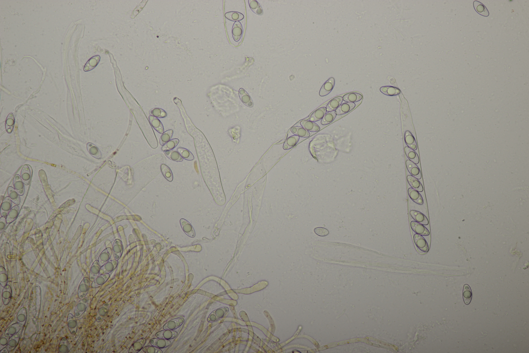 2. Ascocoryne mit Sporengröße (16.7+-1.0) µm x (4.4+-0.3) µm, Q=3.8+-0.3, womit ich bei Ascocoryne sarcoides lande