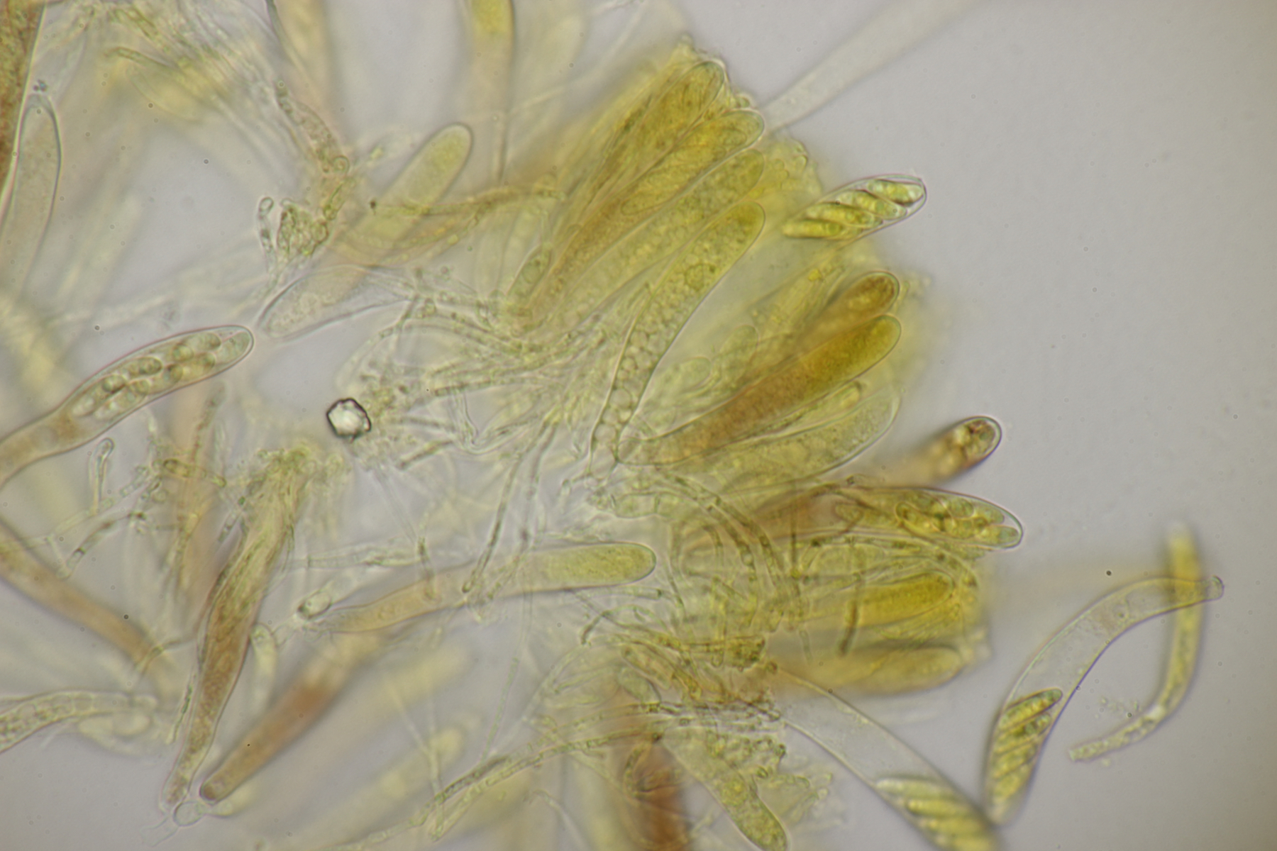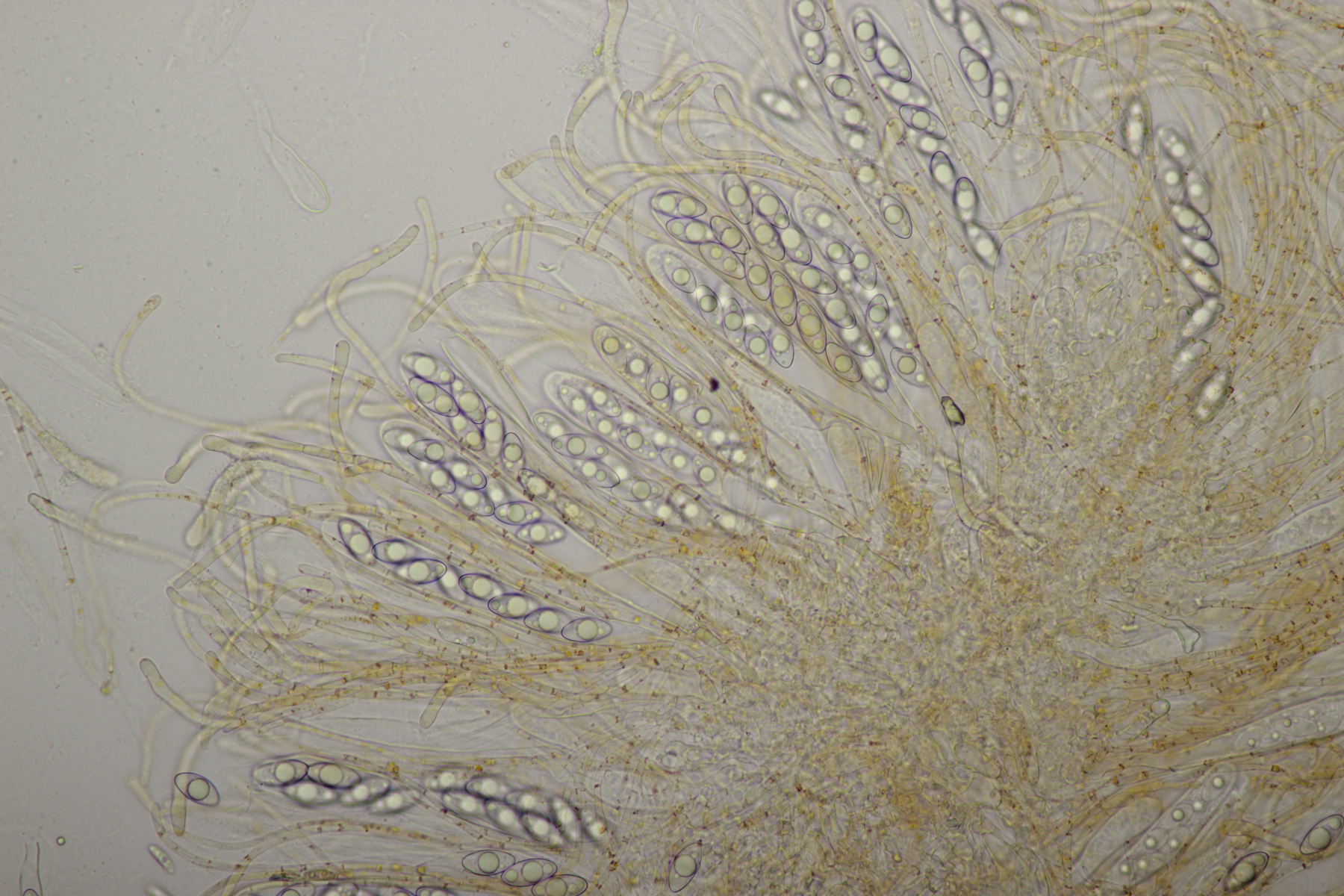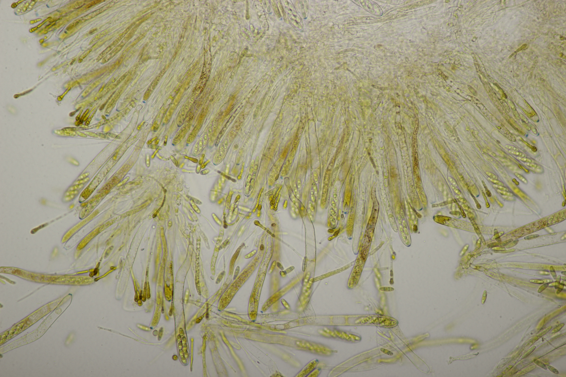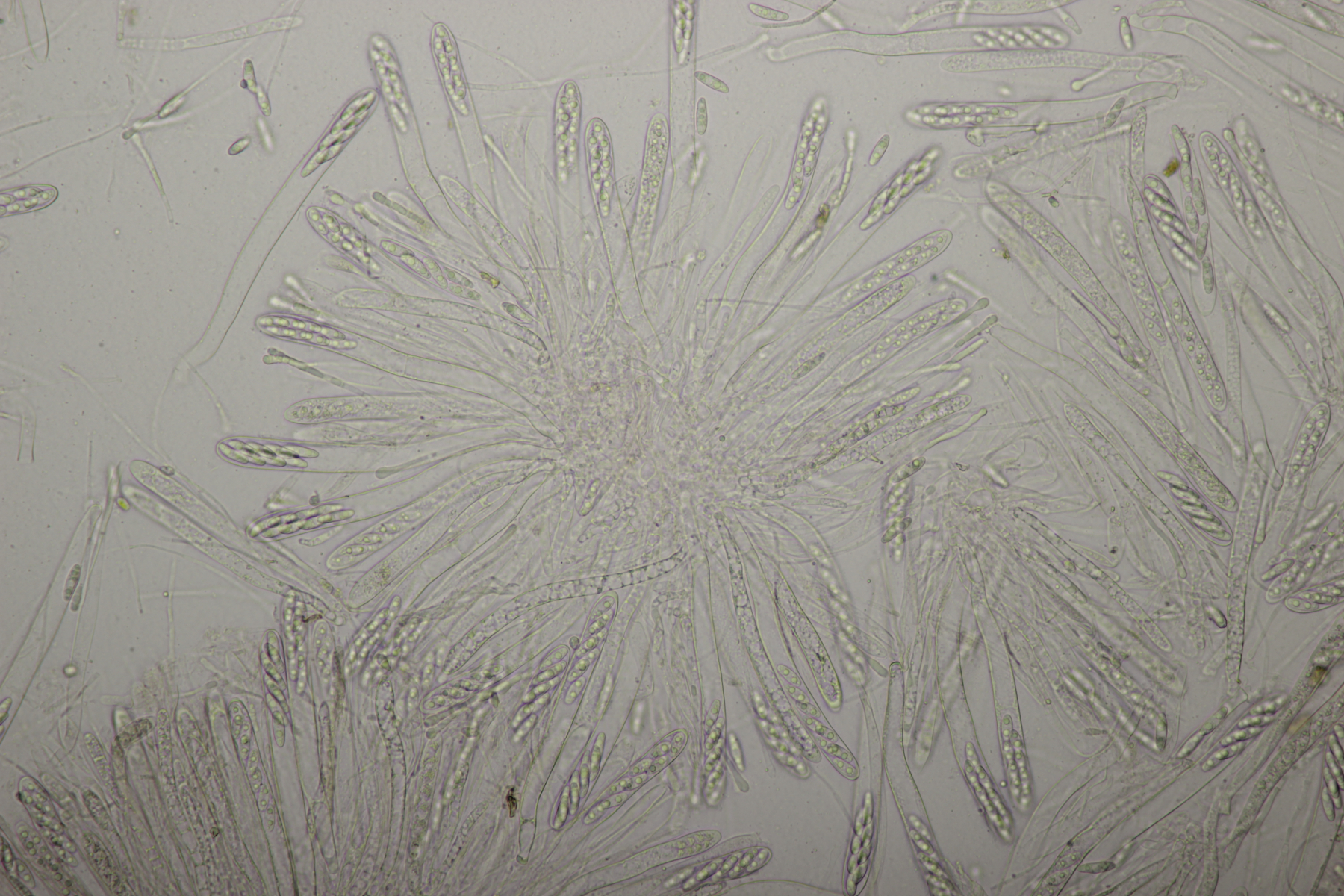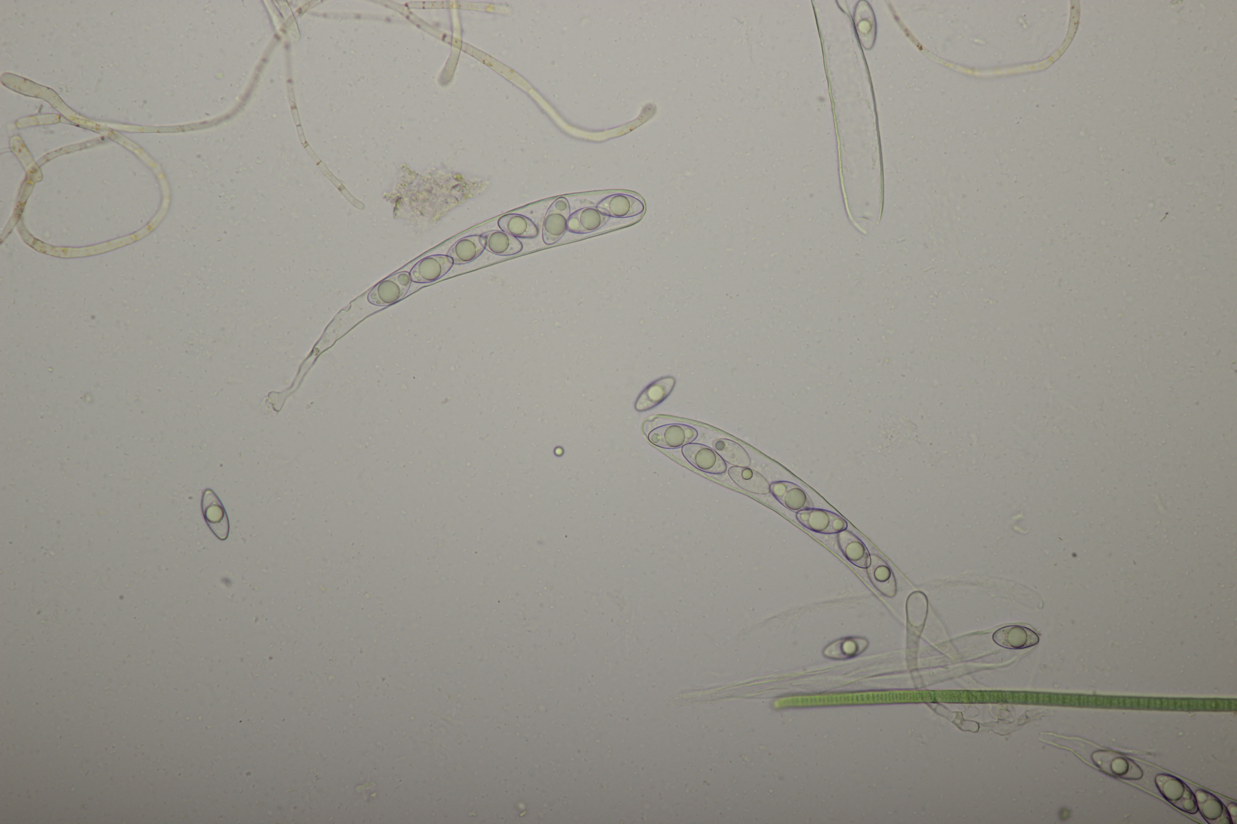 2. Ascocoryne mit Sporengröße (16.7+-1.0) µm x (4.4+-0.3) µm, Q=3.8+-0.3, womit ich bei Ascocoryne sarcoides lande
