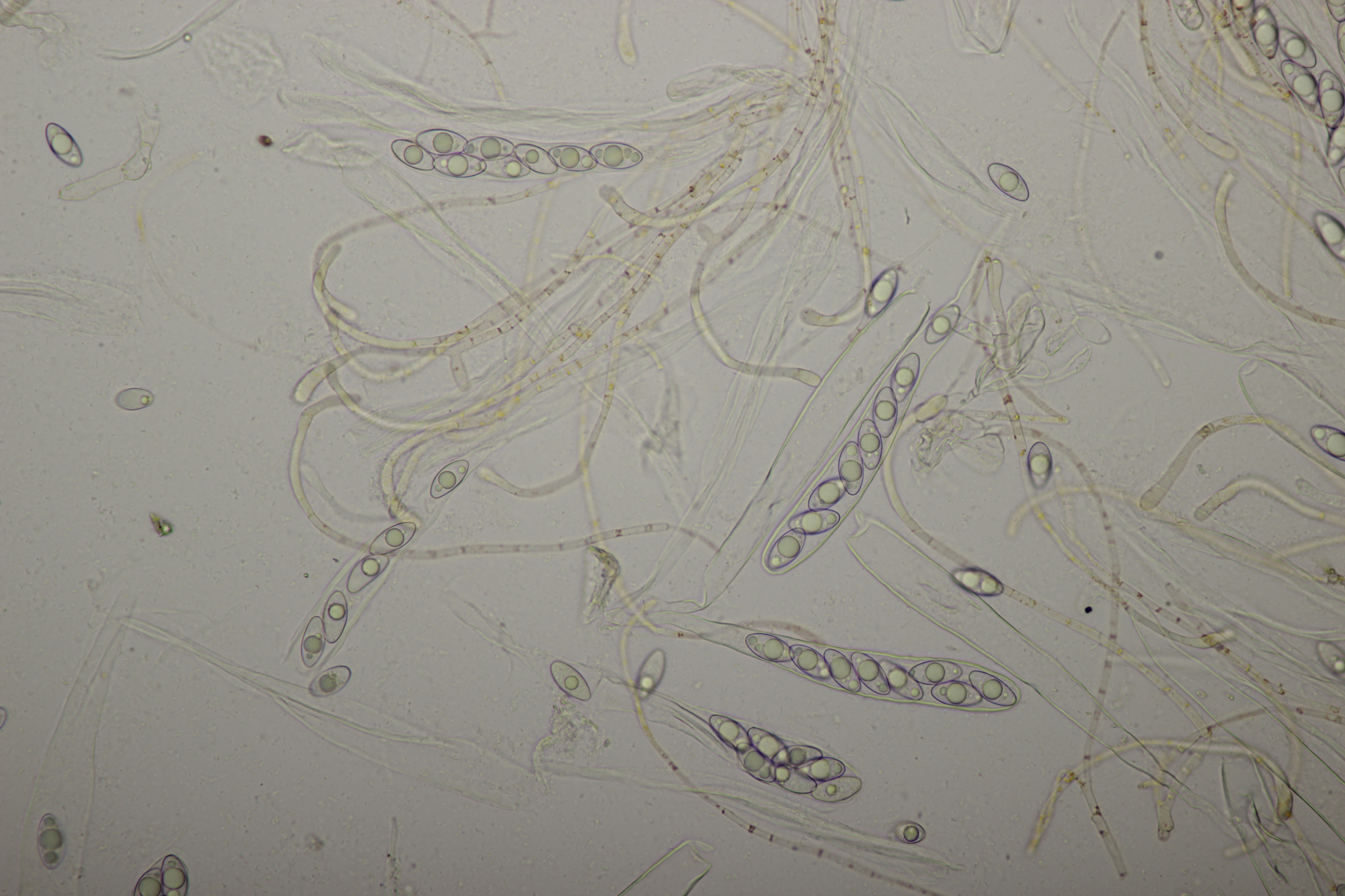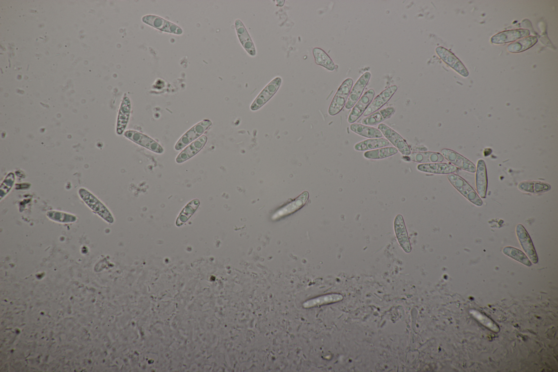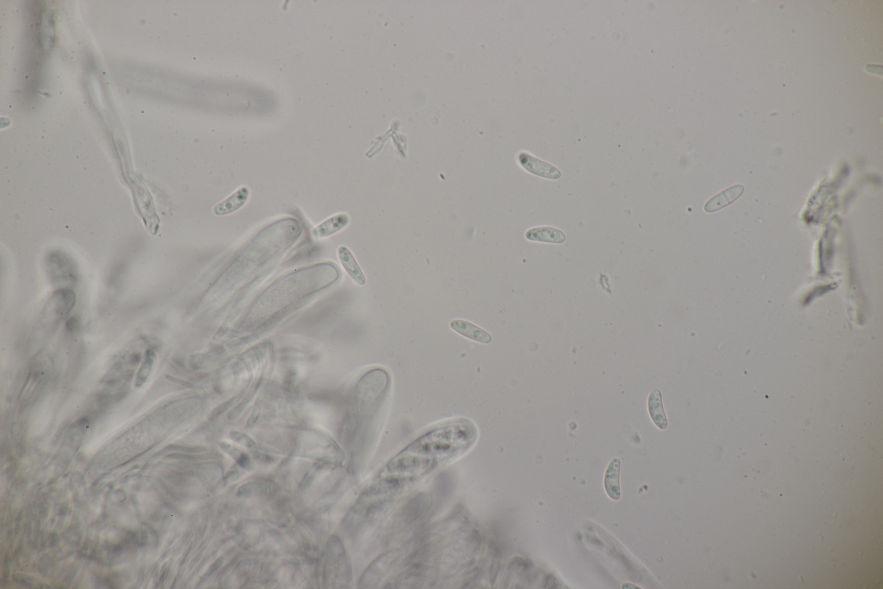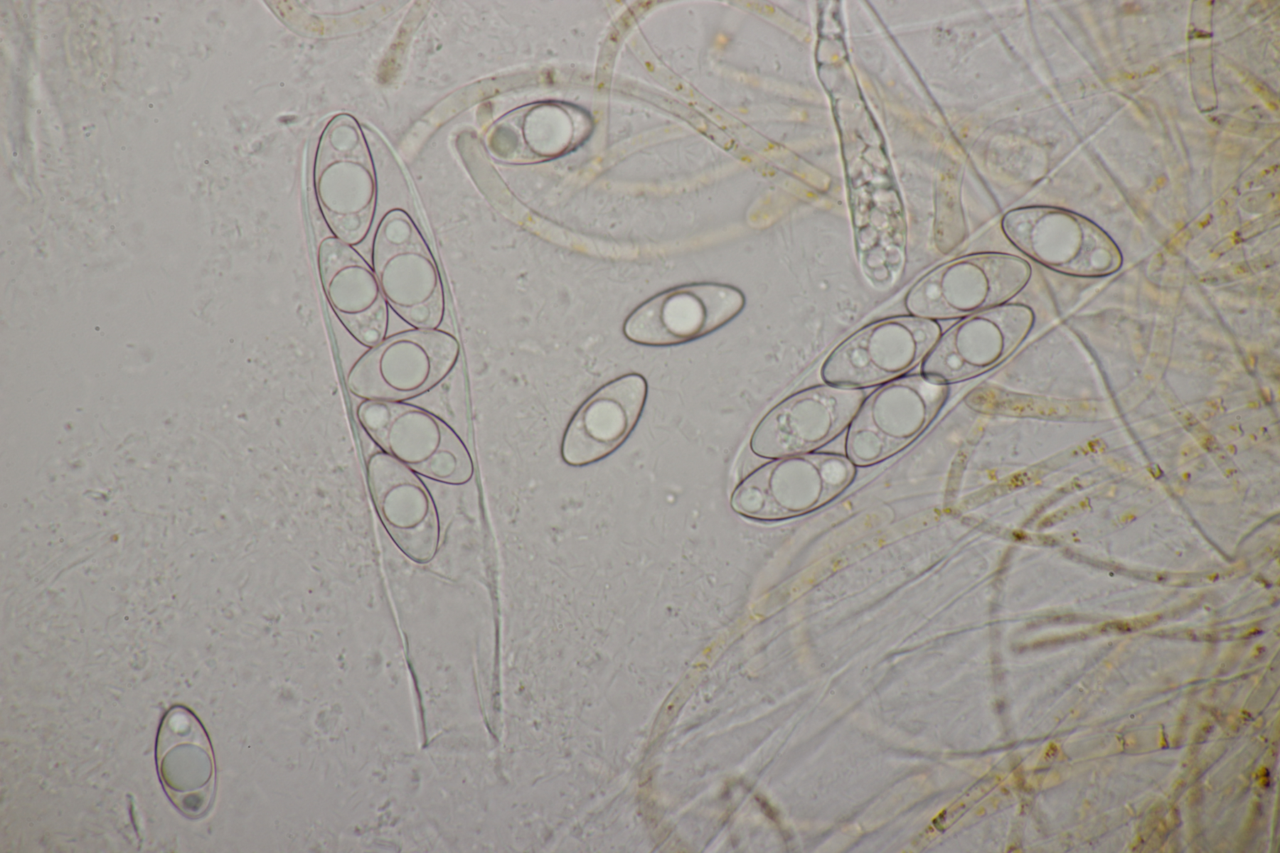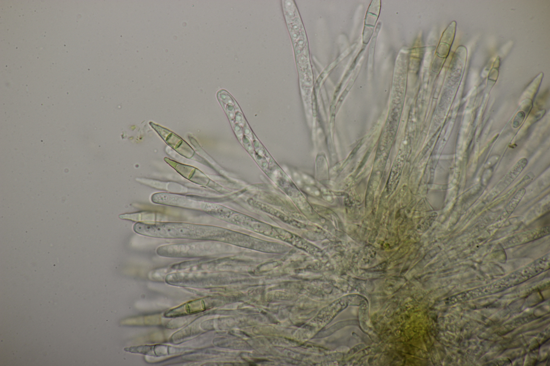 2. Ascocoryne mit Sporengröße (16.7+-1.0) µm x (4.4+-0.3) µm, Q=3.8+-0.3, womit ich bei Ascocoryne sarcoides lande