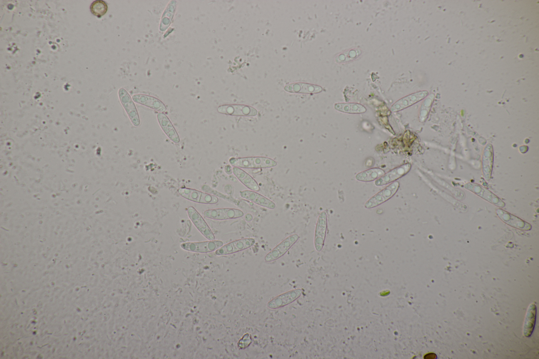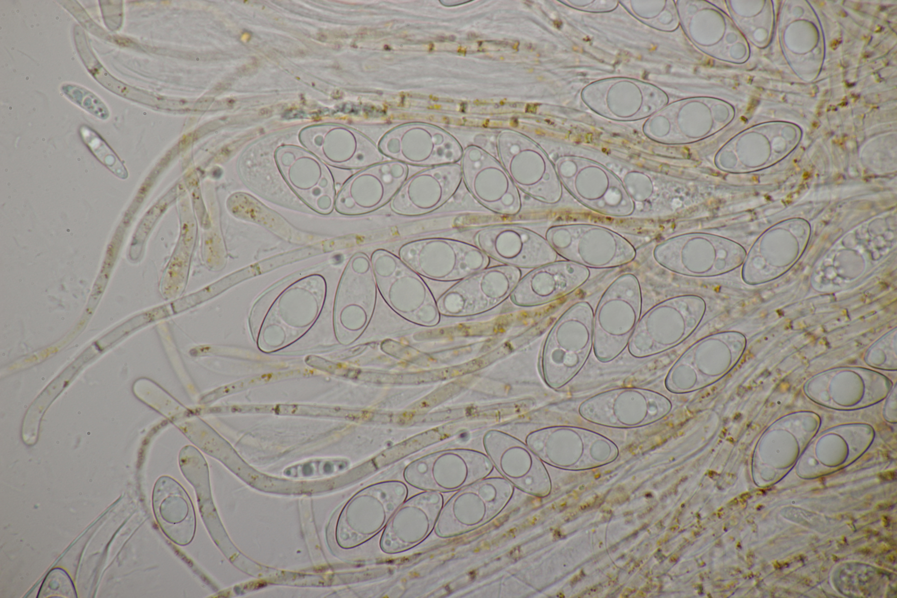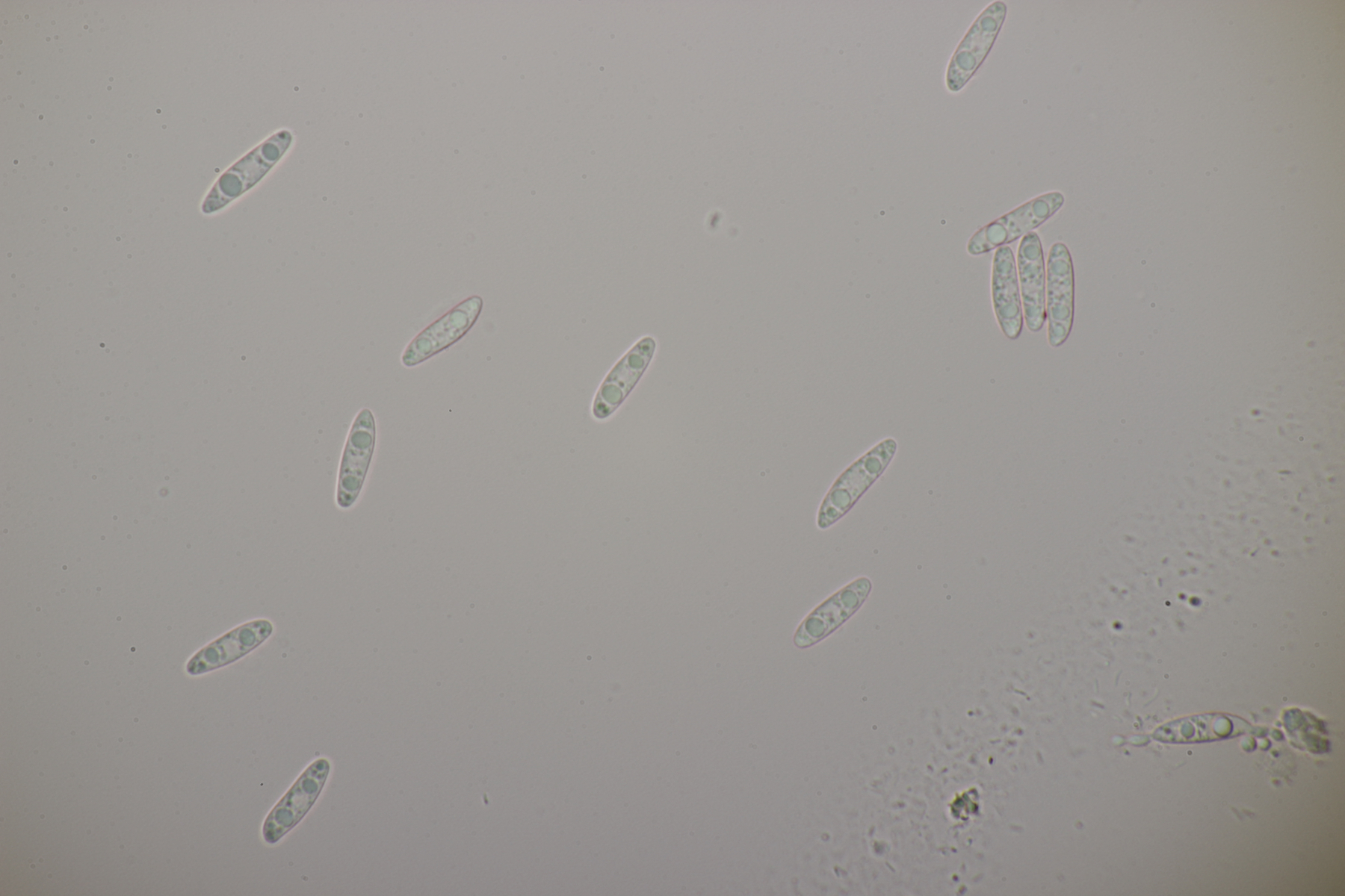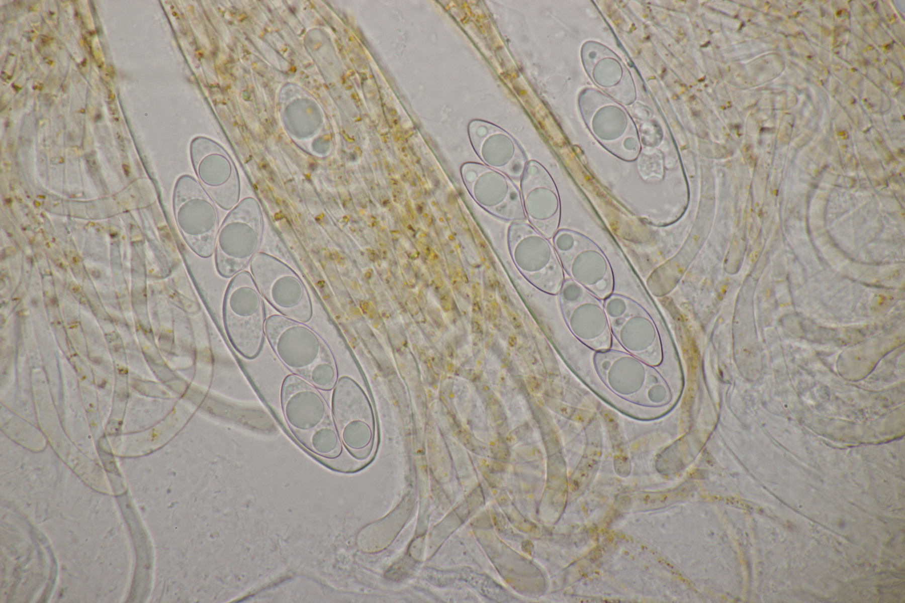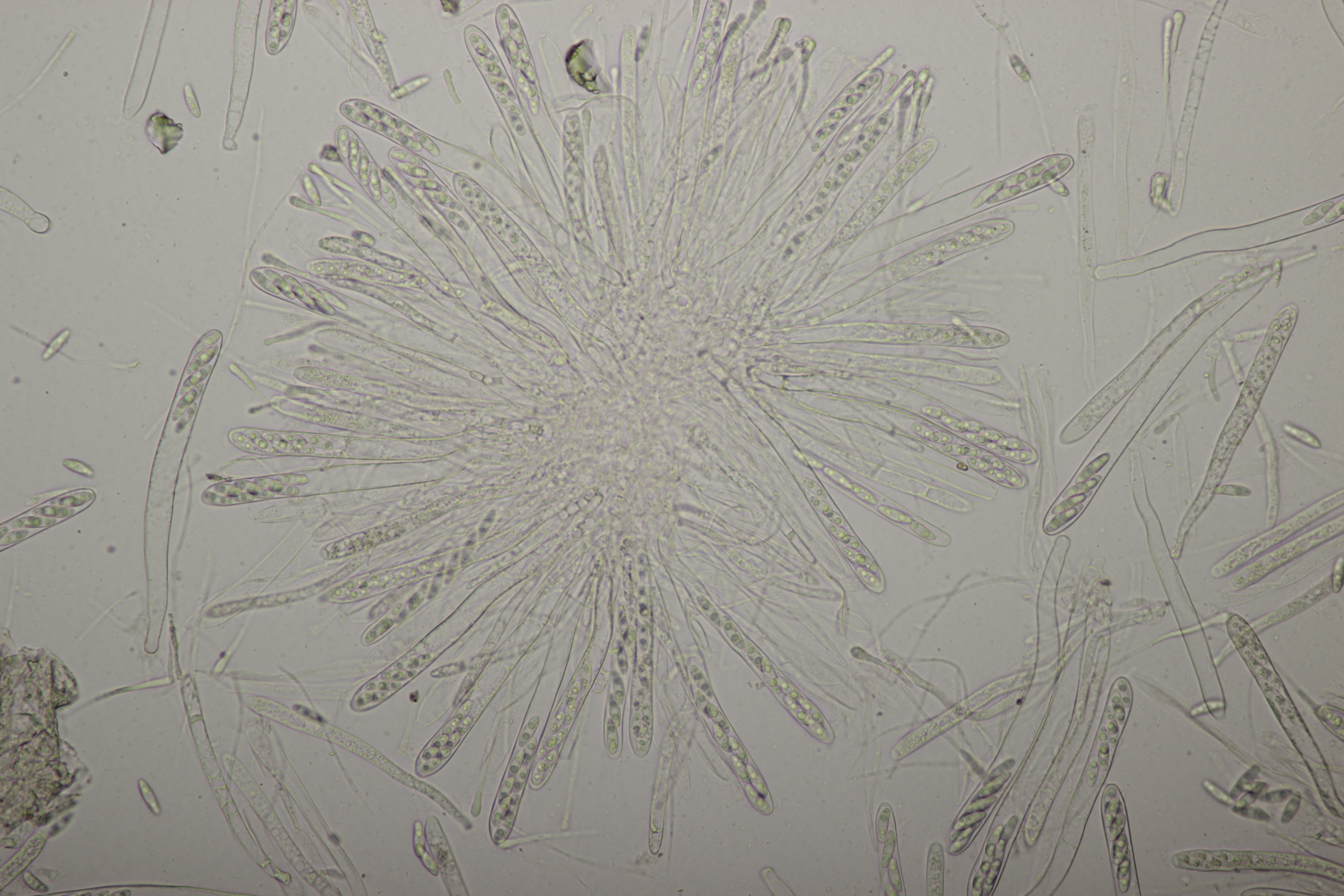 2. Ascocoryne mit Sporengröße (16.7+-1.0) µm x (4.4+-0.3) µm, Q=3.8+-0.3, womit ich bei Ascocoryne sarcoides lande