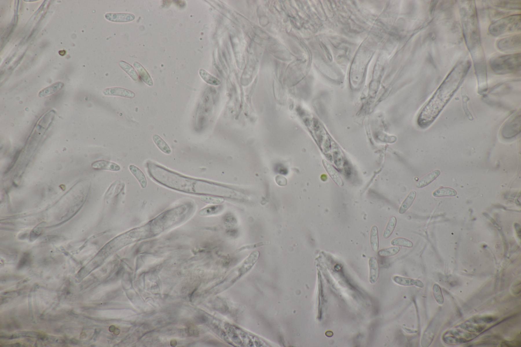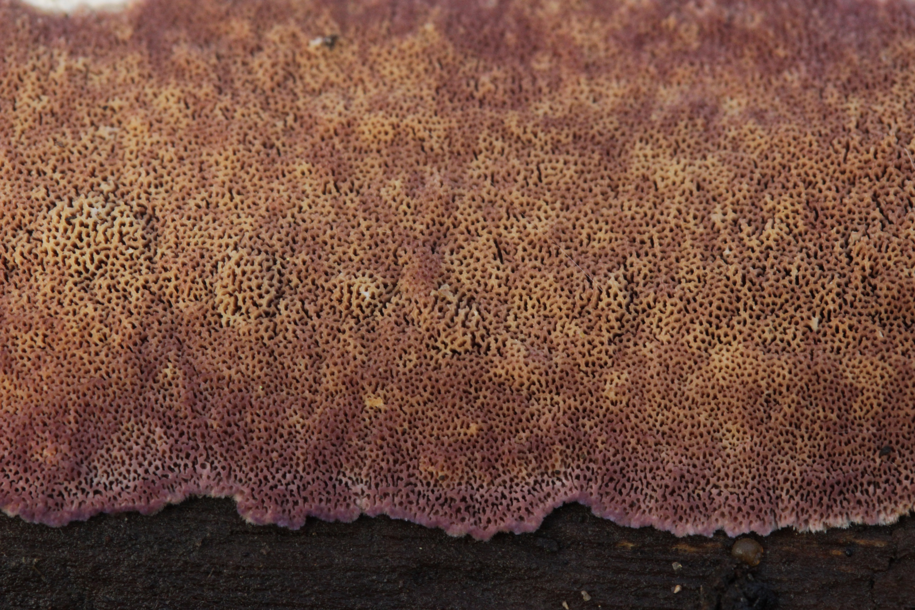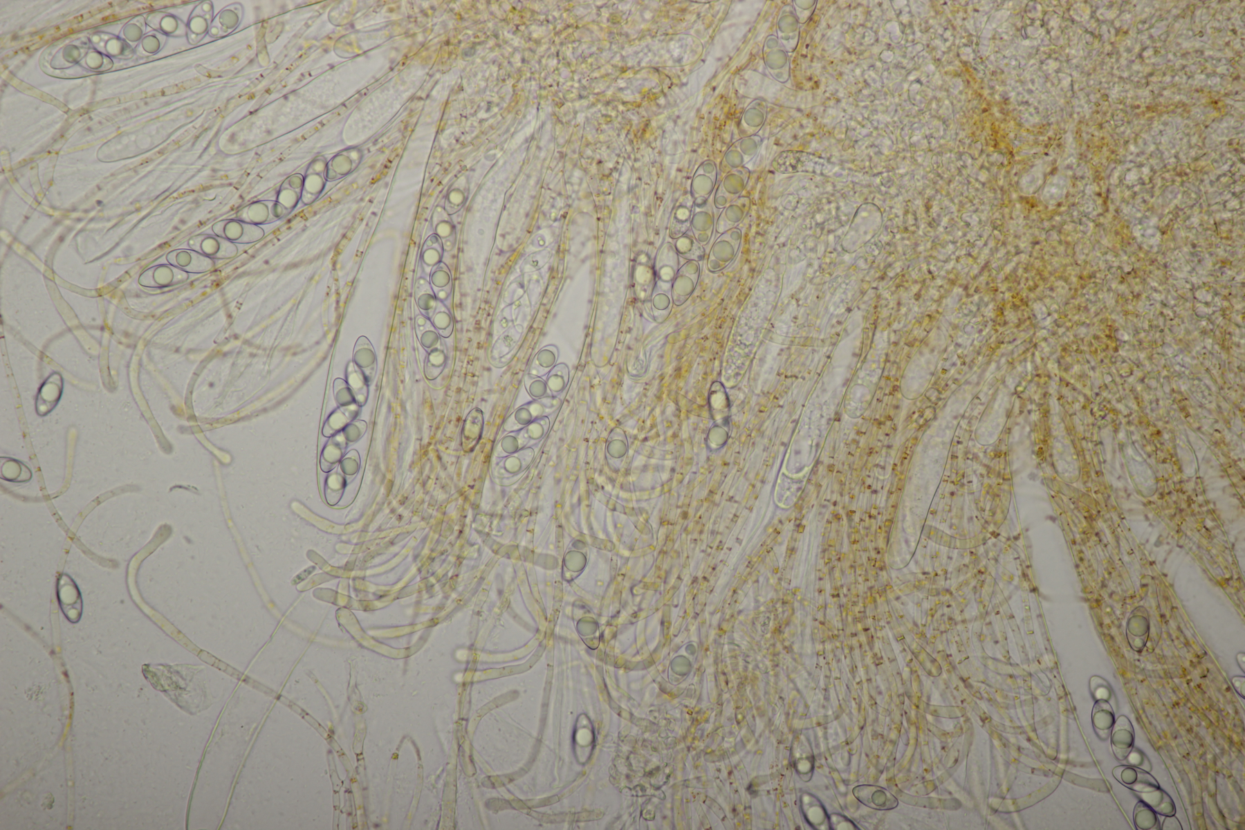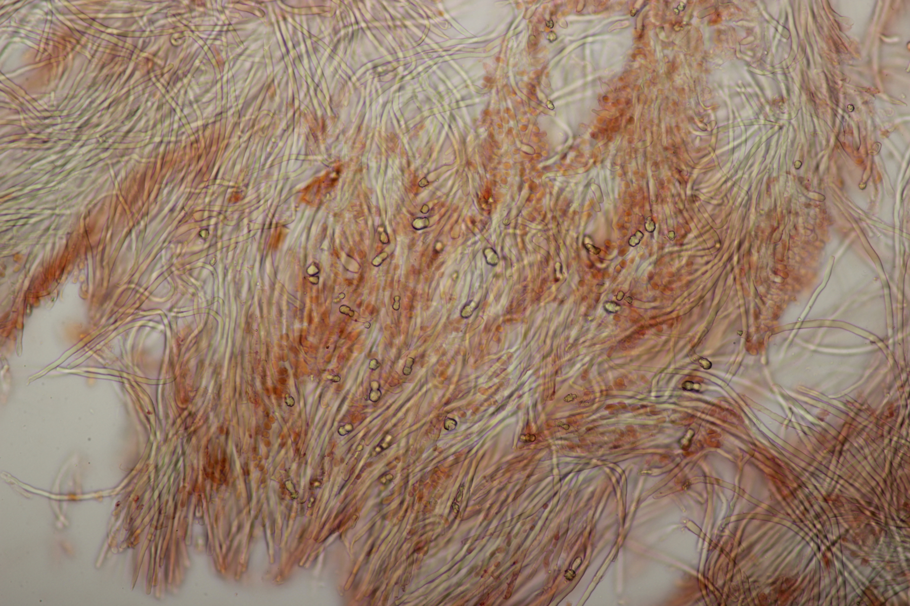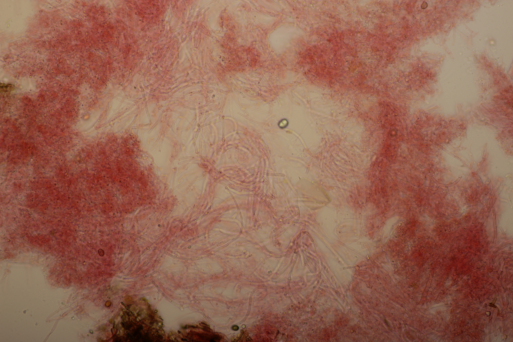 4. Ein Porling... aber diesmal immerhin mit Sporen, die (7.4+-0.5) µm x (2.3+-0.2) µm groß sind. Das Hyphensystem scheint monomitisch zu sein, Schnallen gibt es keine. Der Fruchtkörper färbt mit 3% KOH intensiv dunkelrot. Wenn man beim Mikroskopieren KOH zugibt, entfärbt sich der Pilz. Ich würde hier zu einer Ceriporia tendieren und lande dann bei C. purpurea. Kann die farblich so orange sein?