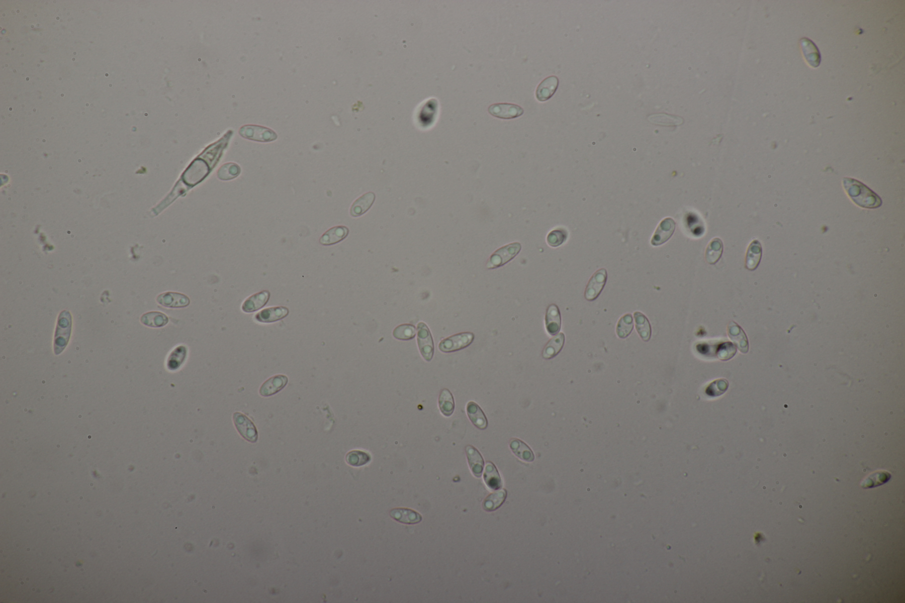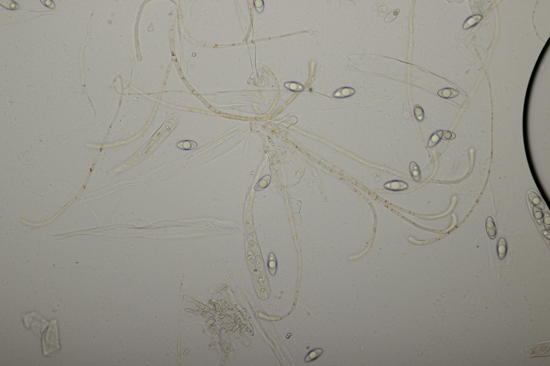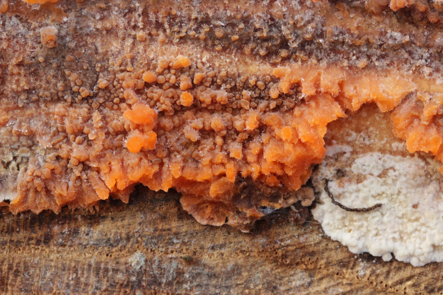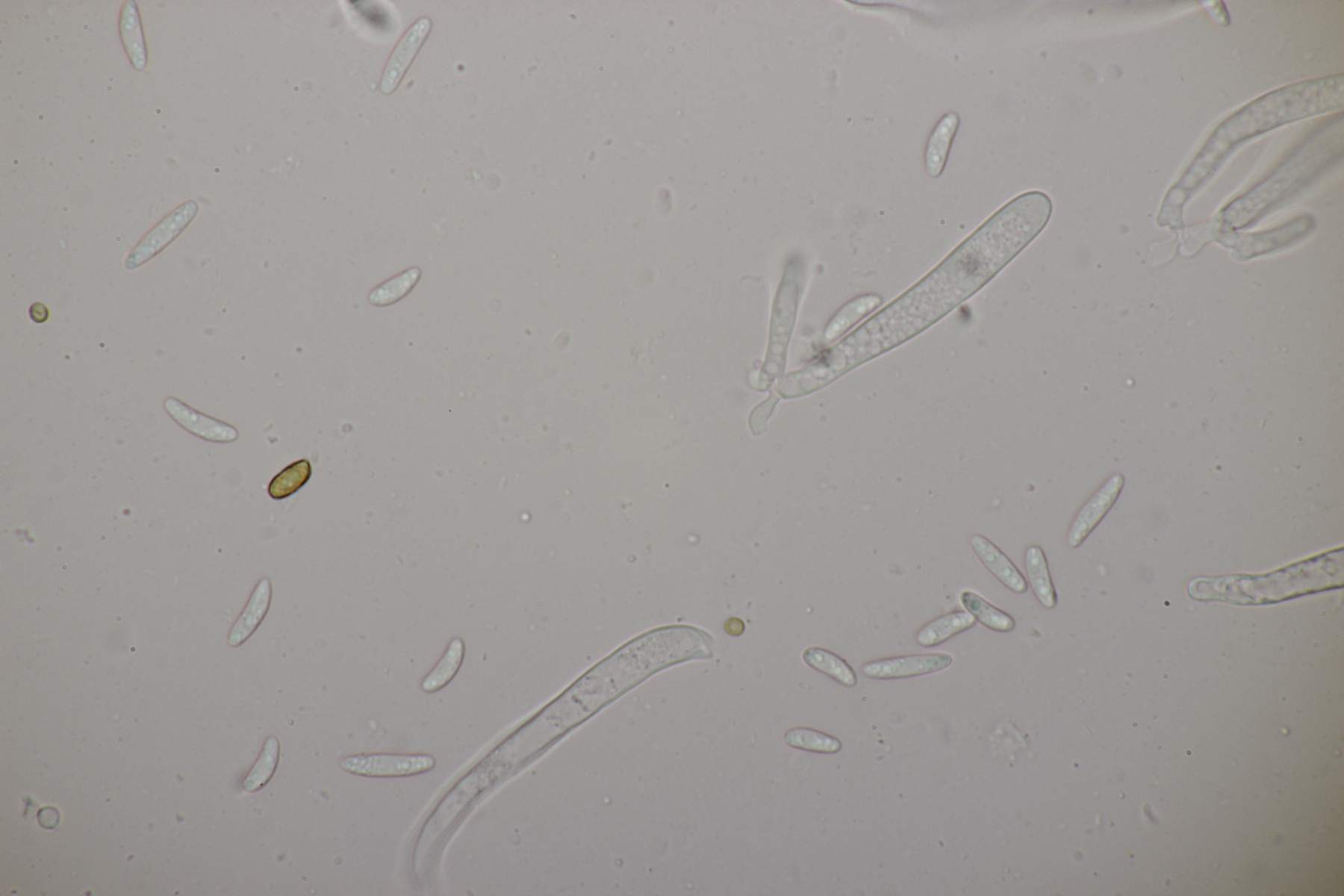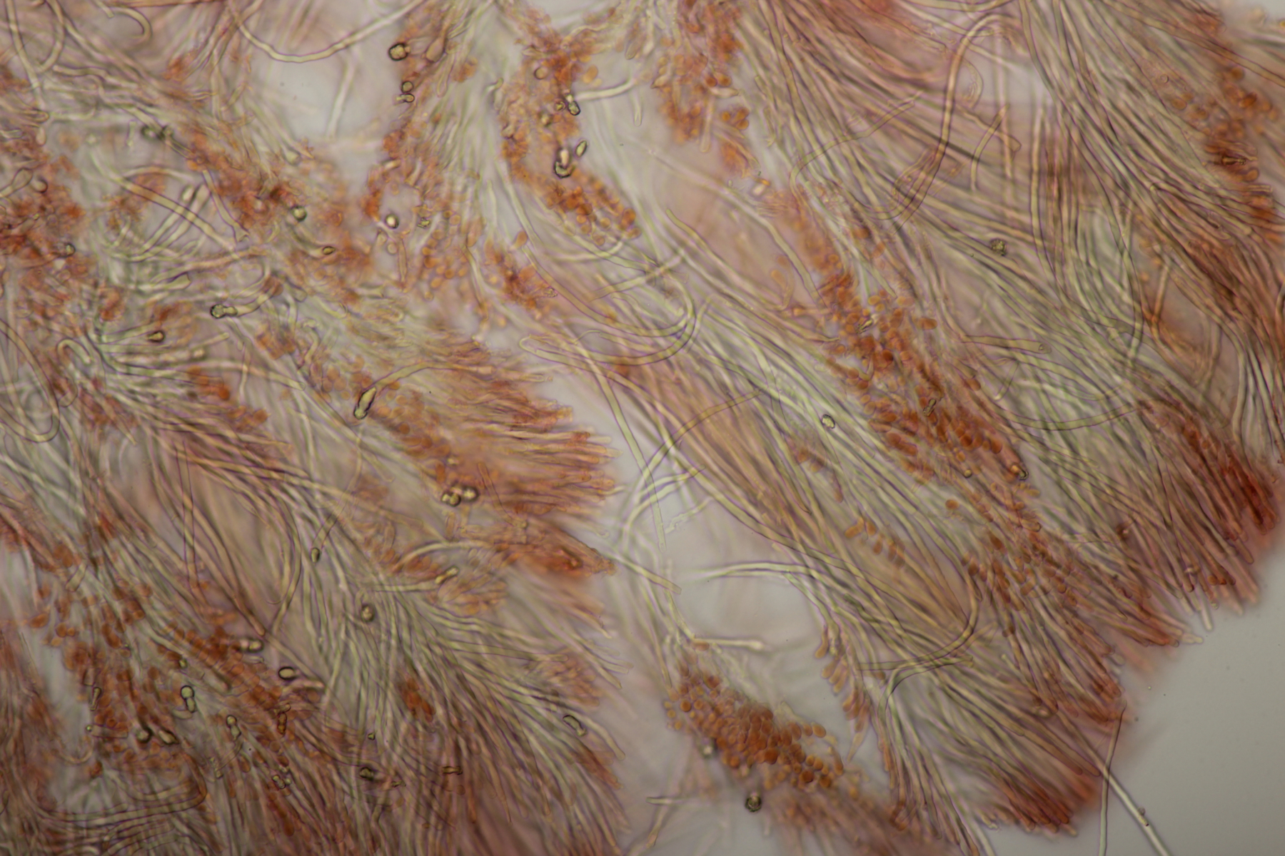 4. Ein Porling... aber diesmal immerhin mit Sporen, die (7.4+-0.5) µm x (2.3+-0.2) µm groß sind. Das Hyphensystem scheint monomitisch zu sein, Schnallen gibt es keine. Der Fruchtkörper färbt mit 3% KOH intensiv dunkelrot. Wenn man beim Mikroskopieren KOH zugibt, entfärbt sich der Pilz. Ich würde hier zu einer Ceriporia tendieren und lande dann bei C. purpurea. Kann die farblich so orange sein?
