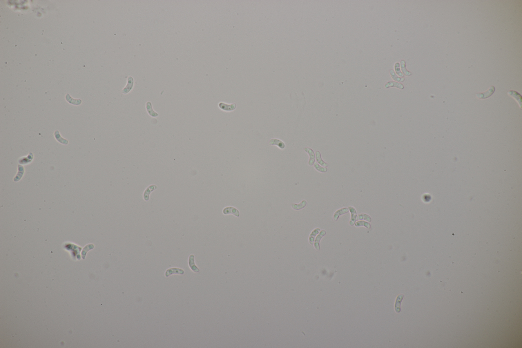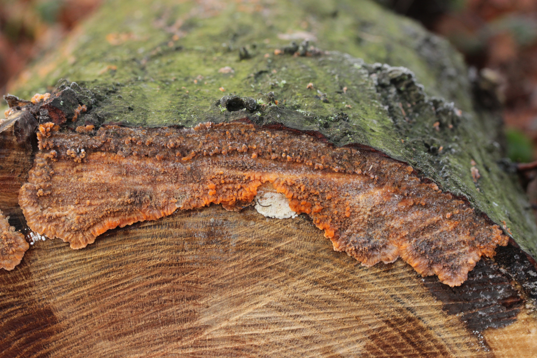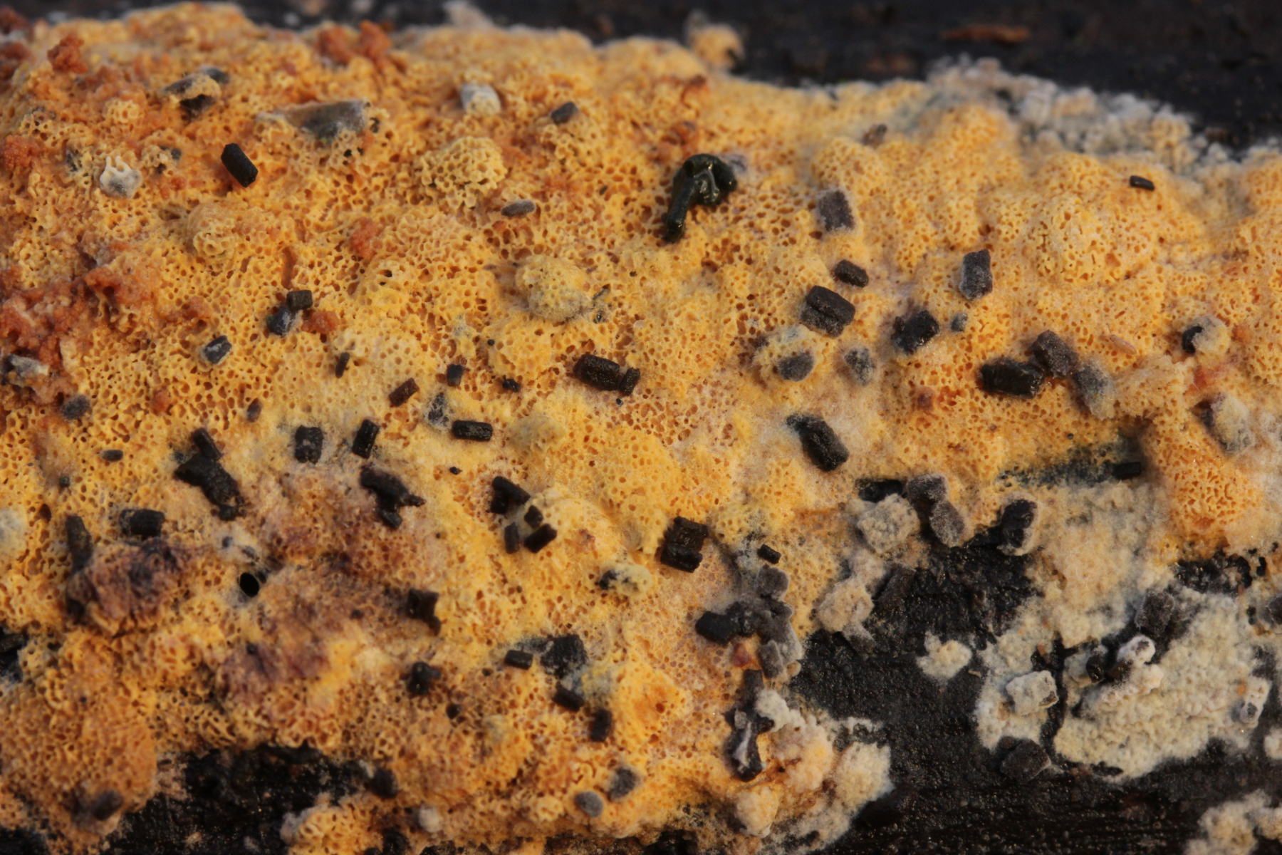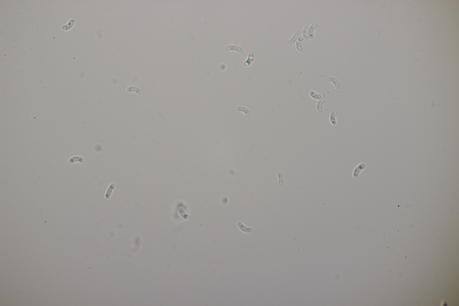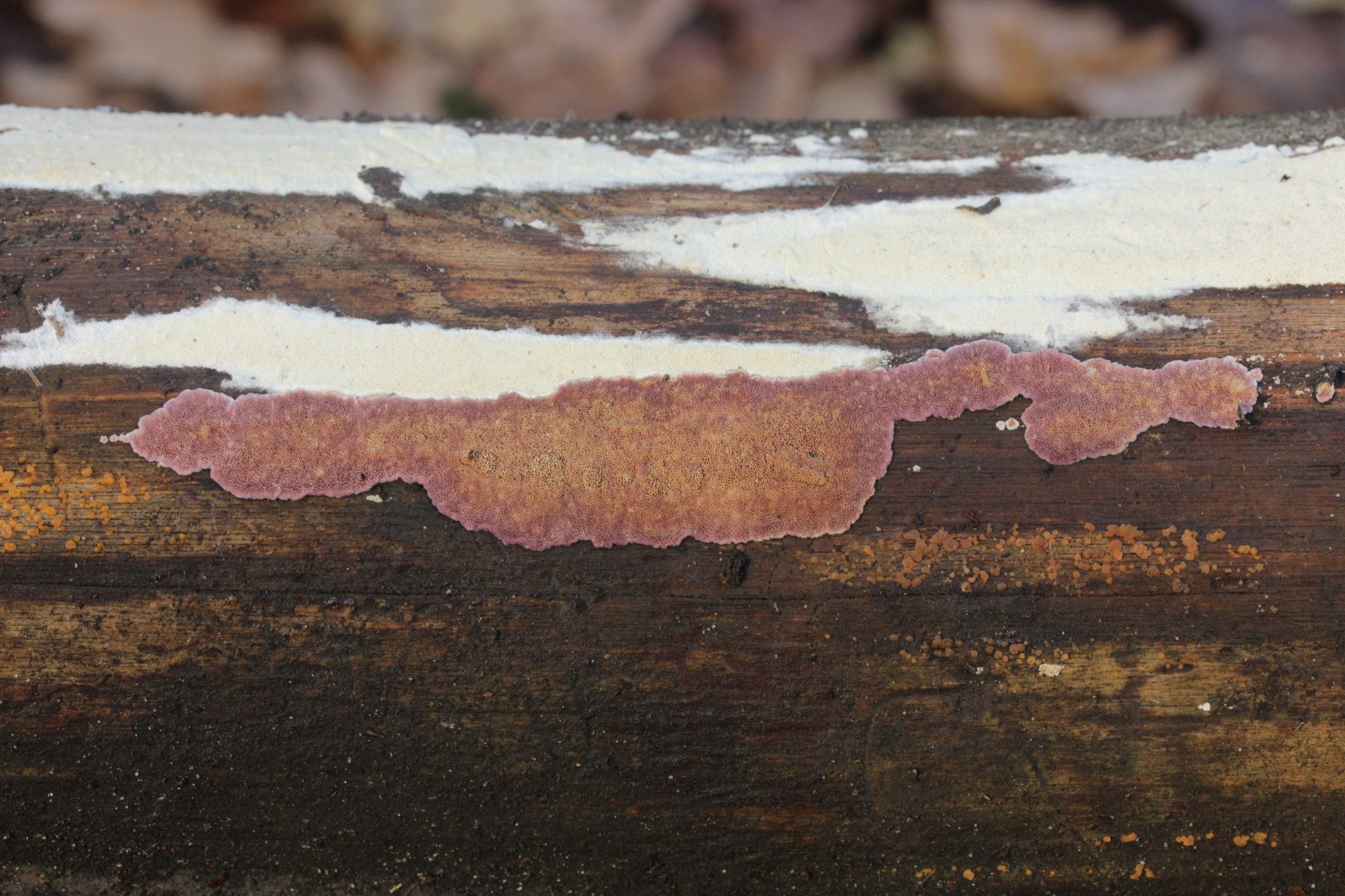 4. Ein Porling... aber diesmal immerhin mit Sporen, die (7.4+-0.5) µm x (2.3+-0.2) µm groß sind. Das Hyphensystem scheint monomitisch zu sein, Schnallen gibt es keine. Der Fruchtkörper färbt mit 3% KOH intensiv dunkelrot. Wenn man beim Mikroskopieren KOH zugibt, entfärbt sich der Pilz. Ich würde hier zu einer Ceriporia tendieren und lande dann bei C. purpurea. Kann die farblich so orange sein?