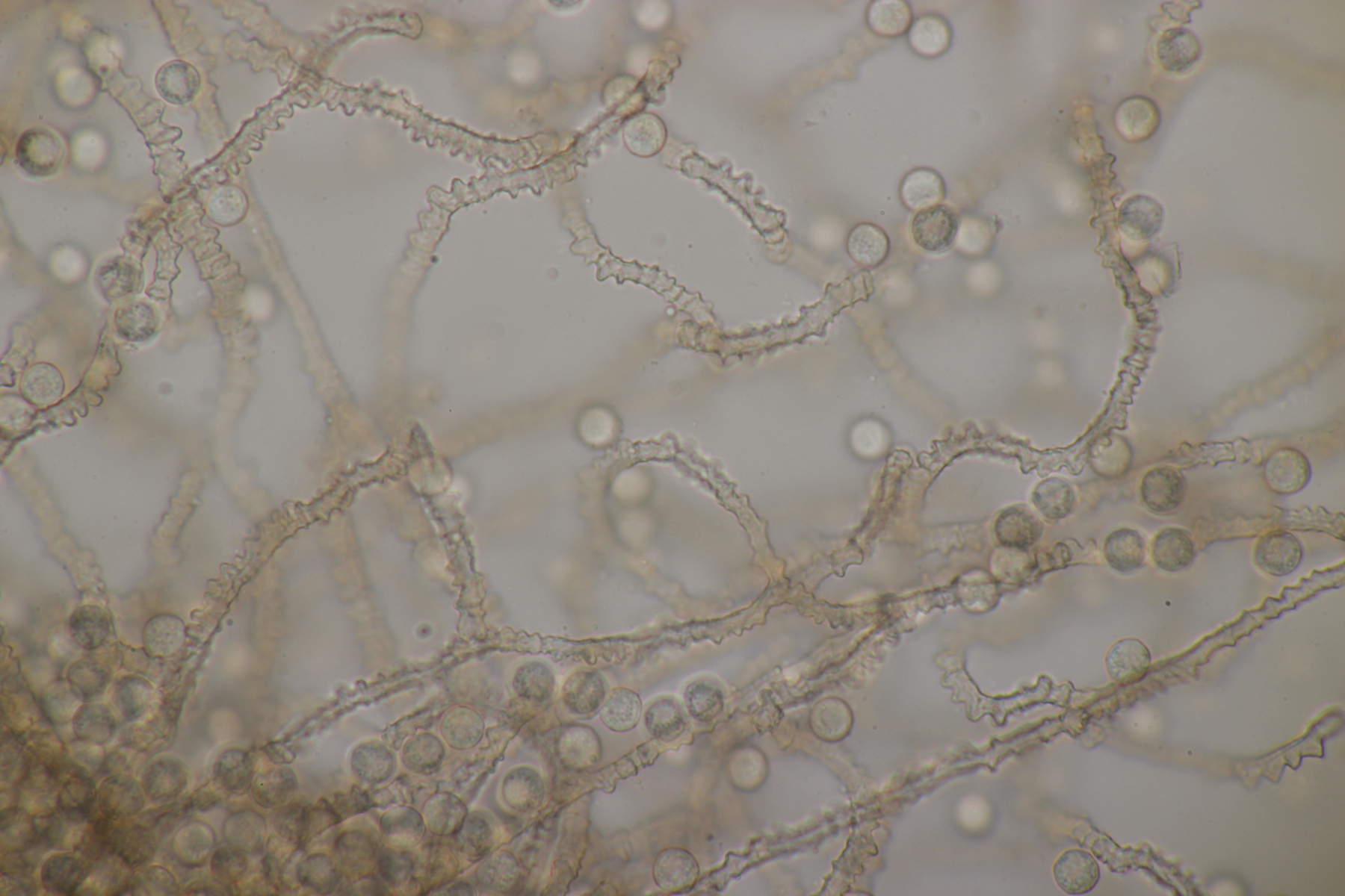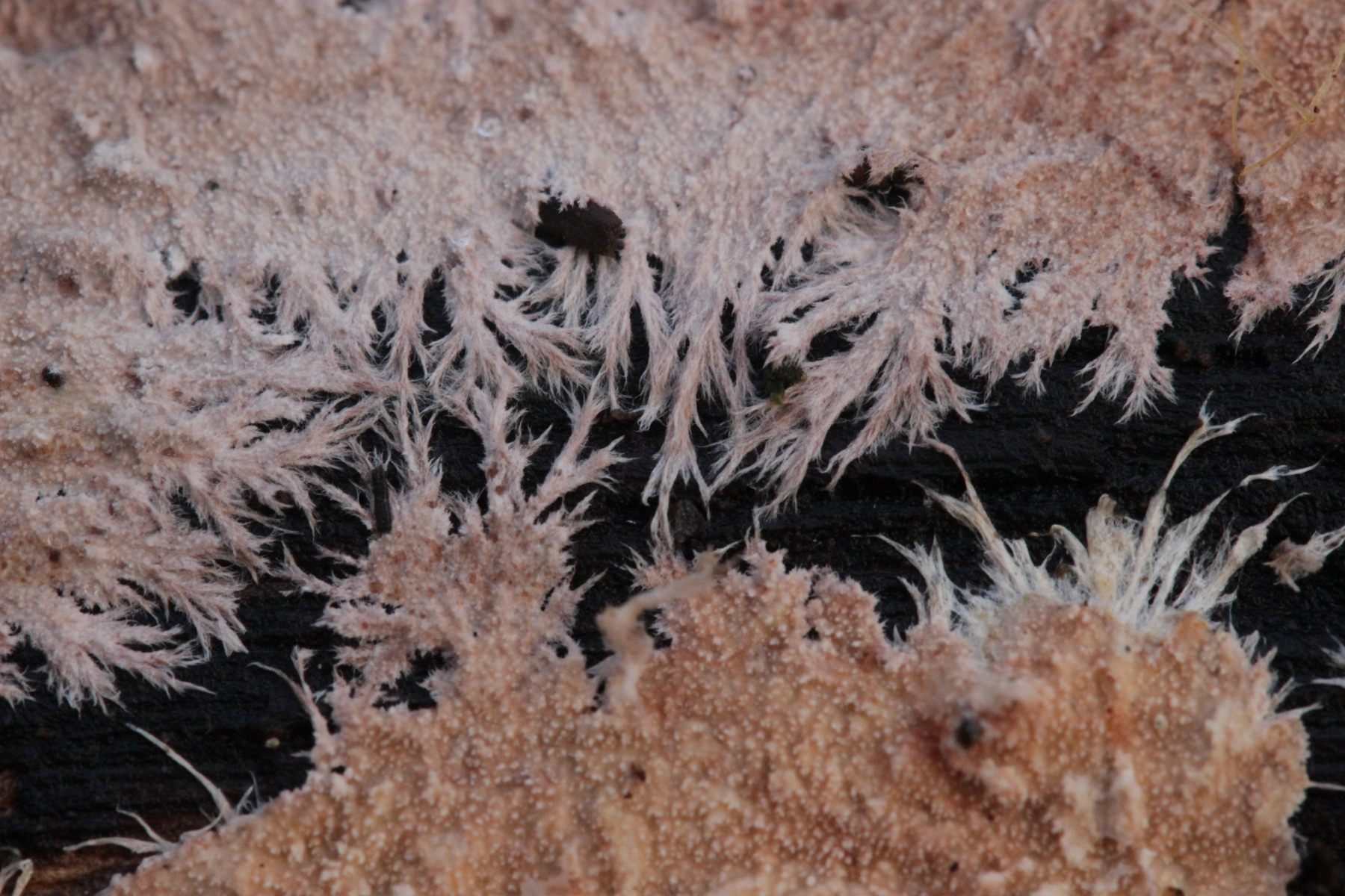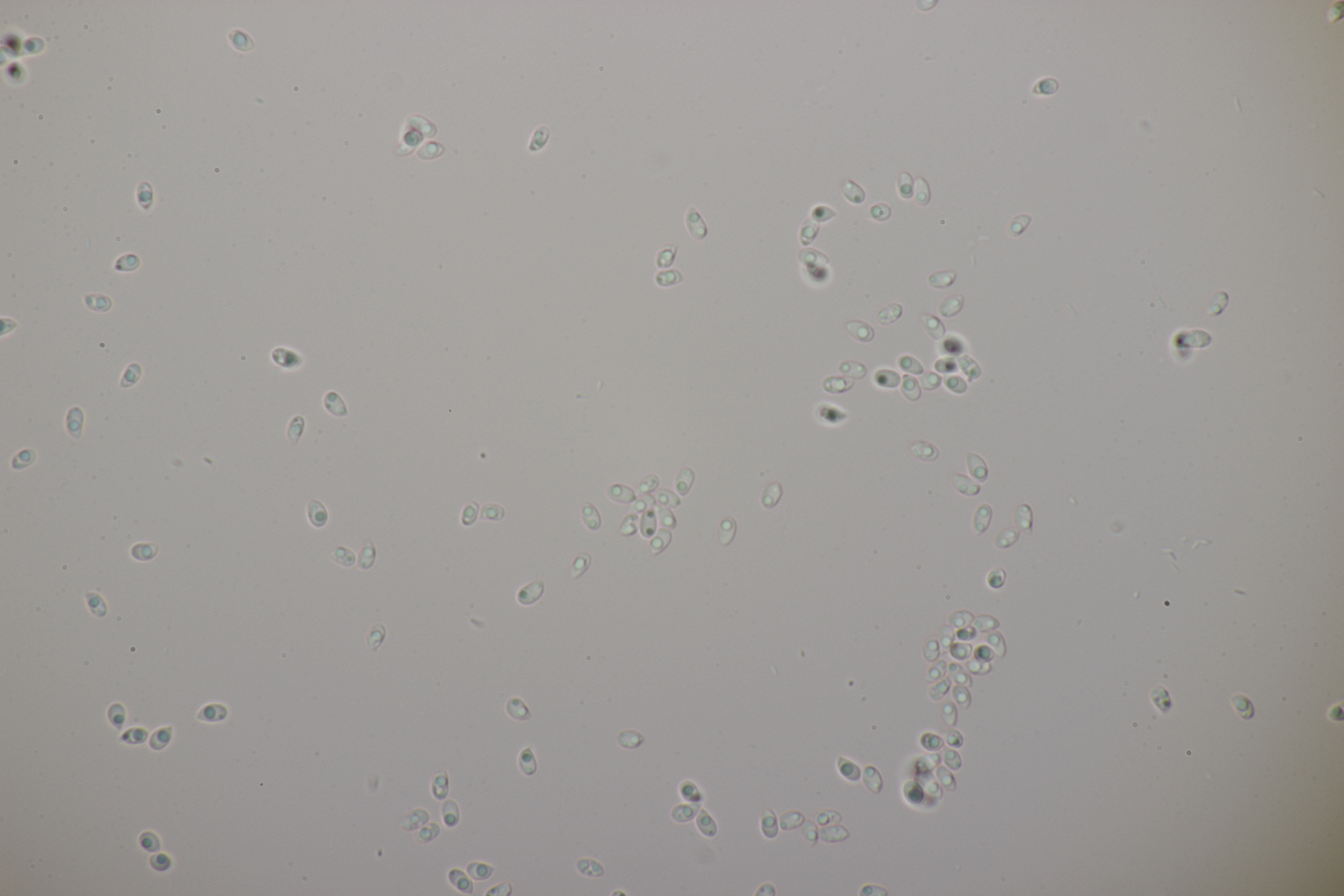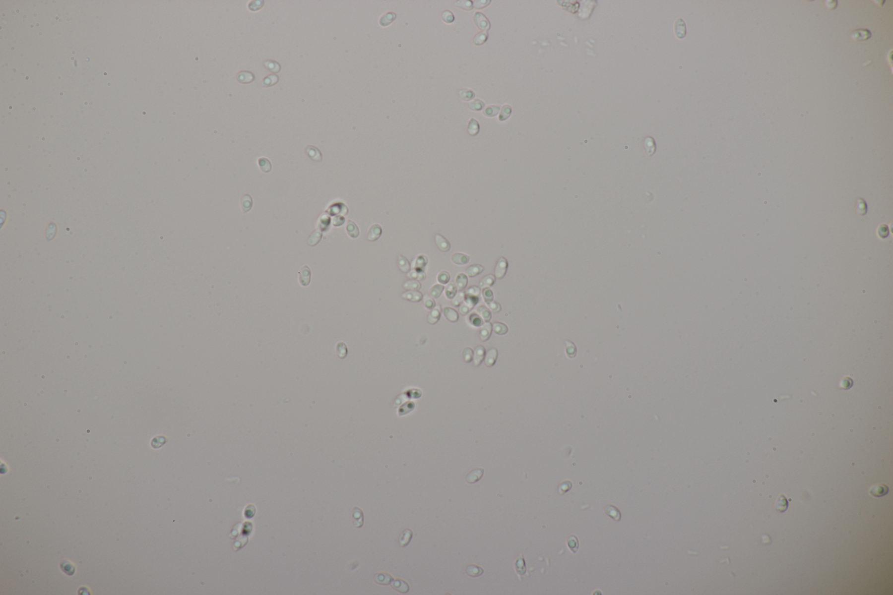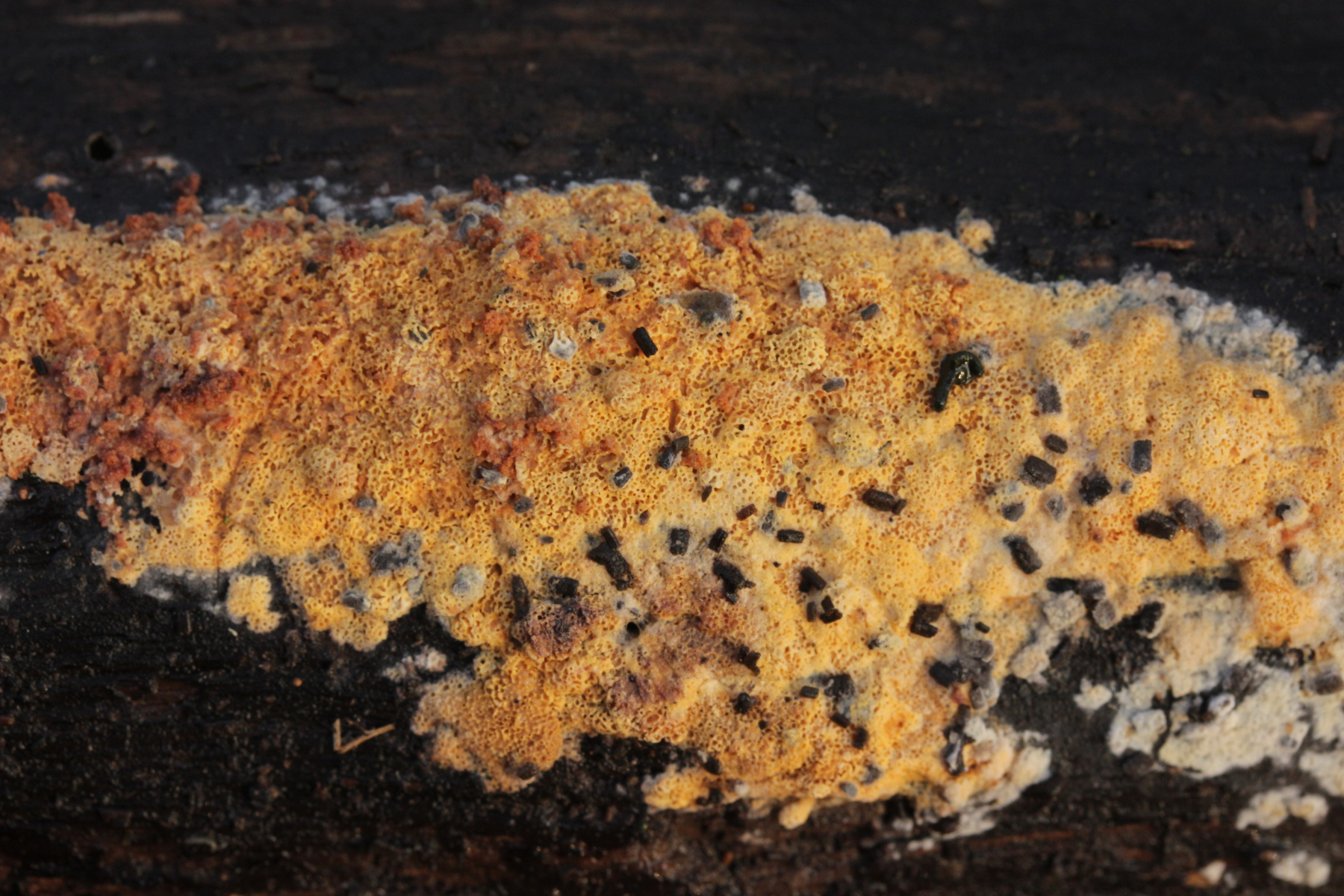 4. Ein Porling... aber diesmal immerhin mit Sporen, die (7.4+-0.5) µm x (2.3+-0.2) µm groß sind. Das Hyphensystem scheint monomitisch zu sein, Schnallen gibt es keine. Der Fruchtkörper färbt mit 3% KOH intensiv dunkelrot. Wenn man beim Mikroskopieren KOH zugibt, entfärbt sich der Pilz. Ich würde hier zu einer Ceriporia tendieren und lande dann bei C. purpurea. Kann die farblich so orange sein?