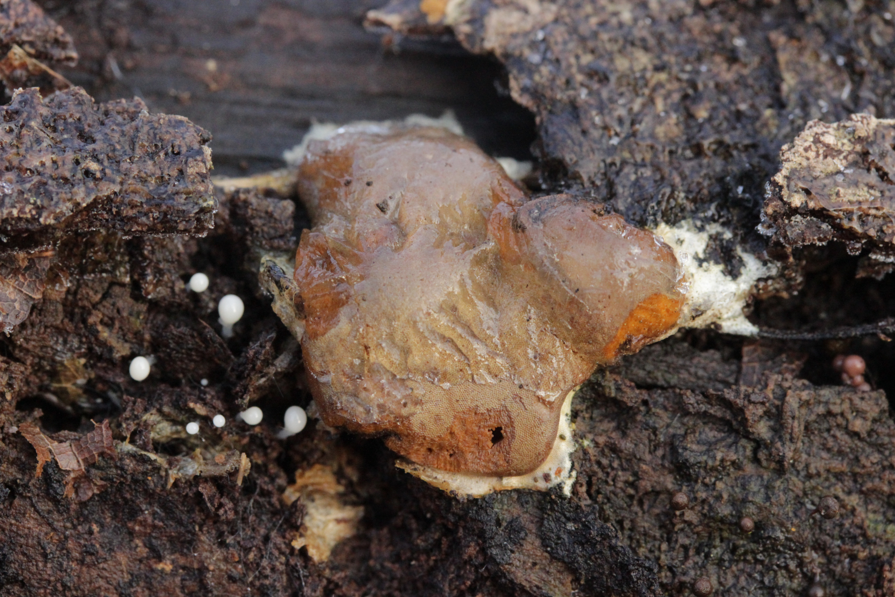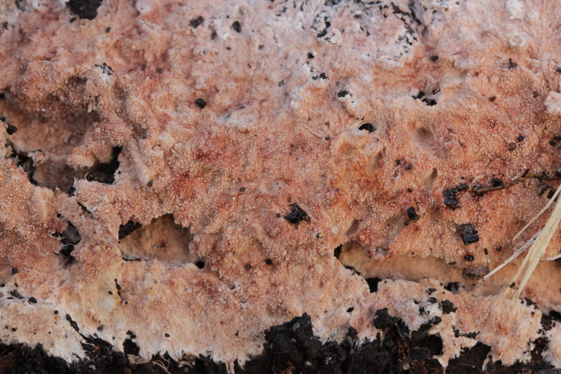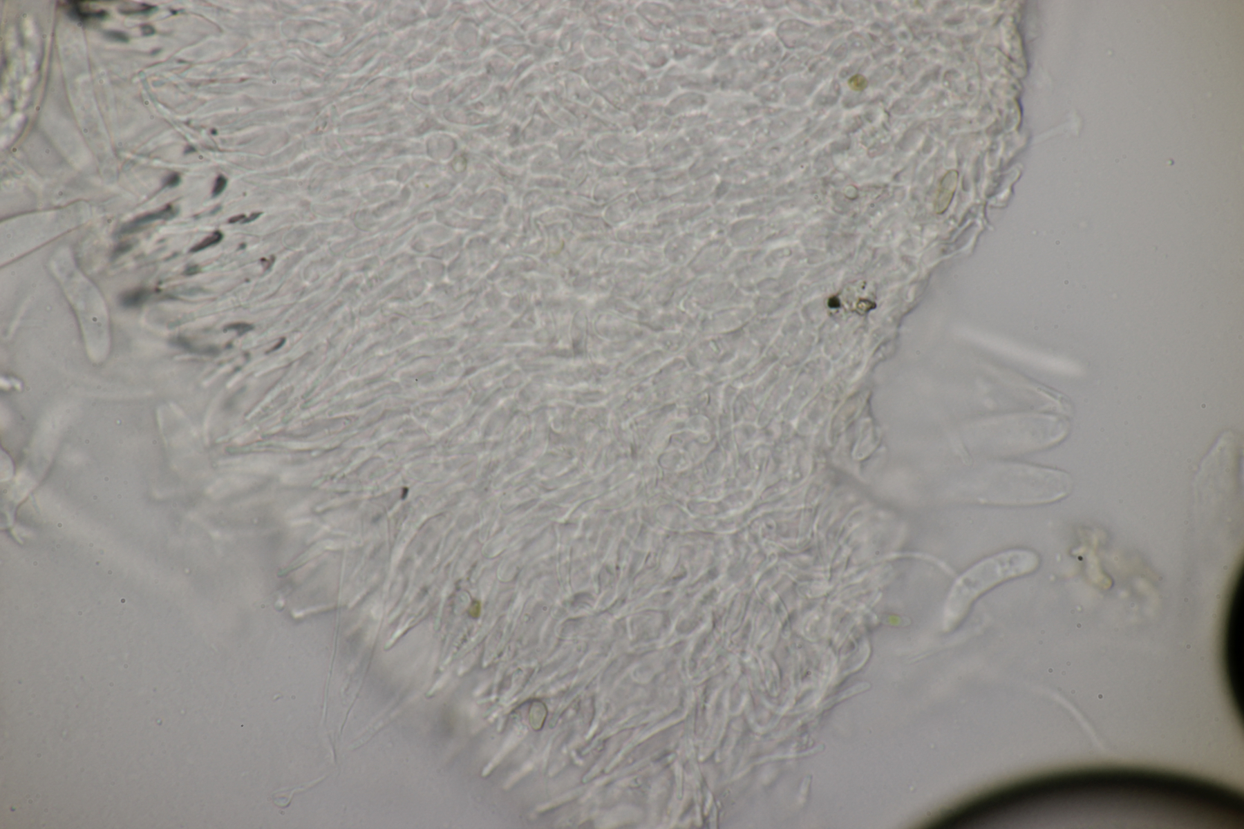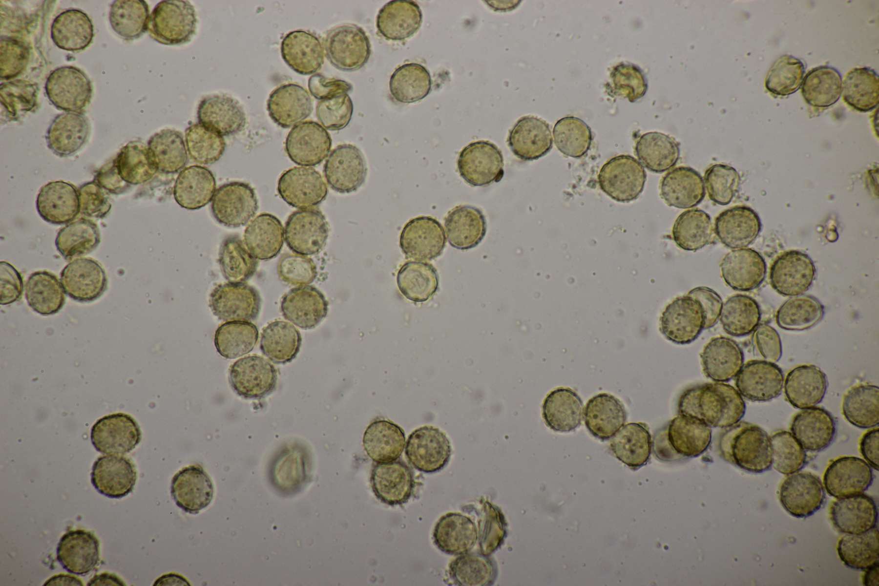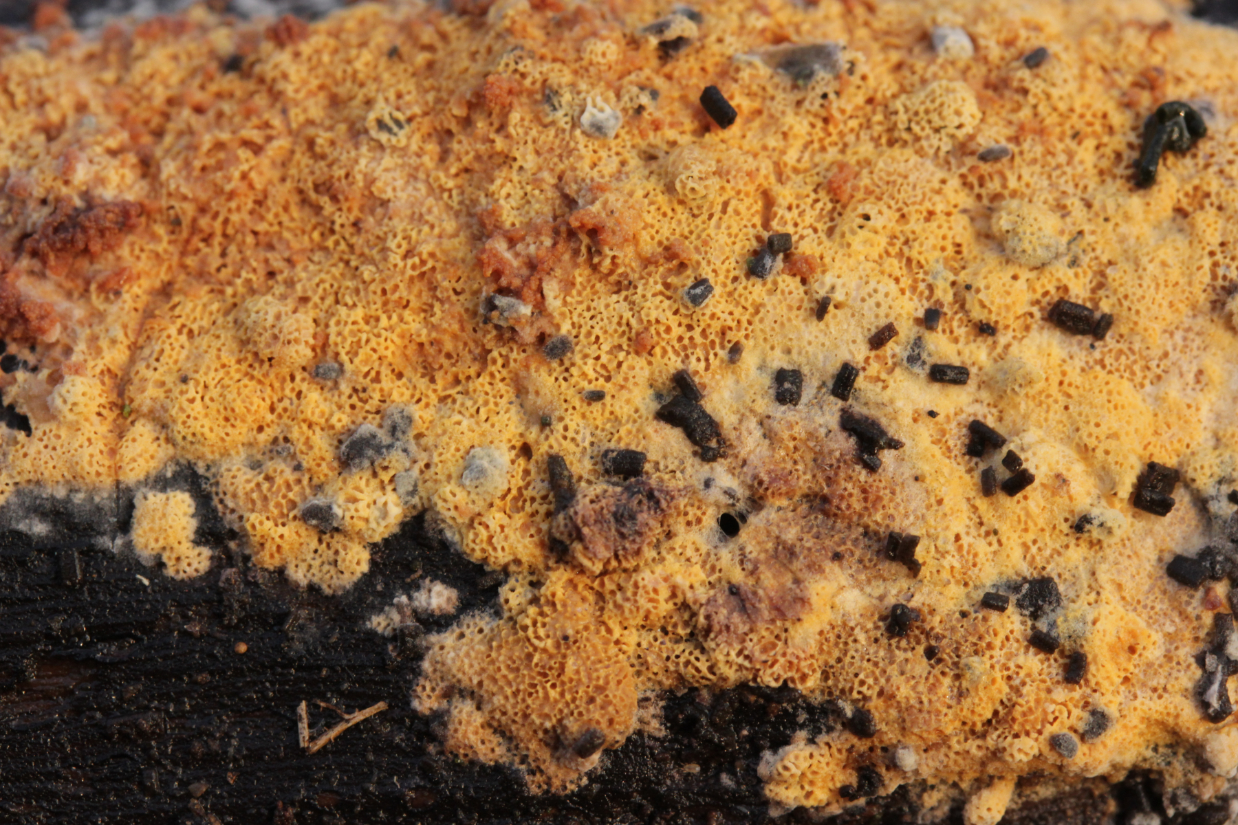 4. Ein Porling... aber diesmal immerhin mit Sporen, die (7.4+-0.5) µm x (2.3+-0.2) µm groß sind. Das Hyphensystem scheint monomitisch zu sein, Schnallen gibt es keine. Der Fruchtkörper färbt mit 3% KOH intensiv dunkelrot. Wenn man beim Mikroskopieren KOH zugibt, entfärbt sich der Pilz. Ich würde hier zu einer Ceriporia tendieren und lande dann bei C. purpurea. Kann die farblich so orange sein?