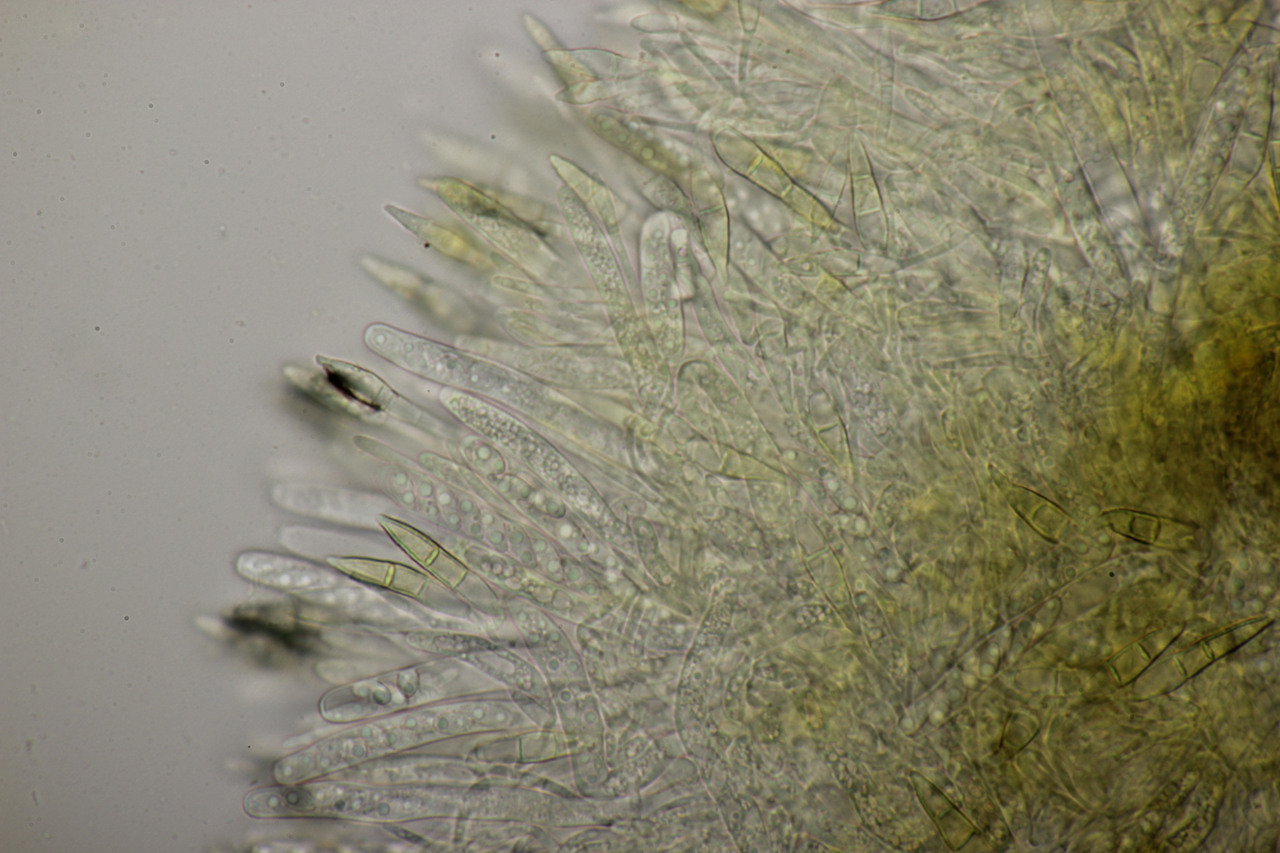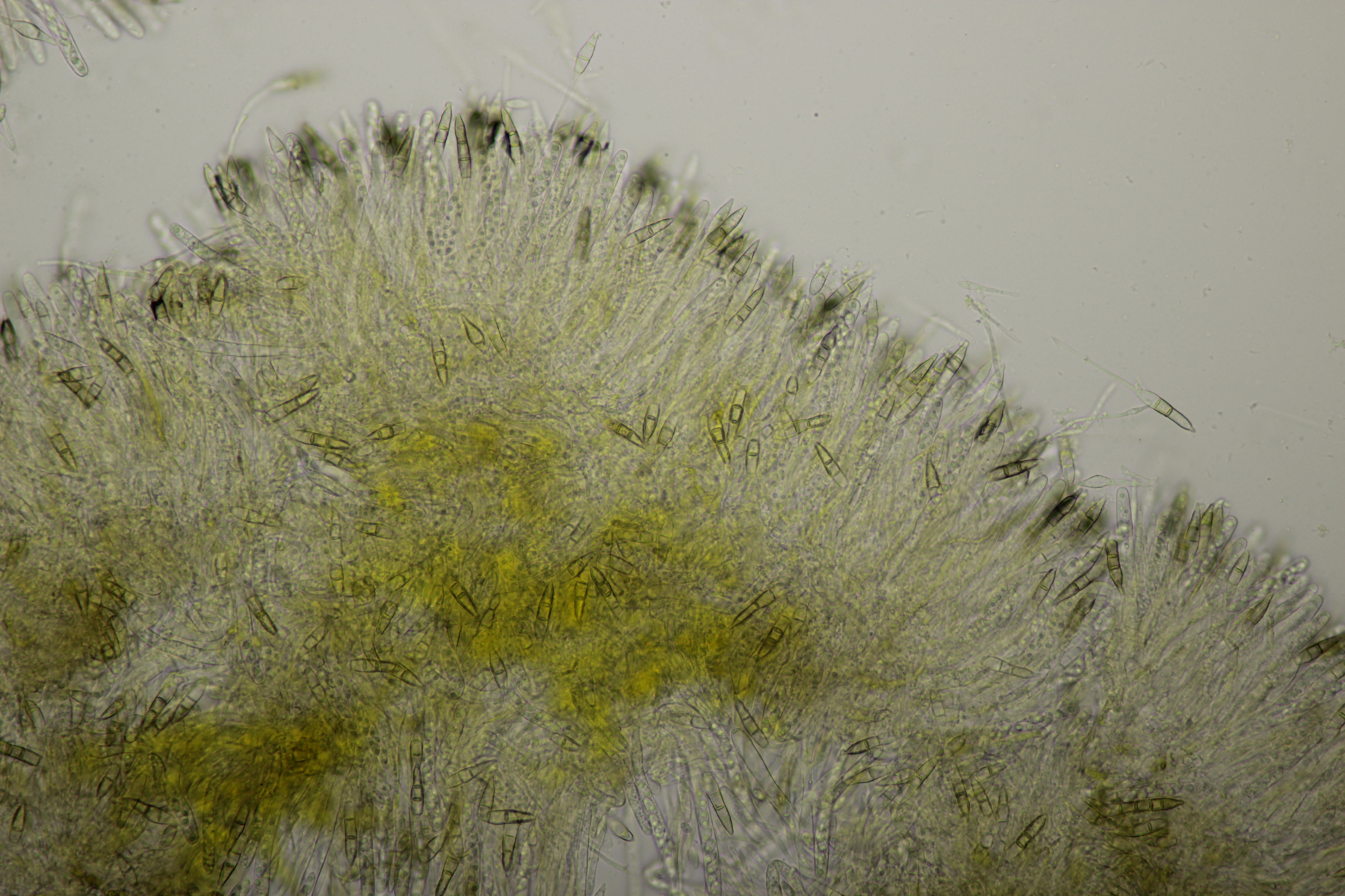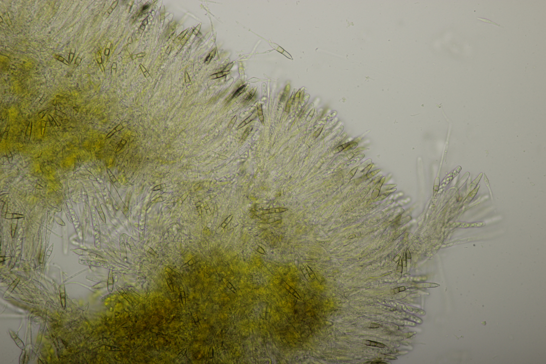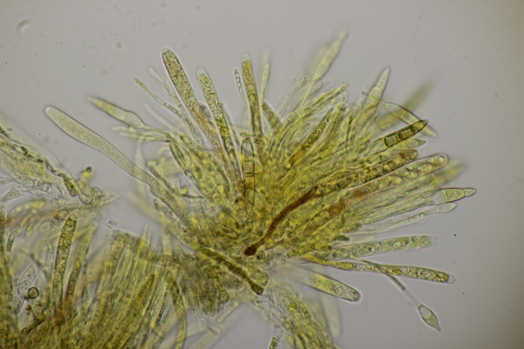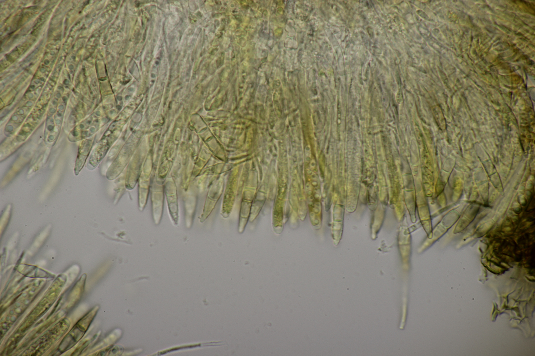 7. Dann gab es diesen grünen Becher an Laubholz. Ideen habe ich da auch keine, aber auffällig waren Strukturen, die mich an Rostpilzsporen erinnern. Ist der Pilz mit etwas anderem befallen? EDIT: Es handelt sich um Diplocarpa bloxamii, einen scheinbar eher seltenen Ascomyceten. Auffällig war hier noch, daß er zwischen Armillaria-Rhizomorphen wuchs (fürs Foto entfernt), was wohl relativ charakteristisch für die Art ist.