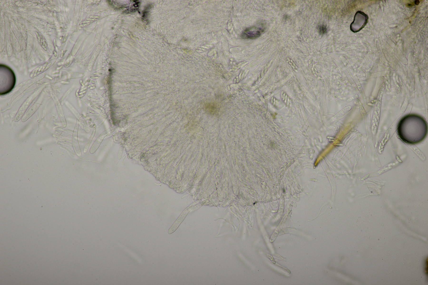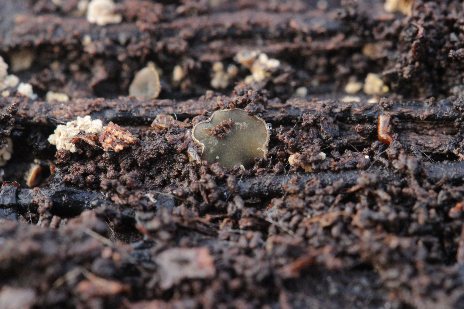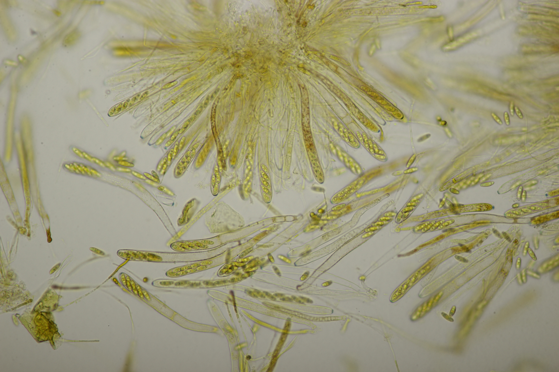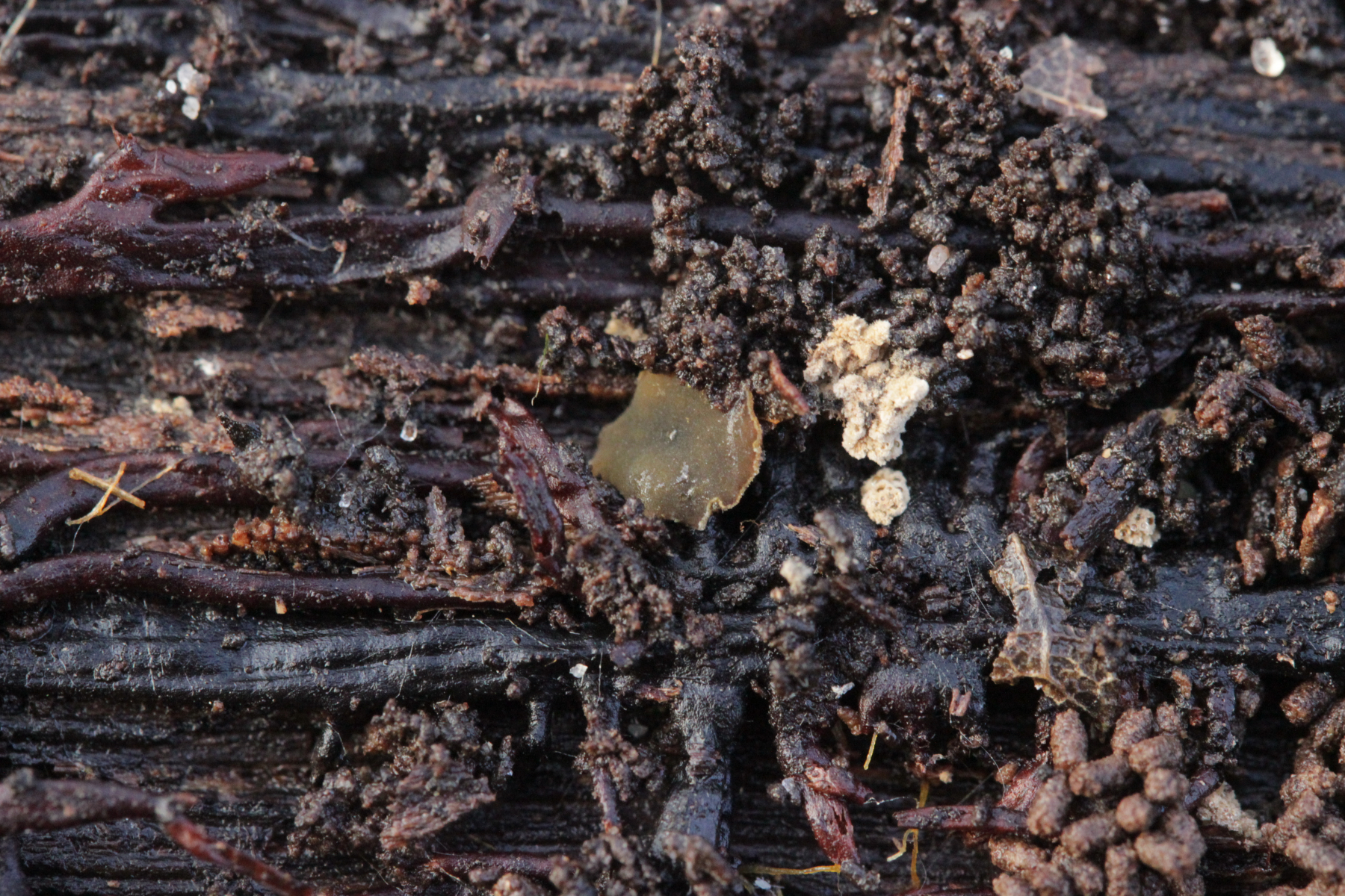 7. Dann gab es diesen grünen Becher an Laubholz. Ideen habe ich da auch keine, aber auffällig waren Strukturen, die mich an Rostpilzsporen erinnern. Ist der Pilz mit etwas anderem befallen? EDIT: Es handelt sich um Diplocarpa bloxamii, einen scheinbar eher seltenen Ascomyceten. Auffällig war hier noch, daß er zwischen Armillaria-Rhizomorphen wuchs (fürs Foto entfernt), was wohl relativ charakteristisch für die Art ist.