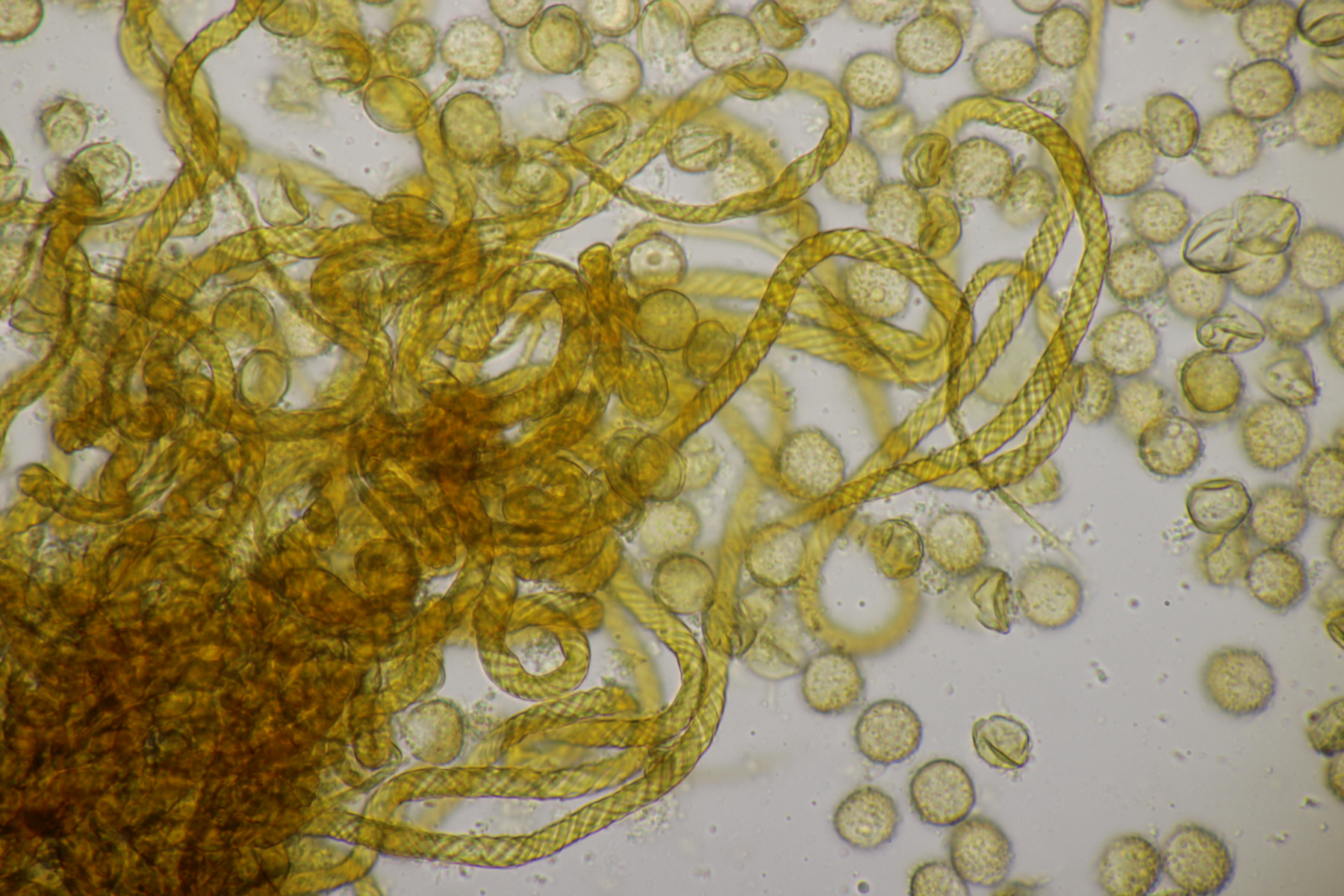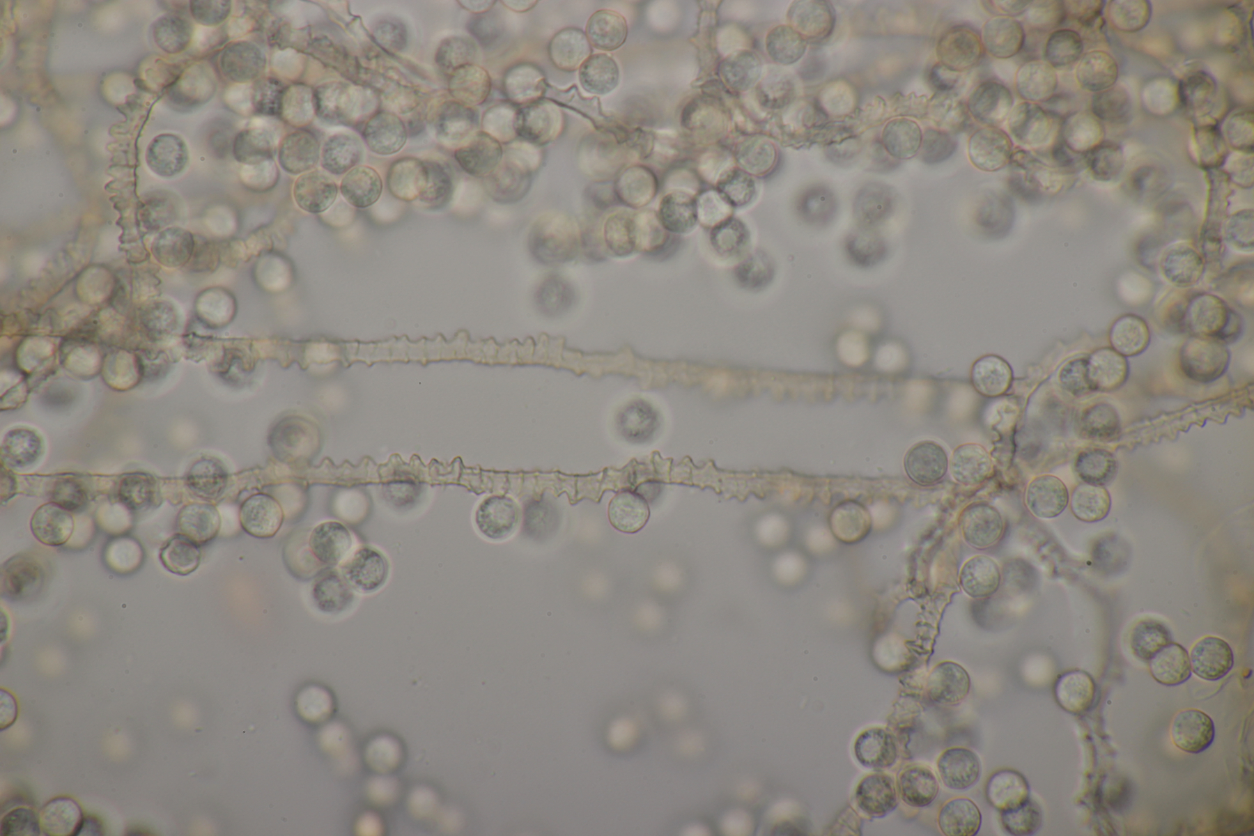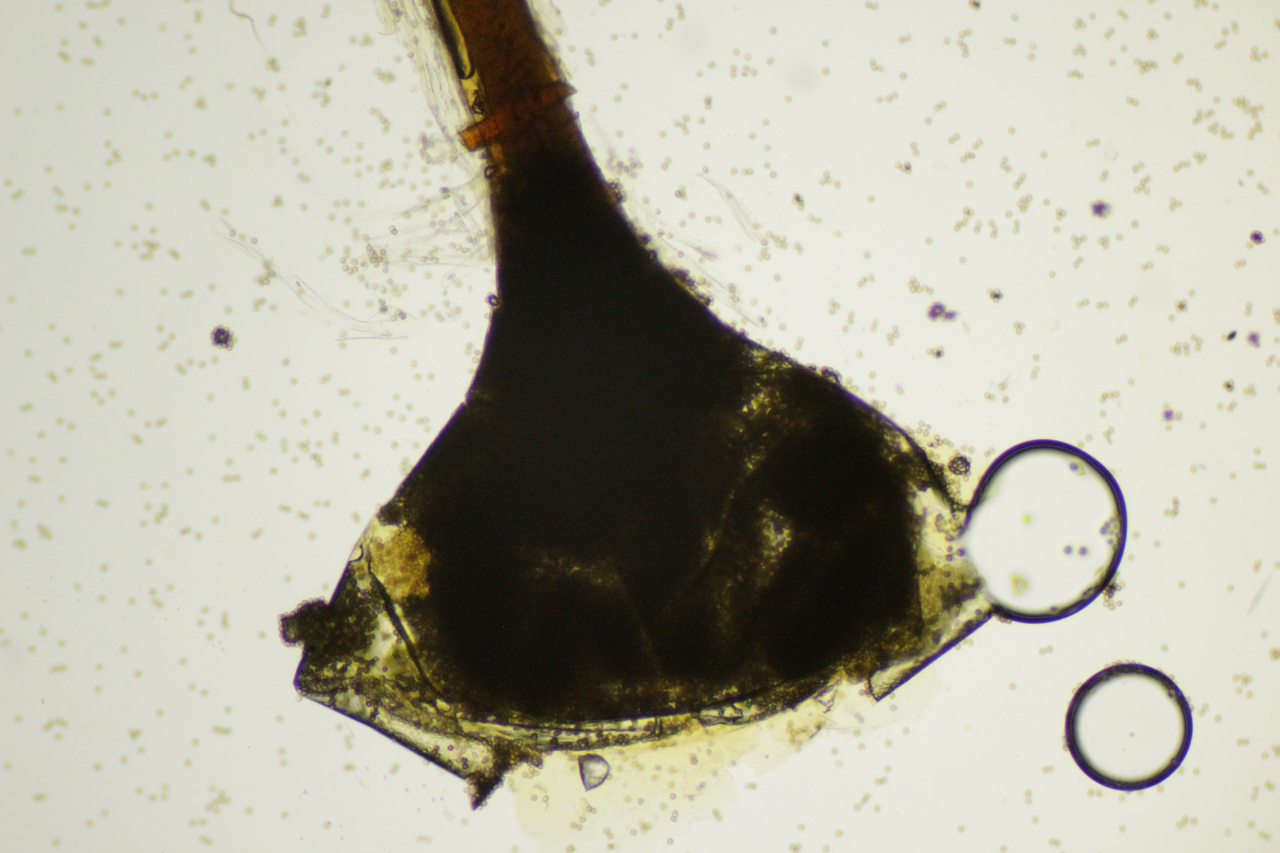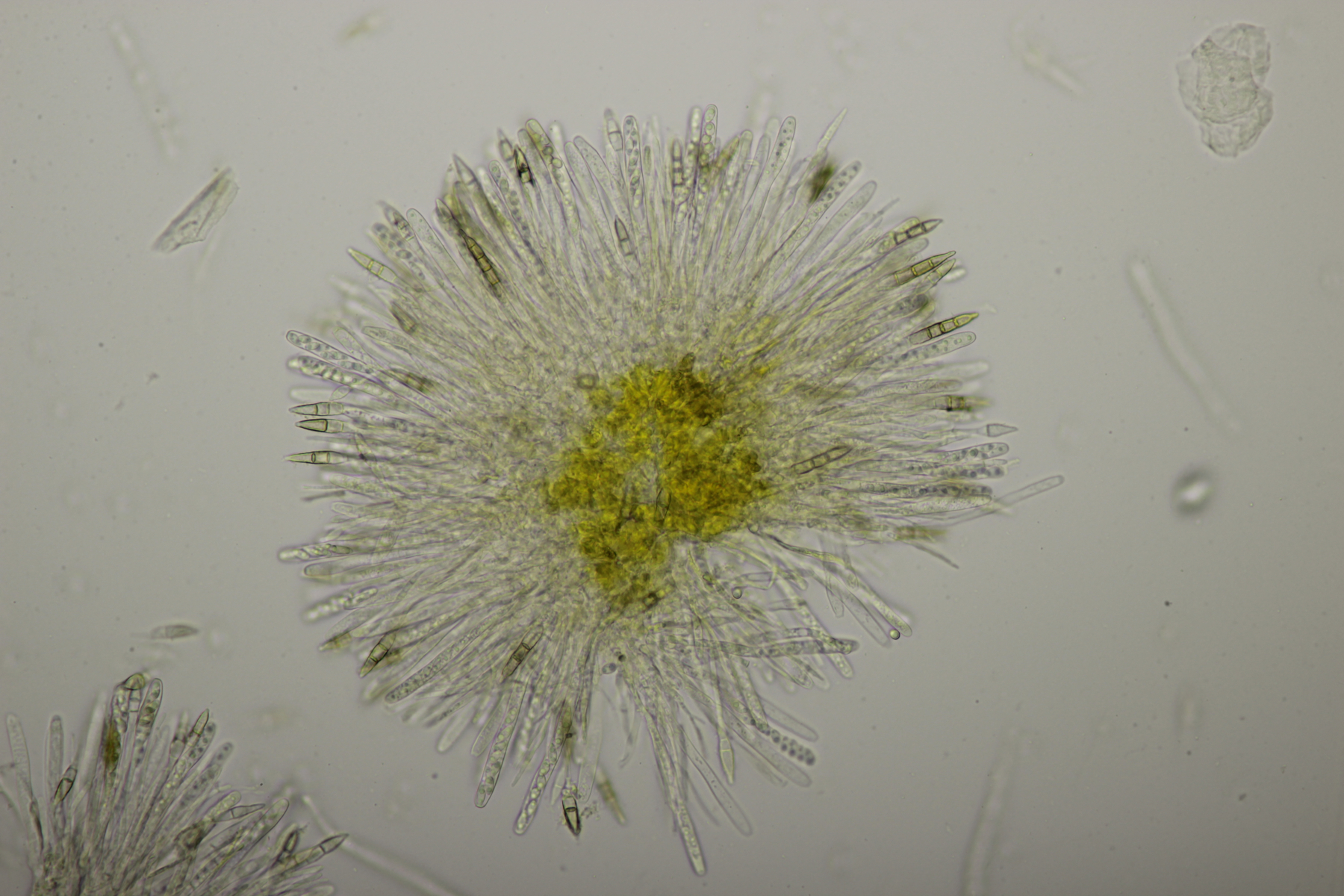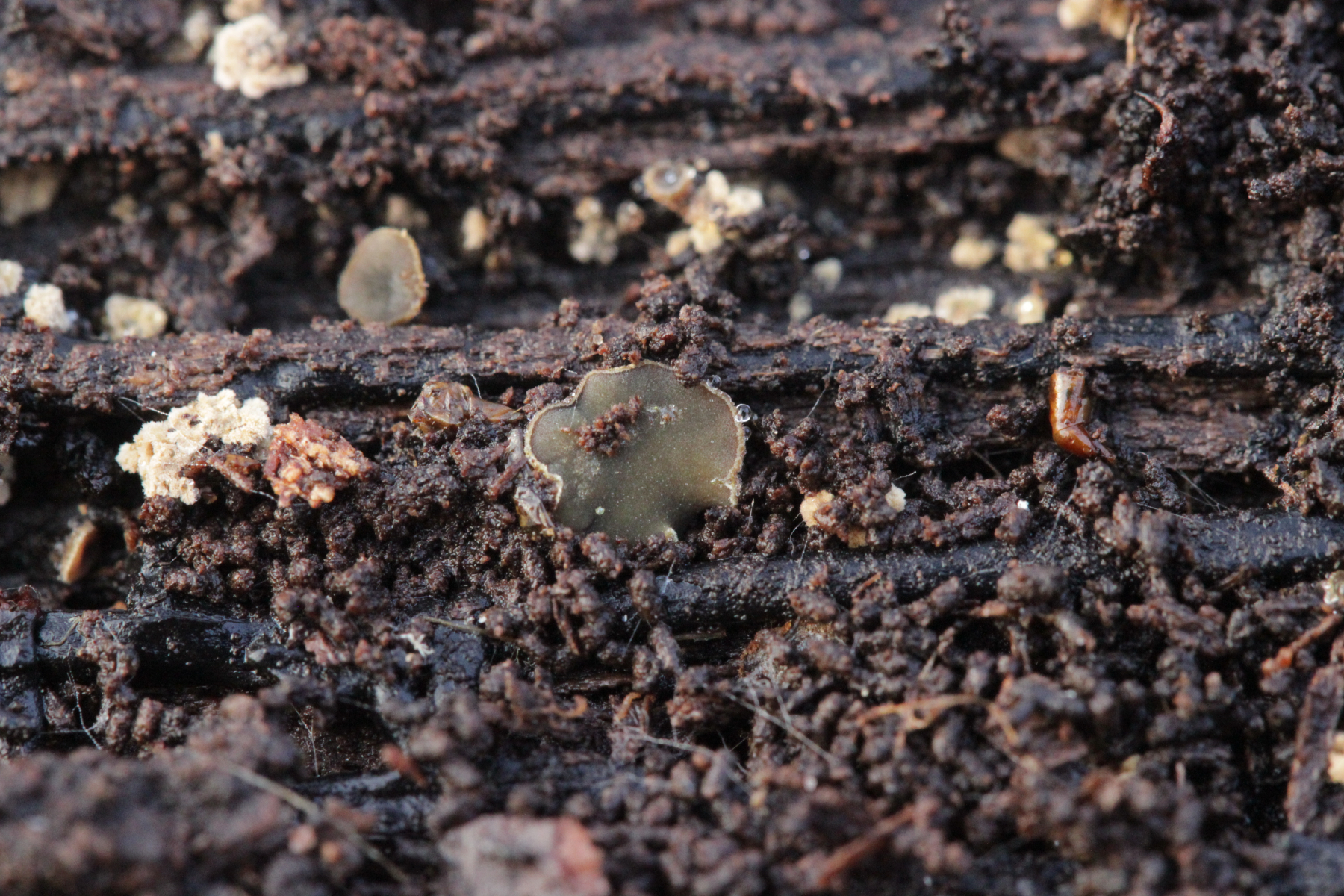 7. Dann gab es diesen grünen Becher an Laubholz. Ideen habe ich da auch keine, aber auffällig waren Strukturen, die mich an Rostpilzsporen erinnern. Ist der Pilz mit etwas anderem befallen? EDIT: Es handelt sich um Diplocarpa bloxamii, einen scheinbar eher seltenen Ascomyceten. Auffällig war hier noch, daß er zwischen Armillaria-Rhizomorphen wuchs (fürs Foto entfernt), was wohl relativ charakteristisch für die Art ist.