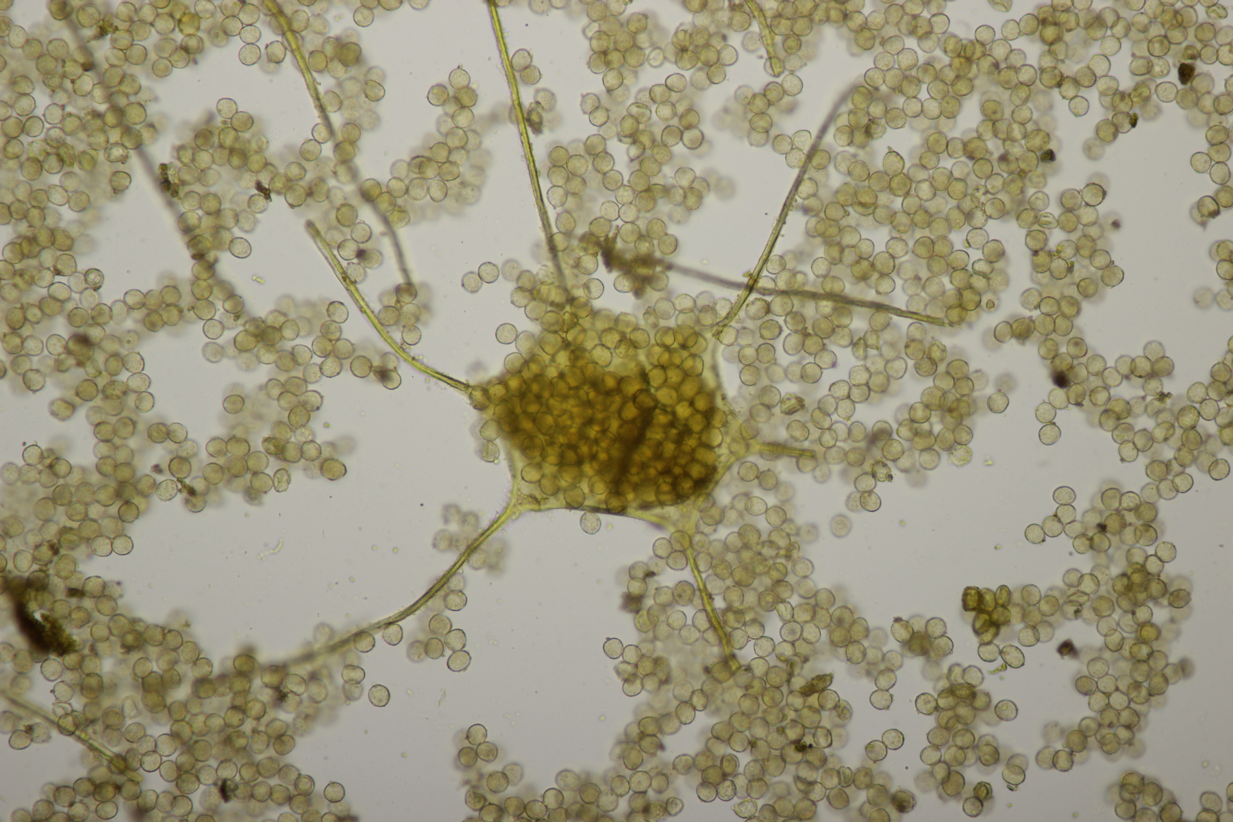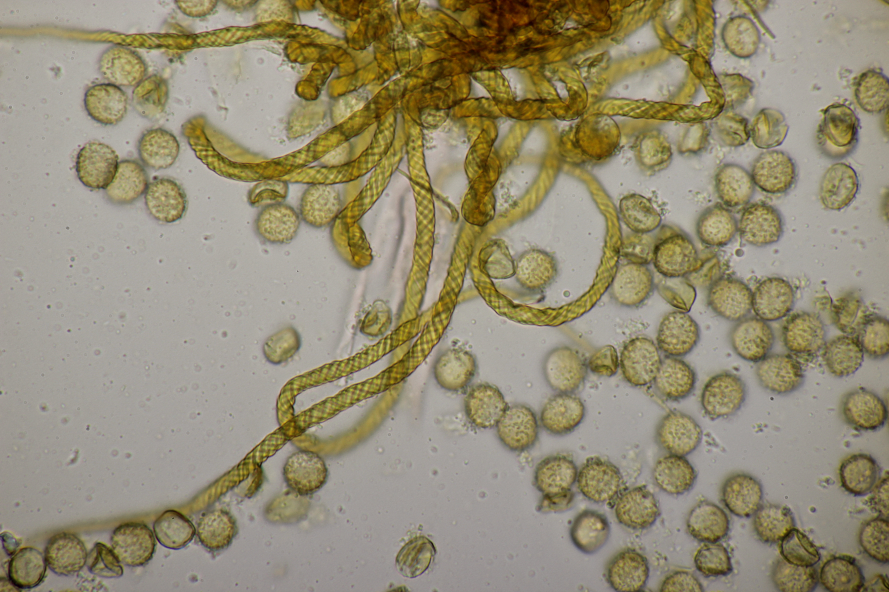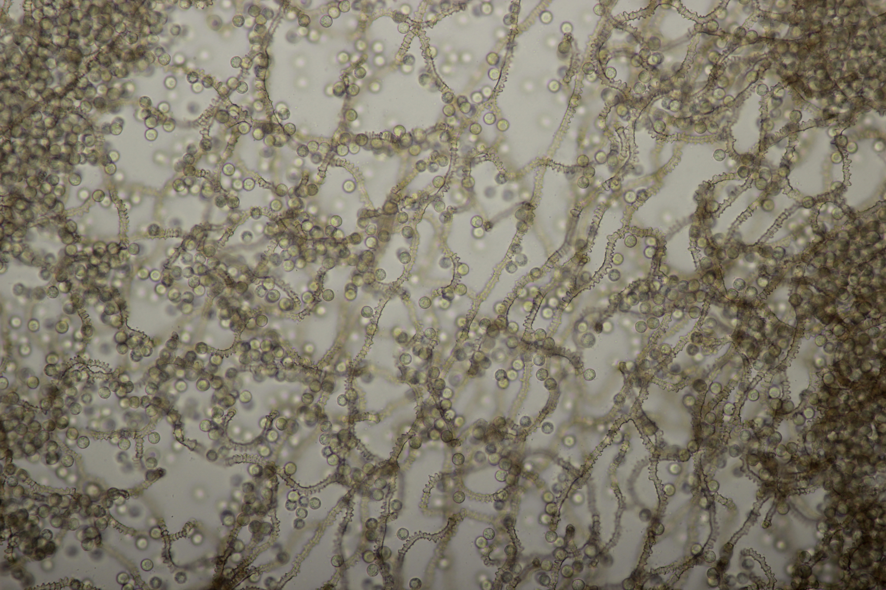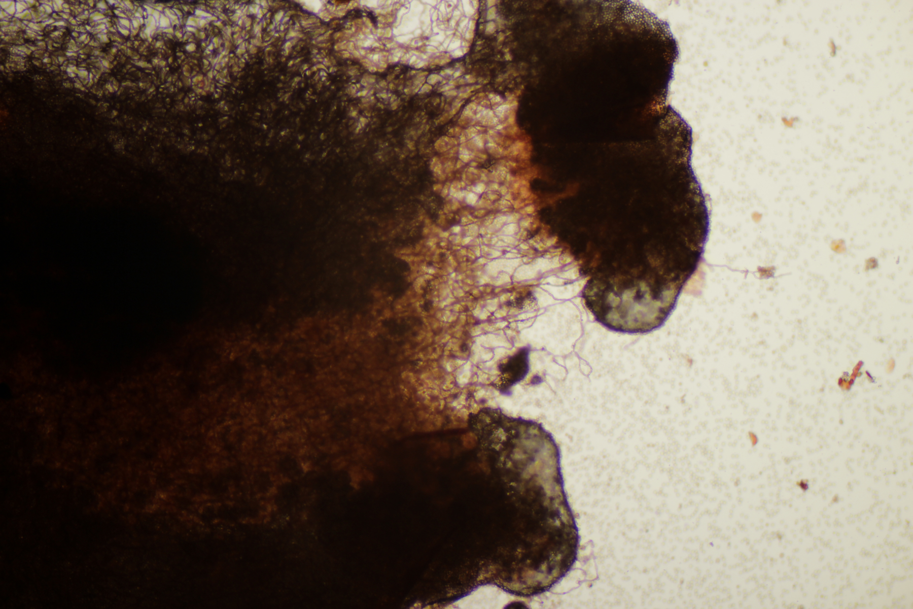 7. Dann gab es diesen grünen Becher an Laubholz. Ideen habe ich da auch keine, aber auffällig waren Strukturen, die mich an Rostpilzsporen erinnern. Ist der Pilz mit etwas anderem befallen? EDIT: Es handelt sich um Diplocarpa bloxamii, einen scheinbar eher seltenen Ascomyceten. Auffällig war hier noch, daß er zwischen Armillaria-Rhizomorphen wuchs (fürs Foto entfernt), was wohl relativ charakteristisch für die Art ist.