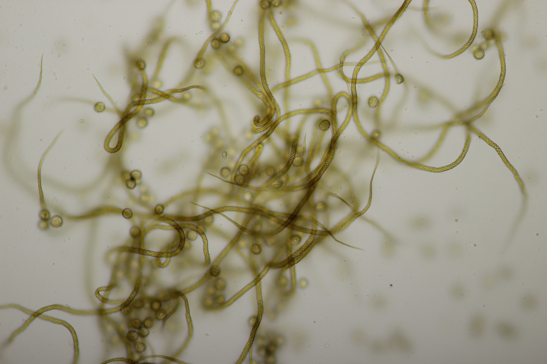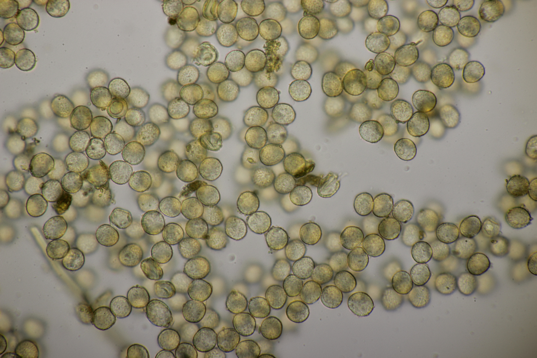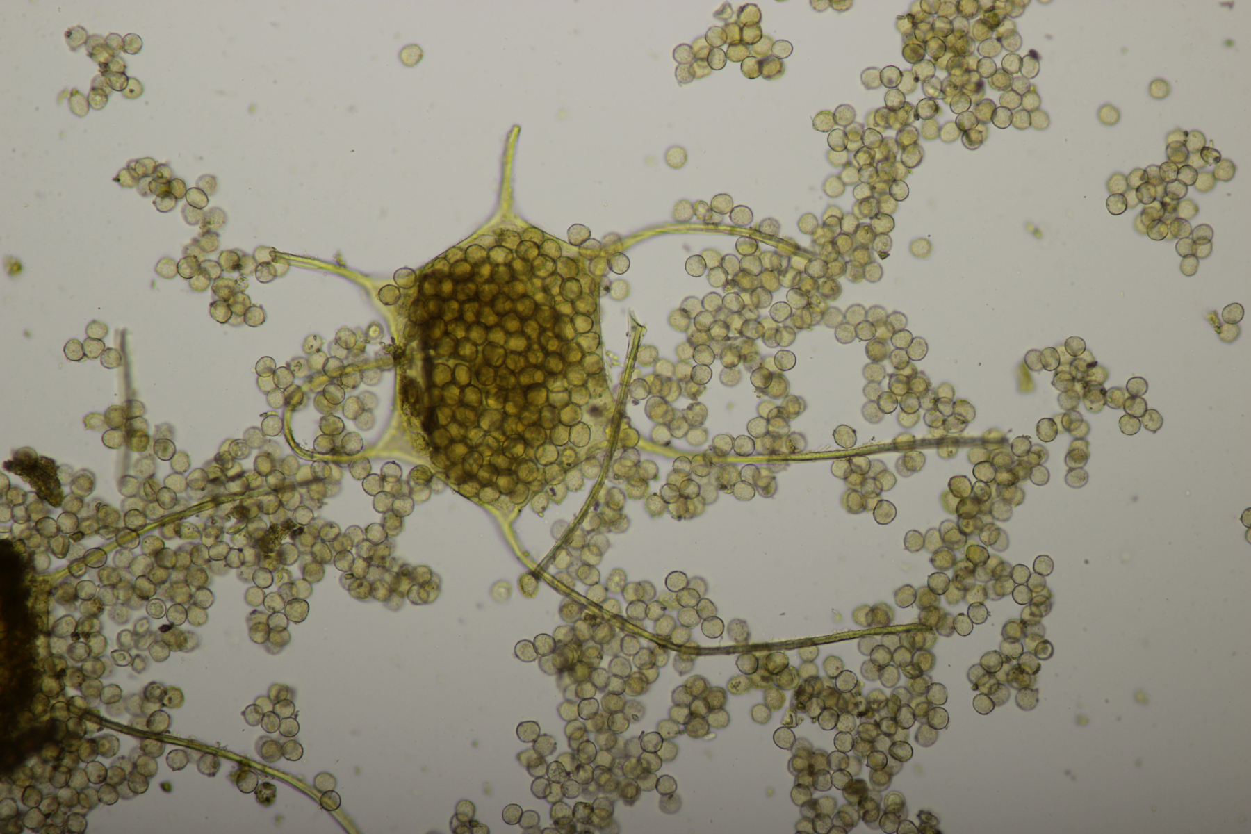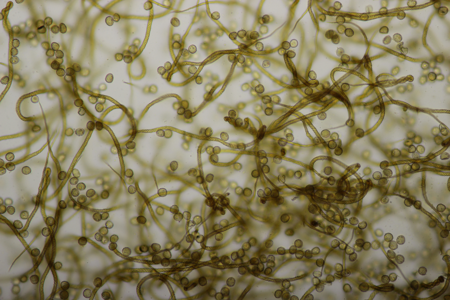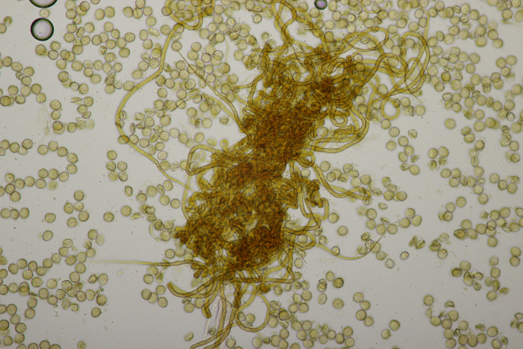 7. Dann gab es diesen grünen Becher an Laubholz. Ideen habe ich da auch keine, aber auffällig waren Strukturen, die mich an Rostpilzsporen erinnern. Ist der Pilz mit etwas anderem befallen? EDIT: Es handelt sich um Diplocarpa bloxamii, einen scheinbar eher seltenen Ascomyceten. Auffällig war hier noch, daß er zwischen Armillaria-Rhizomorphen wuchs (fürs Foto entfernt), was wohl relativ charakteristisch für die Art ist.