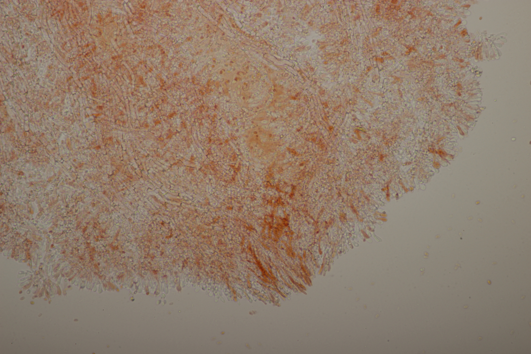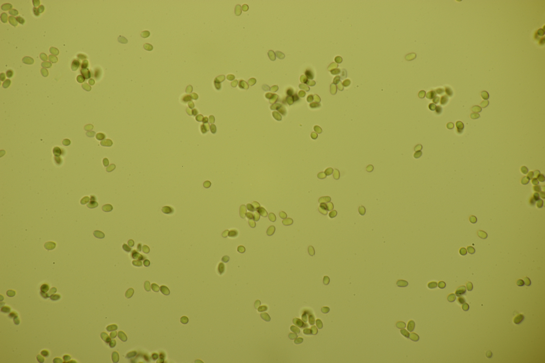 13. Sporengröße (4.6+-0.3) µm x (2.8+-0.3) µm, Sporen amyloid (im Mikrobild nicht so gut zu erkennen, bei der Sporenmasse makroskopisch aber eindeutig), auf Kiefer. Damit würde ich zu Mucronella calva tendieren (M. flava müßte noch gelber sein?).