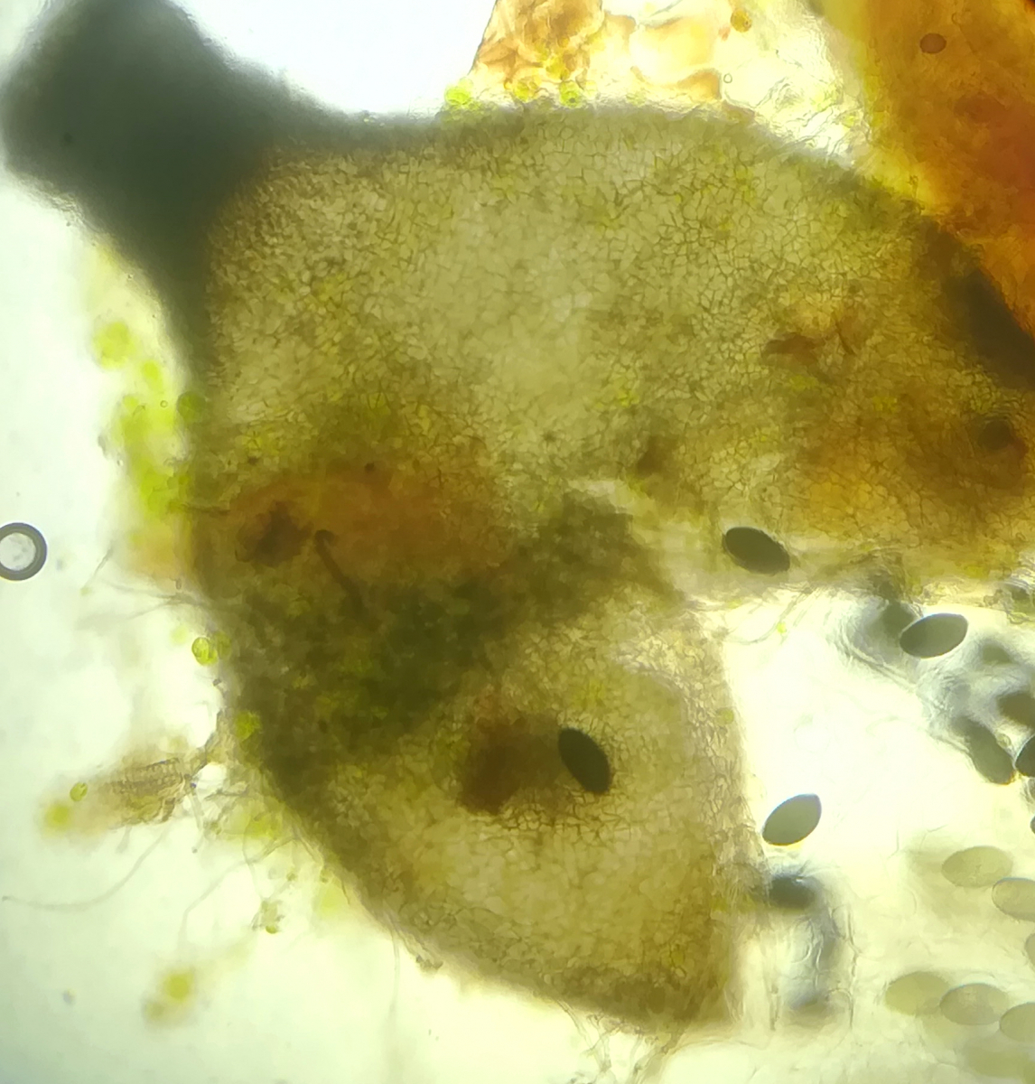 - Die Sporen haben ein kurzes, breites Pedicell (16 - 19 x 6 - 8 µm) und messen 31 - 35 x 17 - 19 µm. Es scheint so, als hinge bei unreifen Sporen im Ascus eine weiteres Anhängsel am Pedicell, teilweise scheinen die Sporen auch in einer Art Gelhülle zu stecken, die an der flacheren Sporenseite etwas absteht, ich konnte das leider nicht ordentlich darstellen.