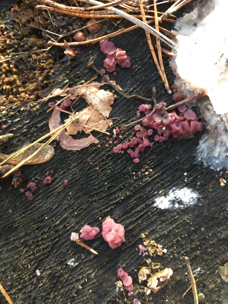 Pilz 2 am selben Stubben wie Pilz 1 evtl. ein "violetter" Gallertbecher (Ascocoryne spec.), ohne weiter ins Detail zu gehen