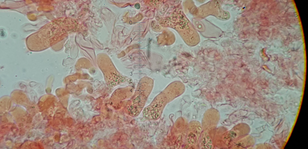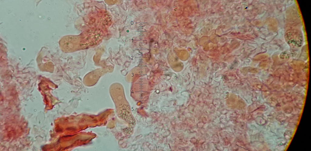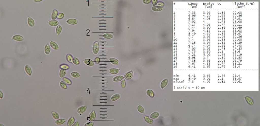 Laut Corticiaceae s.l. ist die Länge der Basidien ein guter Trennung Merkmal, (A.p. 20-25 und A.s. 8-15). Die Länge in meinem Fund übersteigen alle die 15 µm sozwischen 18 und 25.