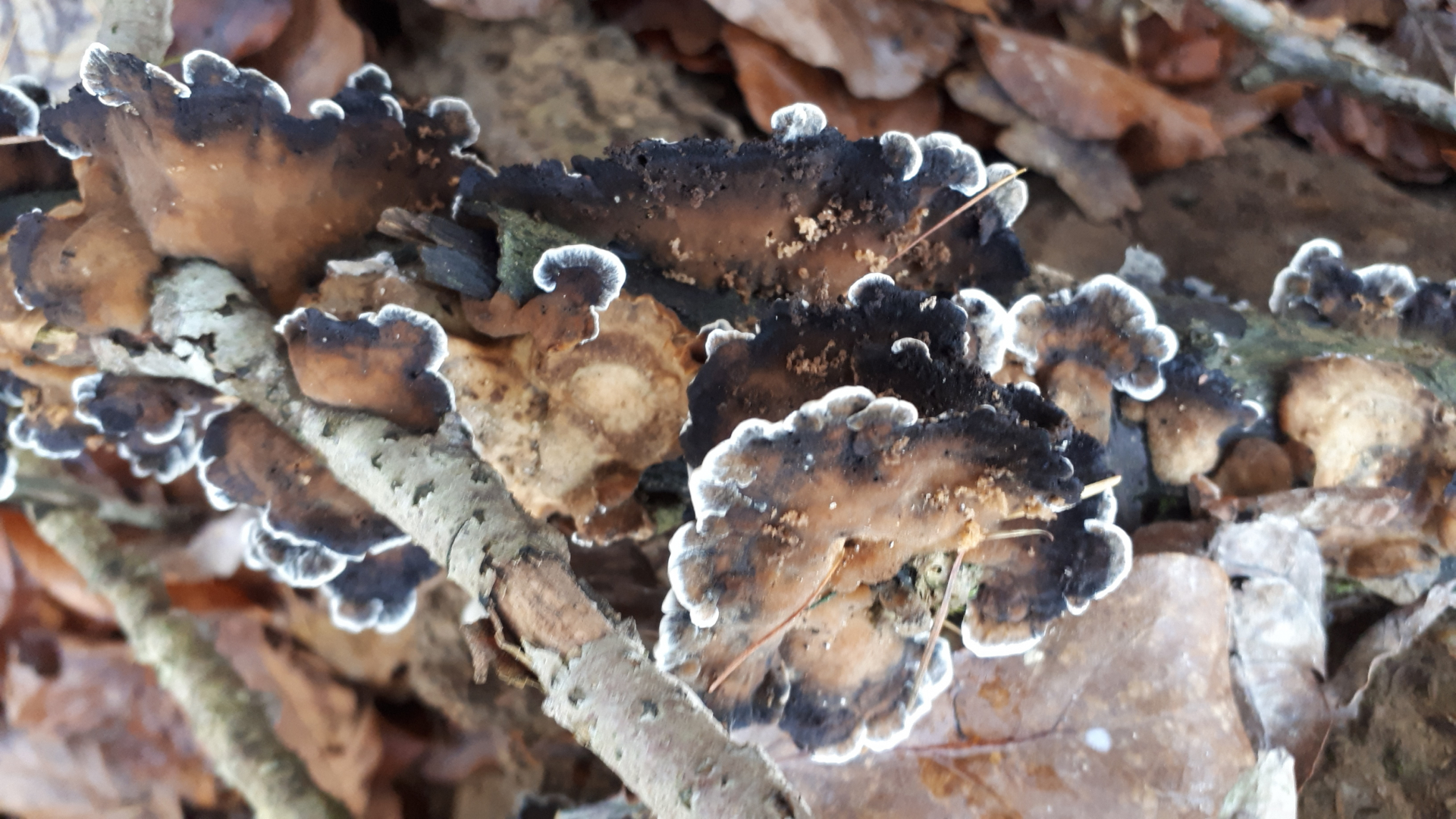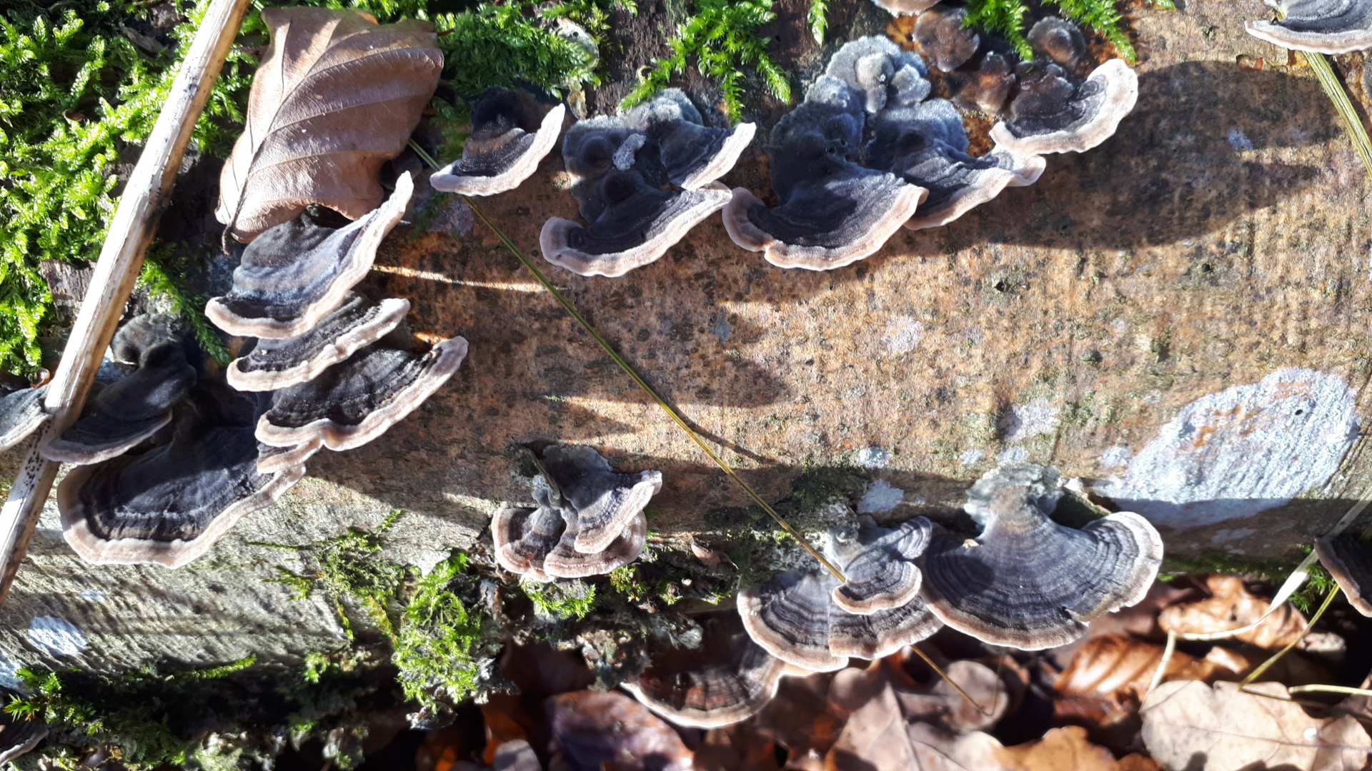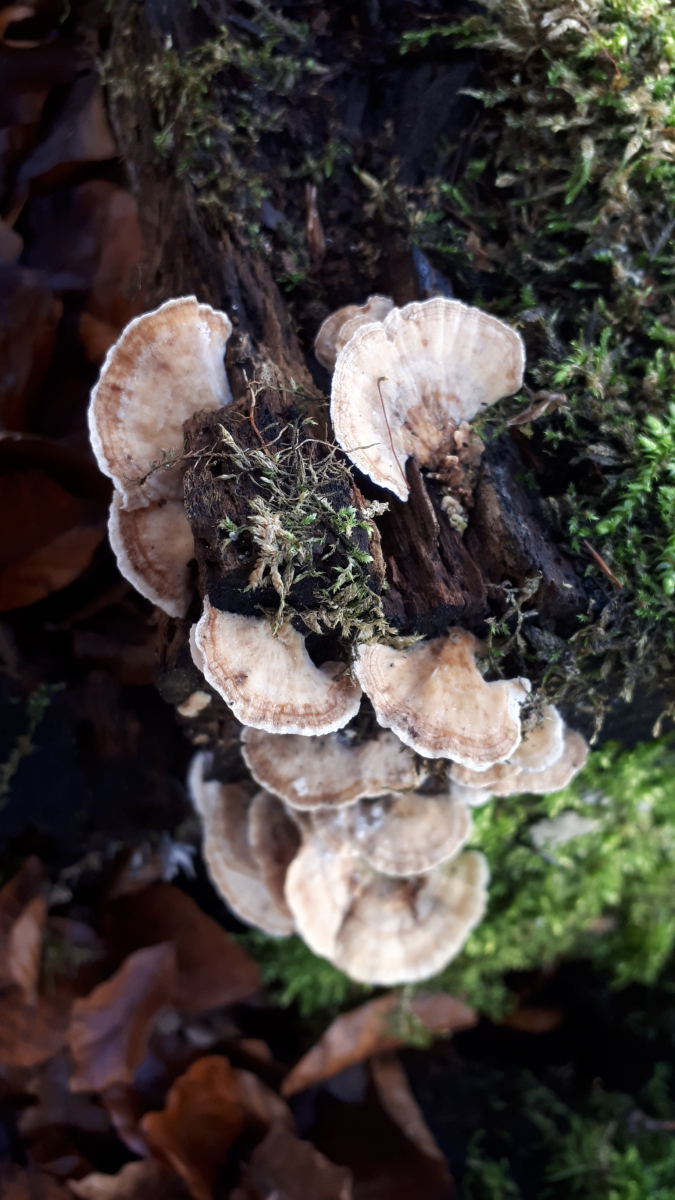 die größere weißliche Tramete mit den etwas langgestreckten Poren zwischen den Schmetterlingen (die Bilder sind etwas durcheinander geraten) ist eine Buckeltramete.