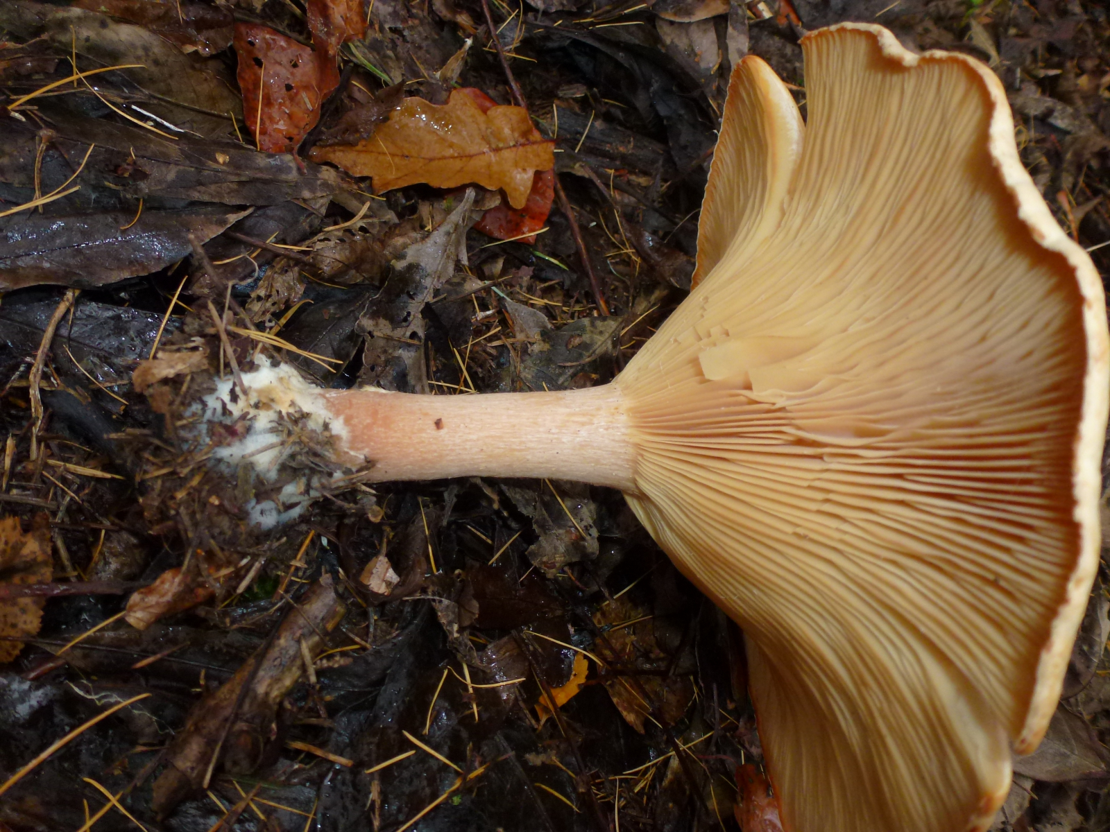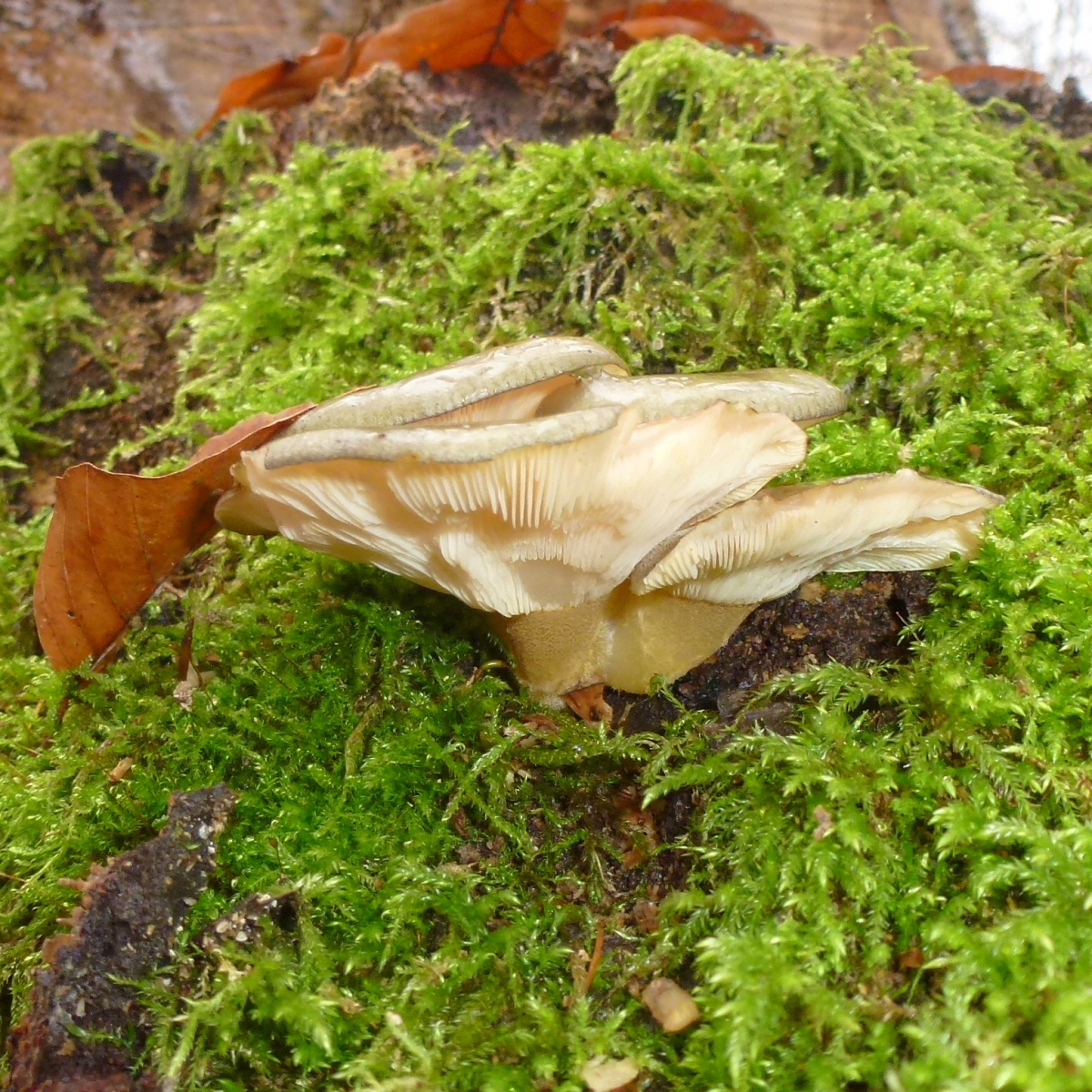 05. Gelbstieliger Muschelseitling, Sarcomyxa serotina am gleichen Stamm, jedoch am anderen Ende.