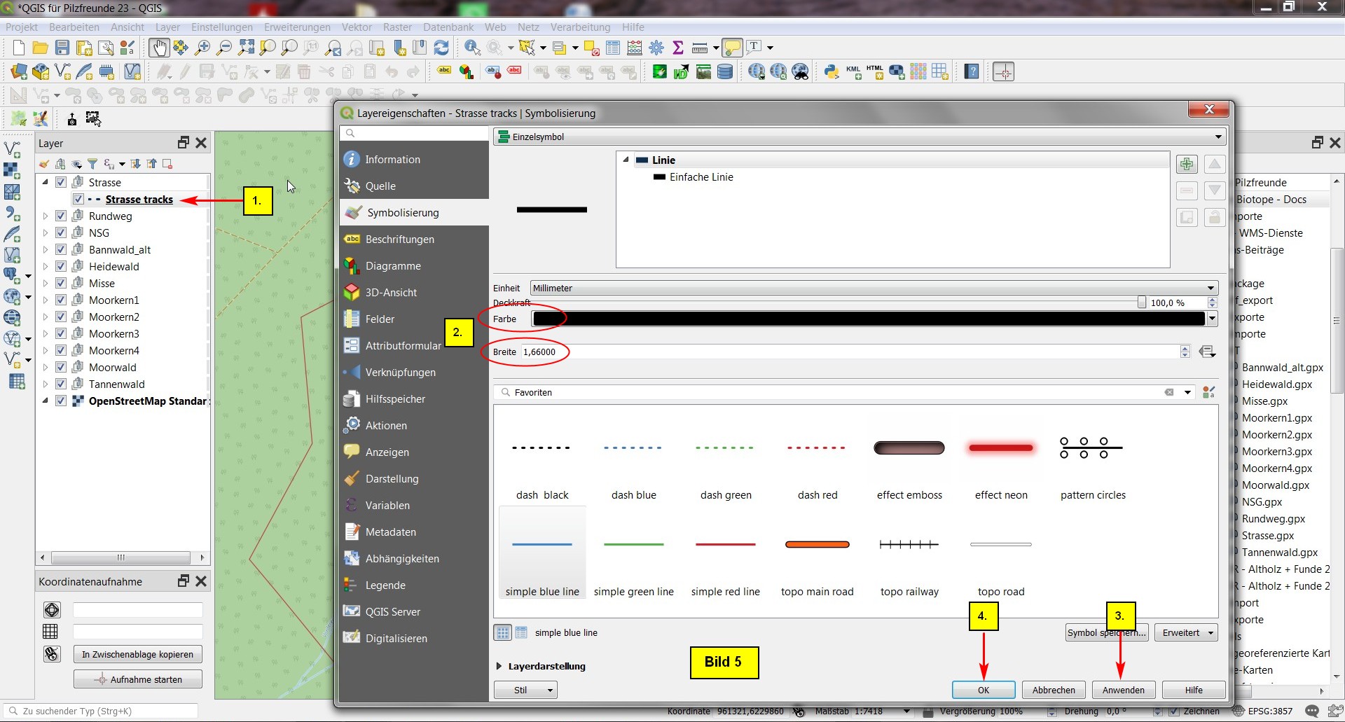 Dazu wird dieser Layerbereich heruntergeklappt, und mit Doppelclick auf "- - Straße tracks" öffnen wir die Layereigenschaften. Hier stellen wir Farbe und Breite nach Bild 5 ein, übernehmen mit Anwenden und schließen mit OK ab: