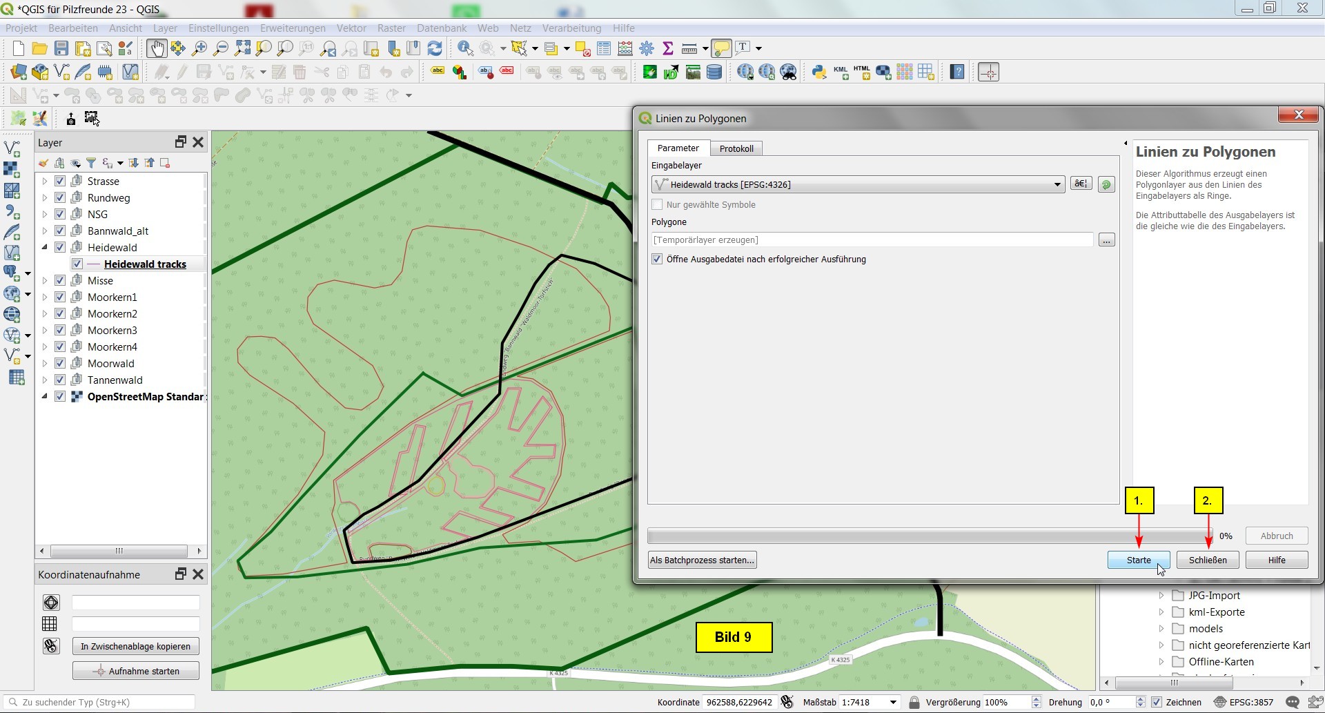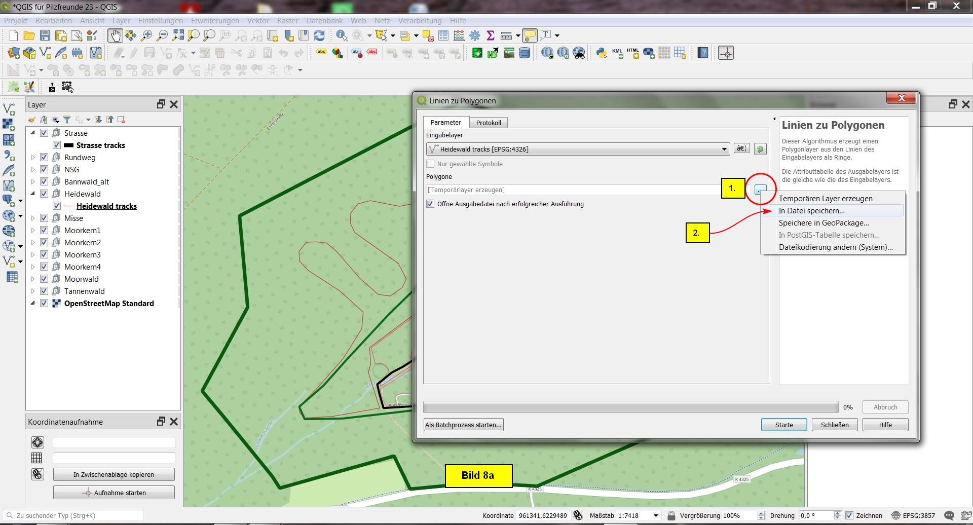 Wir selektieren "- - Heidewald tracks" und öffnen das Menü: Vektor > Geometrie-Werkzeuge > Linien zu Polygonen (Bild 8).