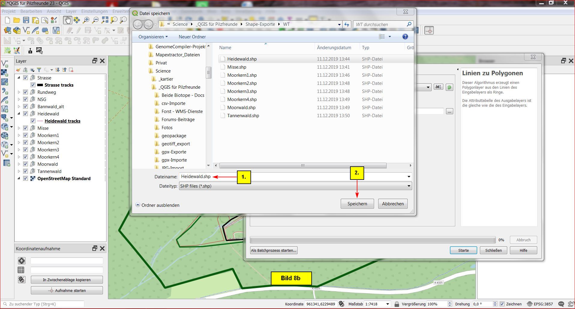 Im nächsten Menü manövrieren wir zum Ziel-Ordner "Shape-Exporte" für das abzuspeichernde Shapefile und speichern als Heidwald.shp ab (Bild 8b). Vorher natürlich den Ordner erstellen!