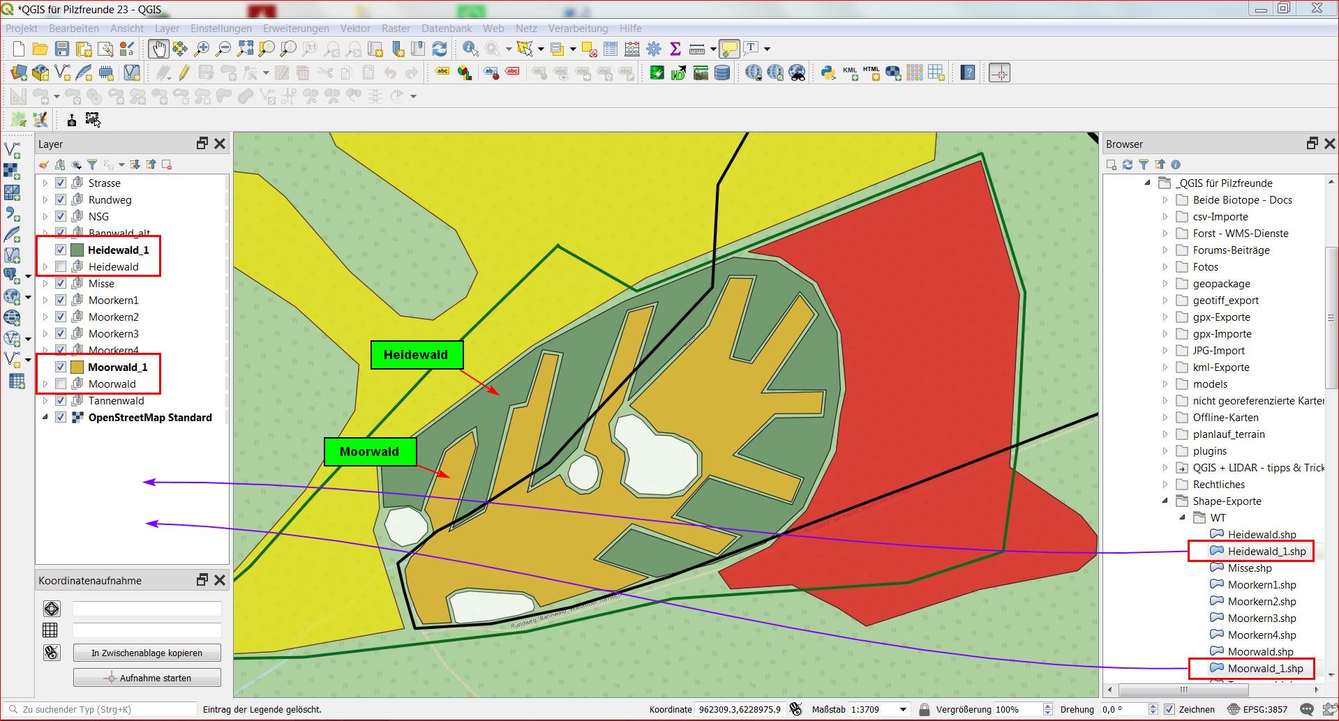 Entsprechend verfahren wir mit den restlichen sieben "Biotopen" (im Layerfenster unterhalb "Heidwald").