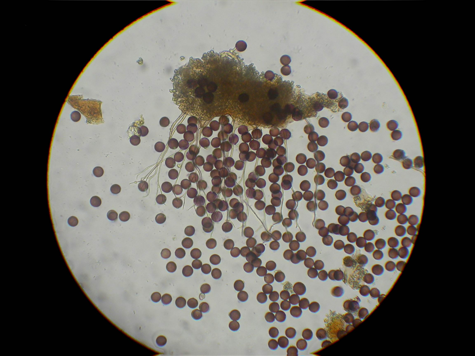 Es bleibt spannend - auf Kududung (Wort mit 3 u)wachsen flache Gebilde, ca, 1mm im Durchmesser, nicht ganz kreisrund ganz glatt, hellgrau, ganz entfernt an eine Schildlaus erinnernd (sorry schon spät, mir fällt nix besseres ein), am späten Abend so ein Ding unters Mikroskop gepackt - total seltsam, die grau Außenhaut platz mehr oder ab, und das Dingens ist mit braunen, kugelförmigen Sporen gefüllt, weder Asci noch Basidien erkennbar, Durchmesser ca. 12 µm, ich hab keine Ahnung, irgendeine meiner Synapsen flüstert was vom Myxomycet … Ich bin ratlos ..
