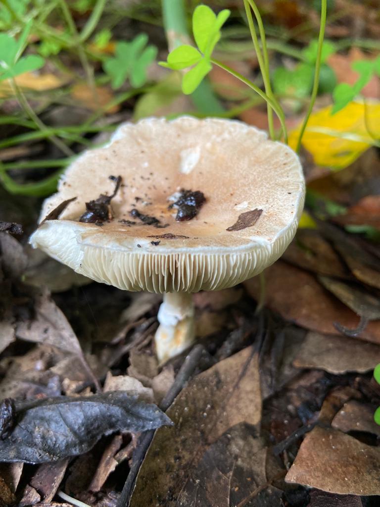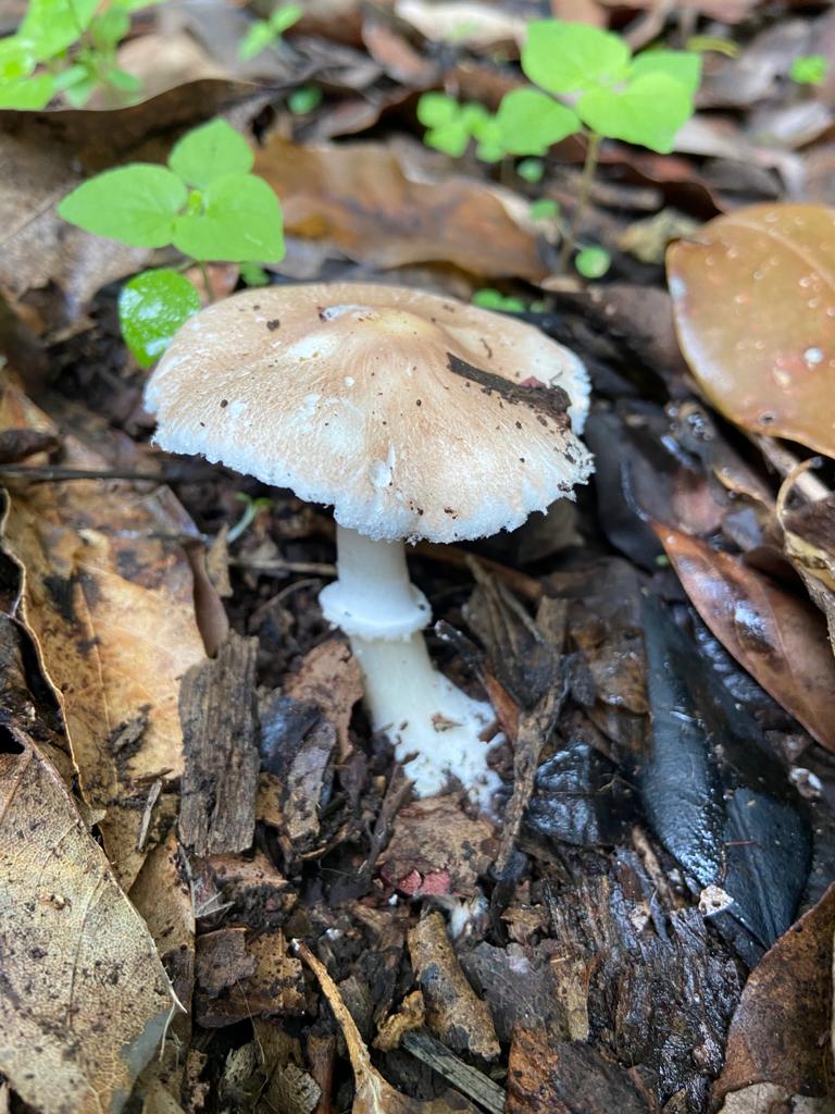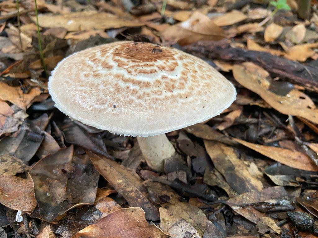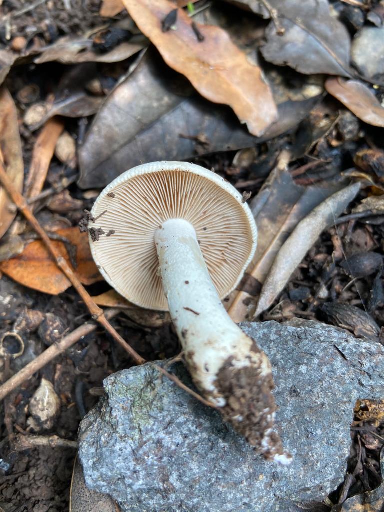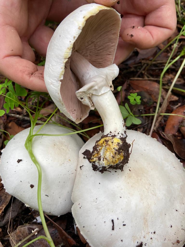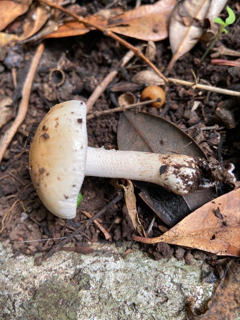 Gefunden am Wegrand mit Eukalyptus. Erinnert mich an Perlhuhn. Gilbte auch in der Stielbasis. Ohne Geruch, da sehr durchnässt. Röten passt nicht.