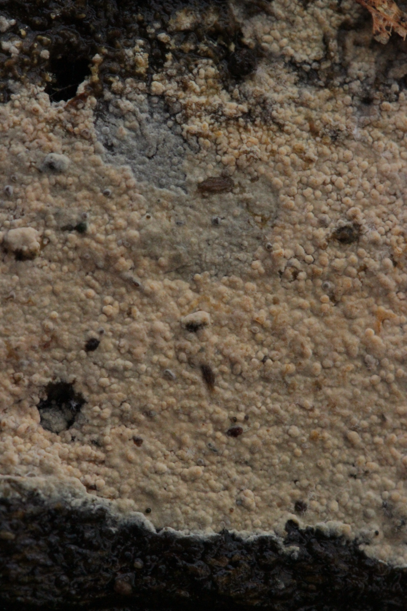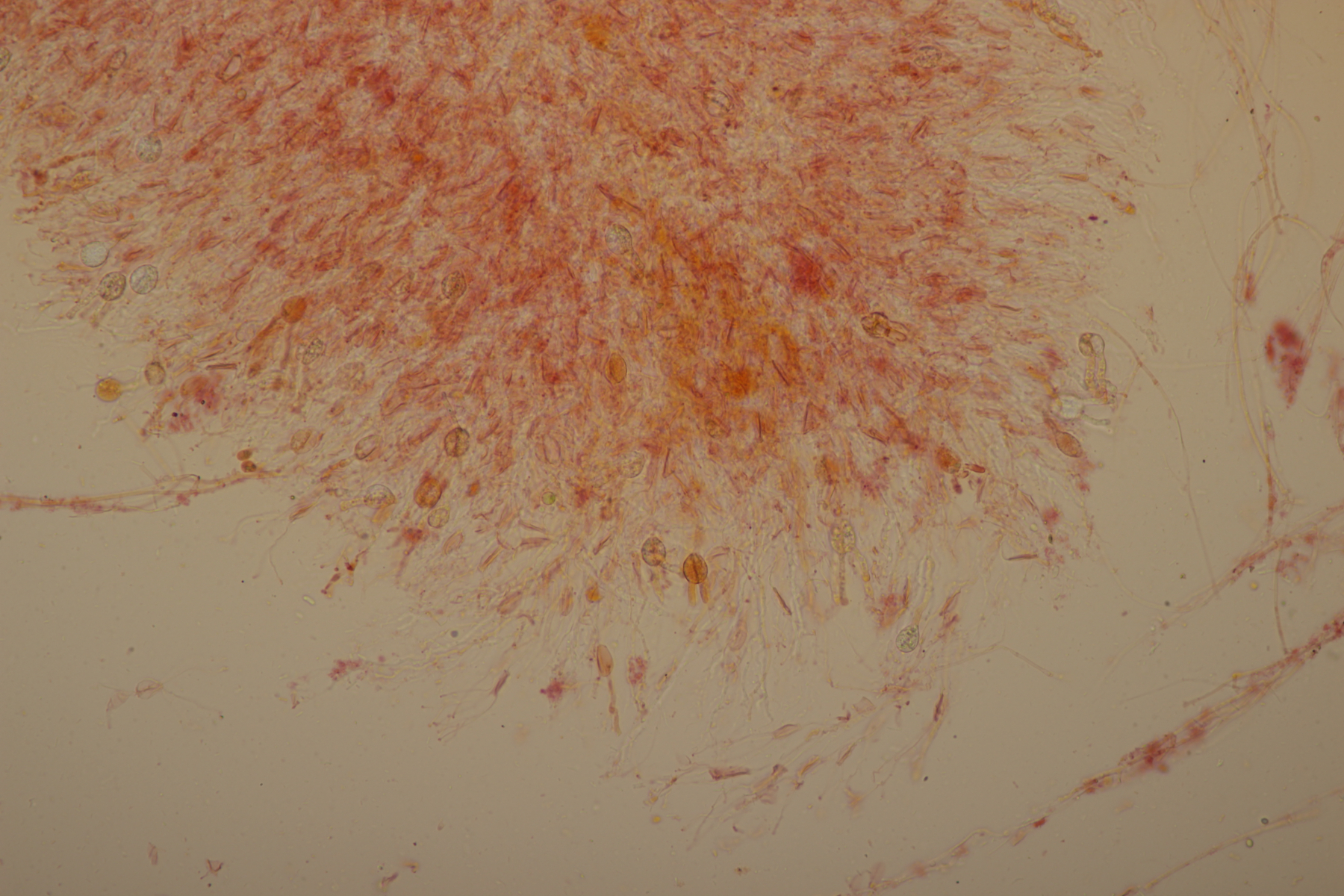 1. Ein Rindenpilz auf Laubholz. Da habe ich mal wieder gar keine Ahnung. Auffällig waren die ovalen Gebilde, die sich überall im Pilz fanden. Aber ob das jetzt dazugehört (Konidien?) oder etwas ganz anderes ist, vermag ich nicht sagen. Ansonsten hatte der Pilz Schnallen und Zystiden, die teilweise leicht kopfig waren und scheinbar von außen einige wenige Kristalle trugen. Sporengröße (4.6+-0.3) µm x (2.9+-0.3) µm.