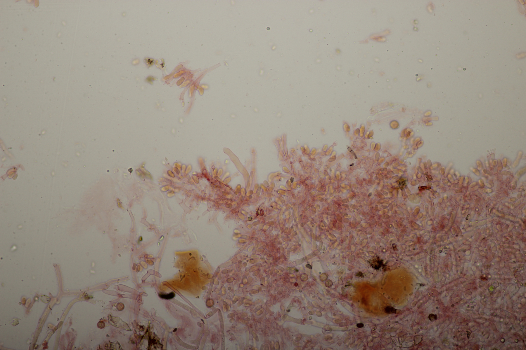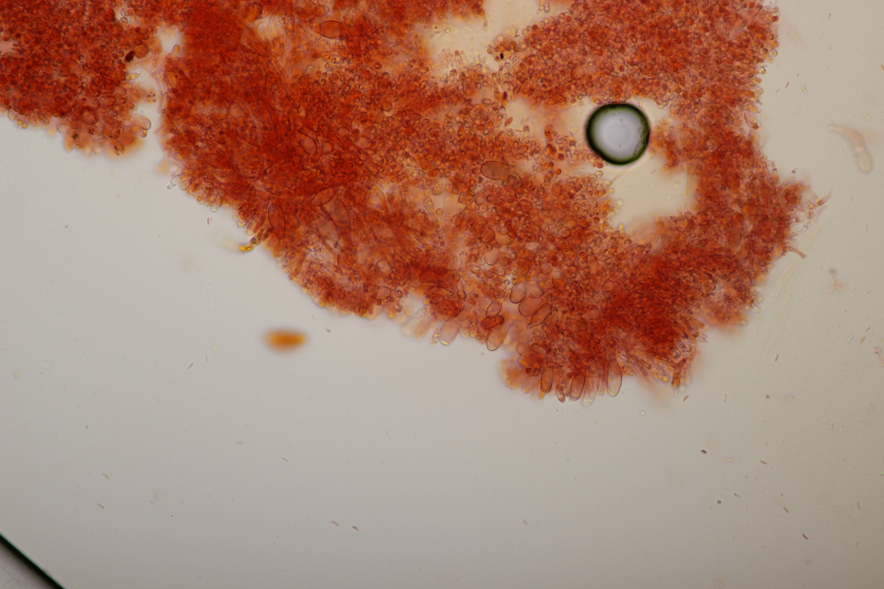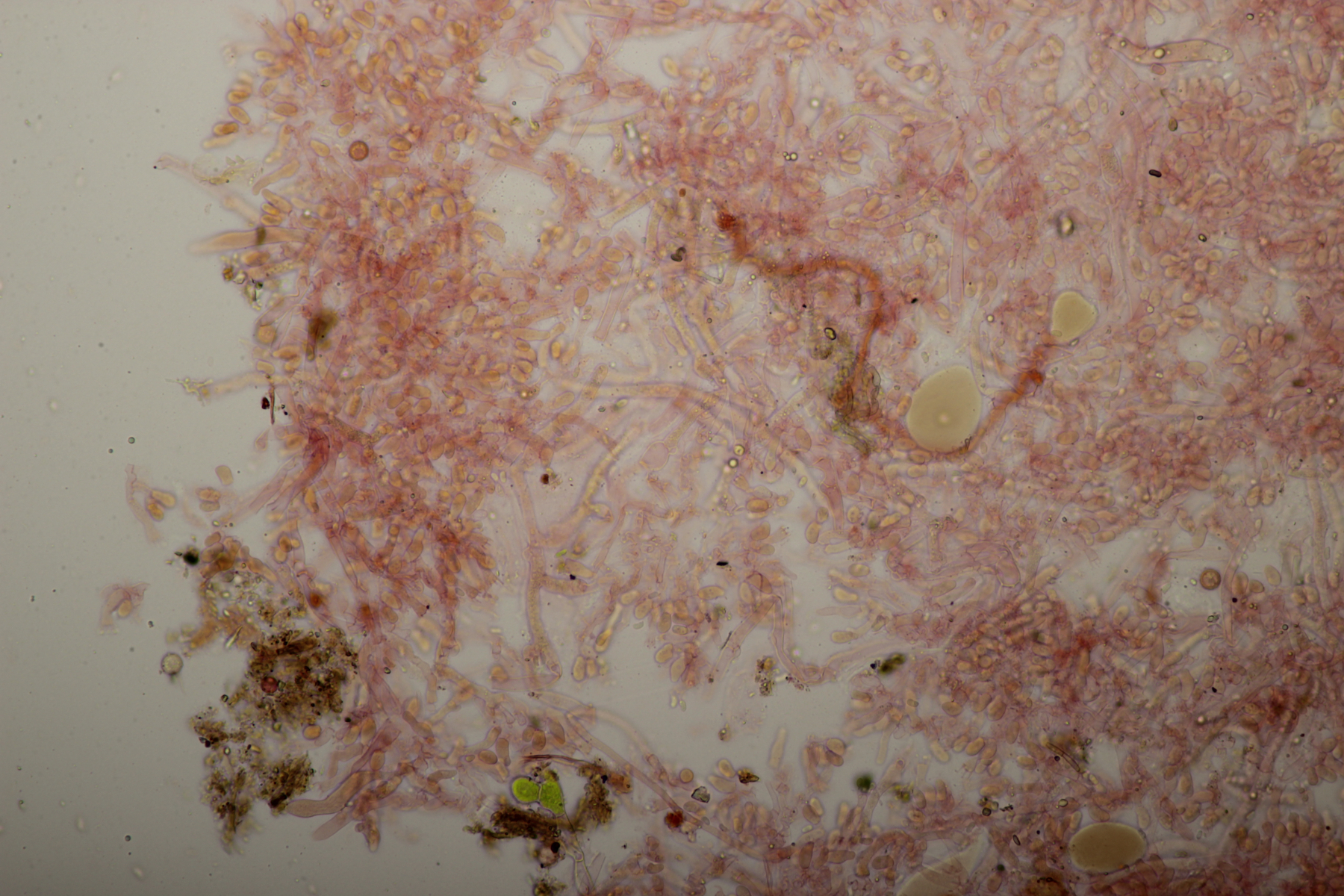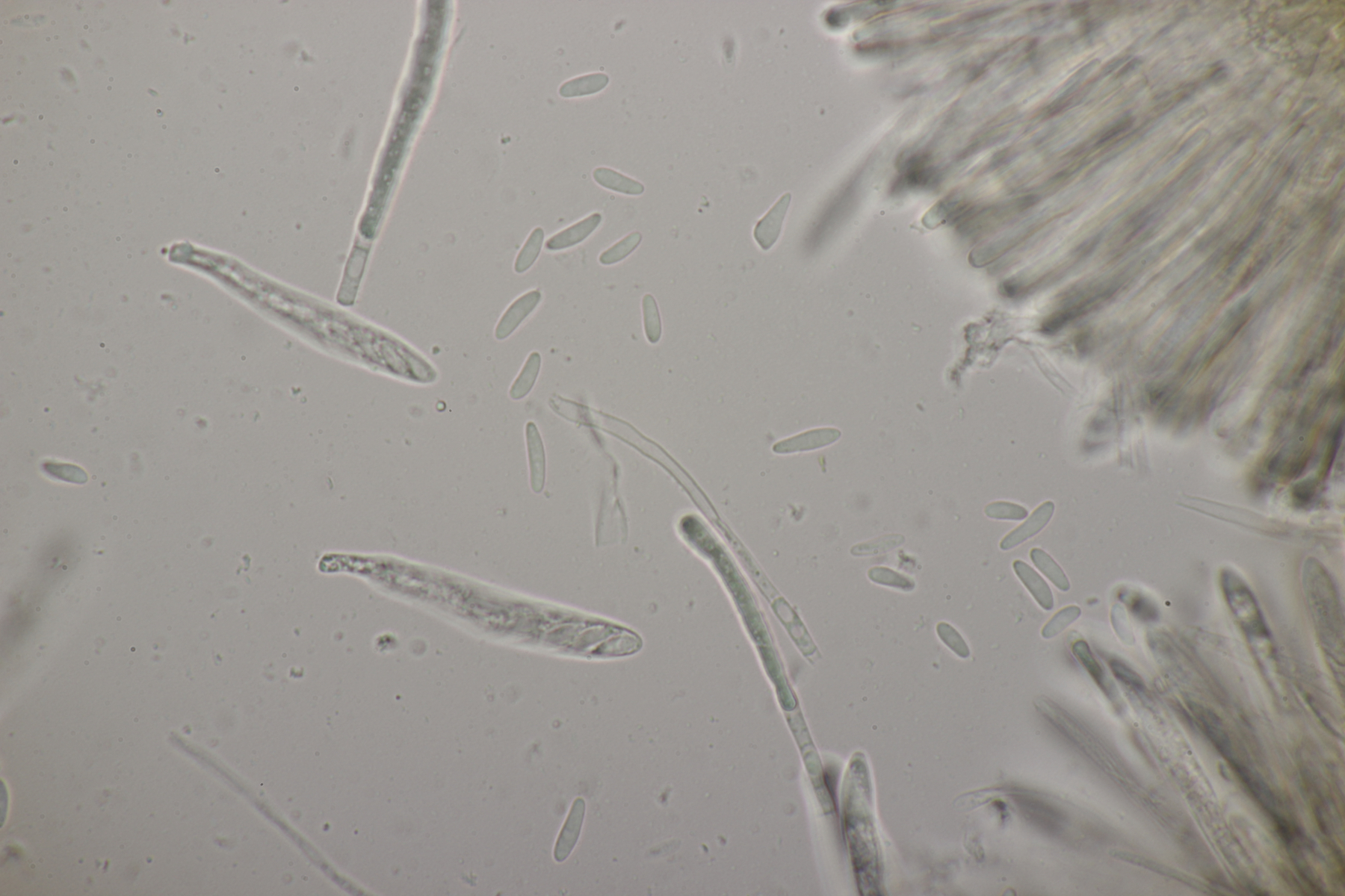 Leider war da kein Kern drin, von daher bin ich unschlüssig, ob das eine der weißen Exidias ist oder etwas aus dem Myxarium nucleatum agg., wo es ja auch Arten ohne Kerne gibt. Sporengröße (13.7+-0.8) µm x (5.0+-0.4) µm, Q=2.7+-0.2