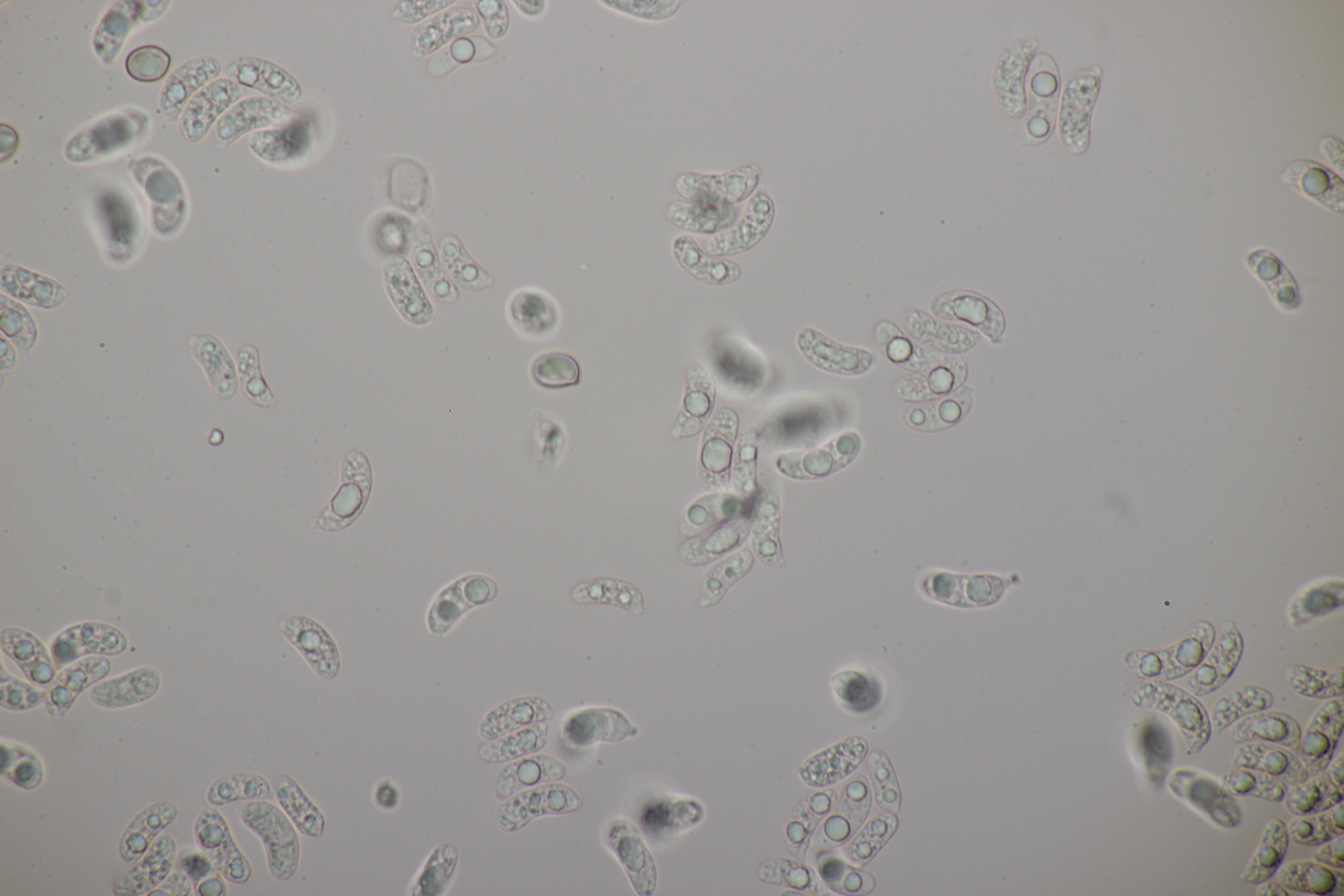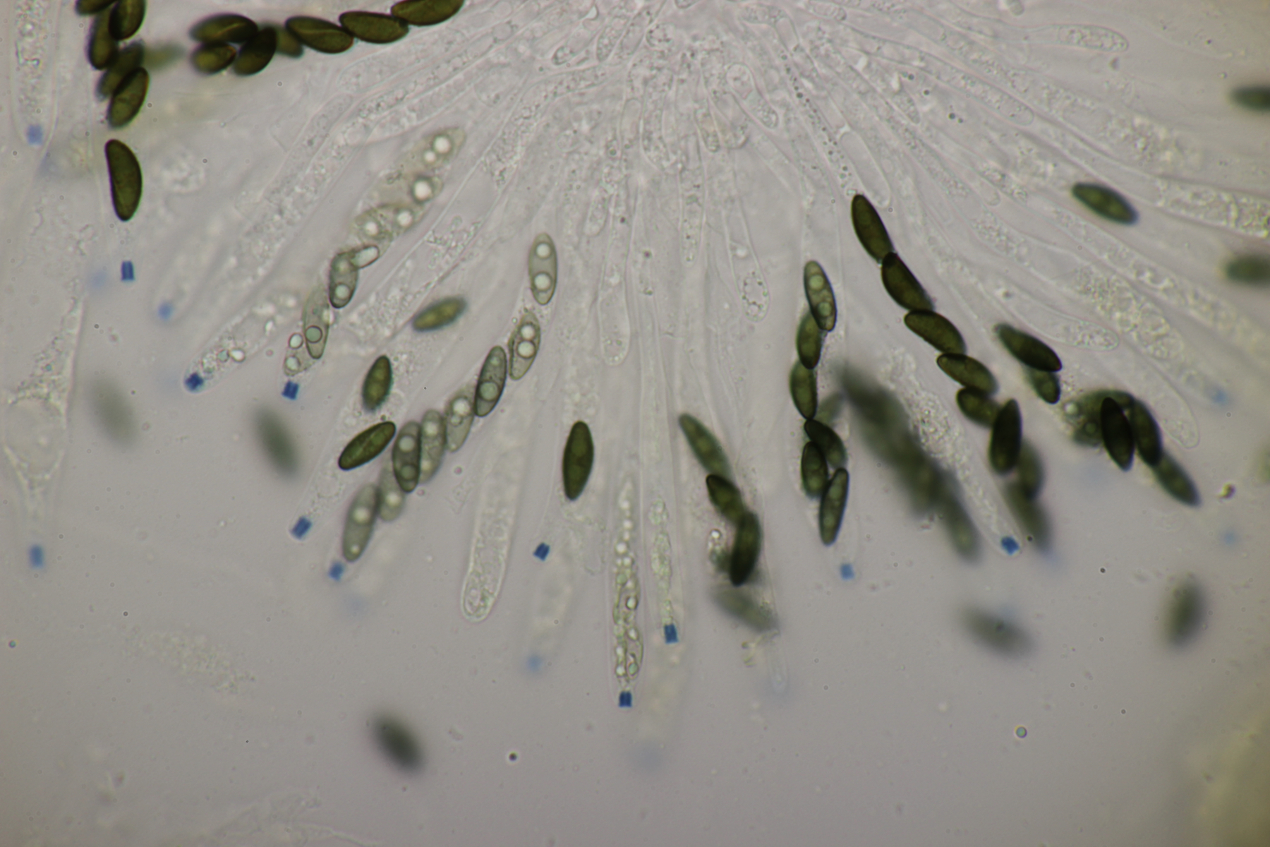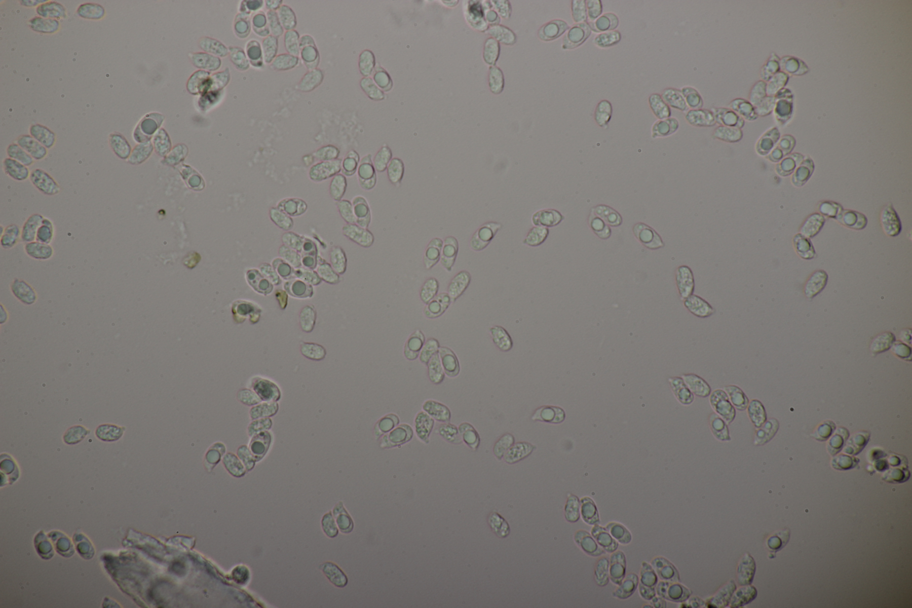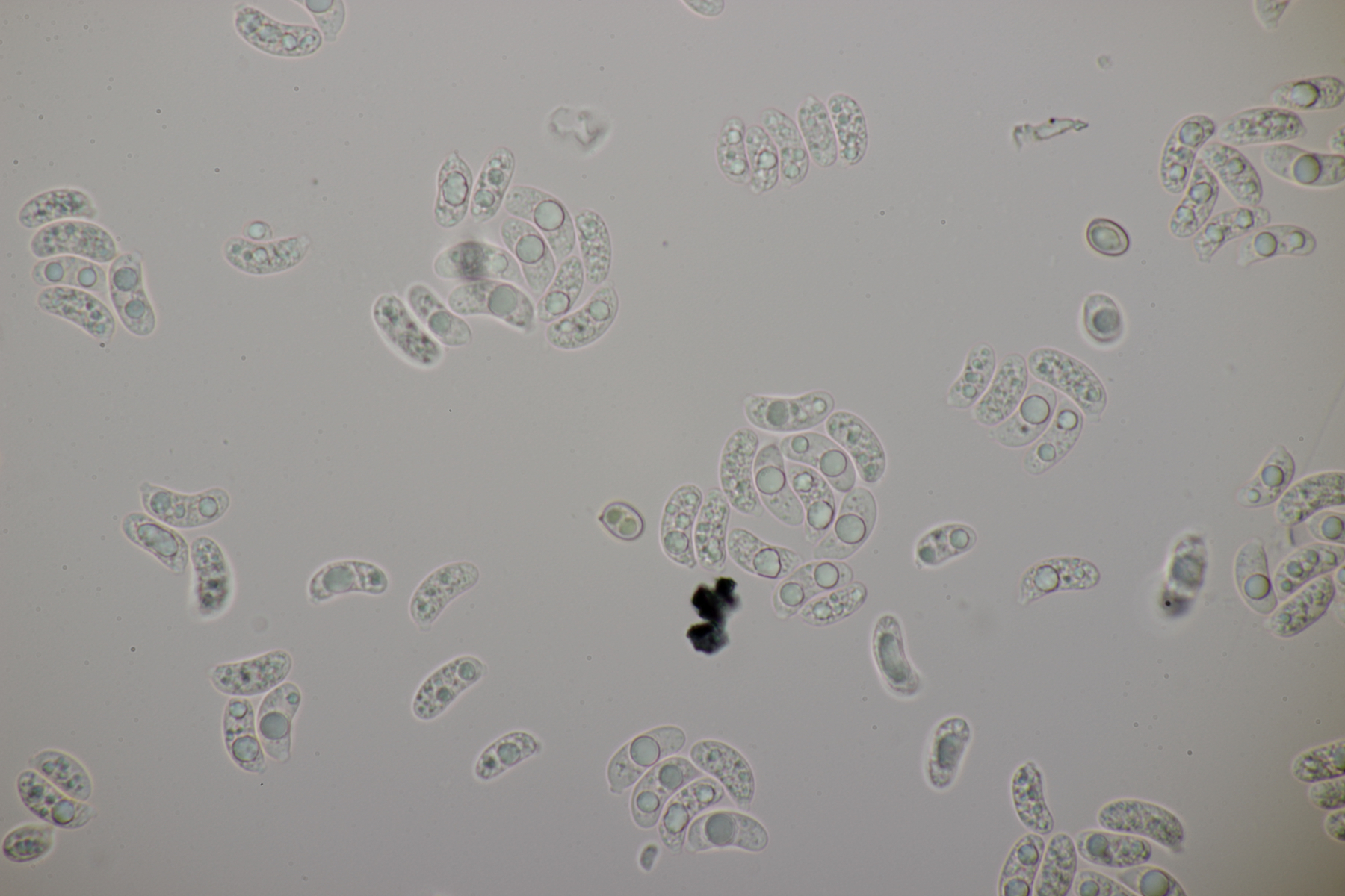 Leider war da kein Kern drin, von daher bin ich unschlüssig, ob das eine der weißen Exidias ist oder etwas aus dem Myxarium nucleatum agg., wo es ja auch Arten ohne Kerne gibt. Sporengröße (13.7+-0.8) µm x (5.0+-0.4) µm, Q=2.7+-0.2