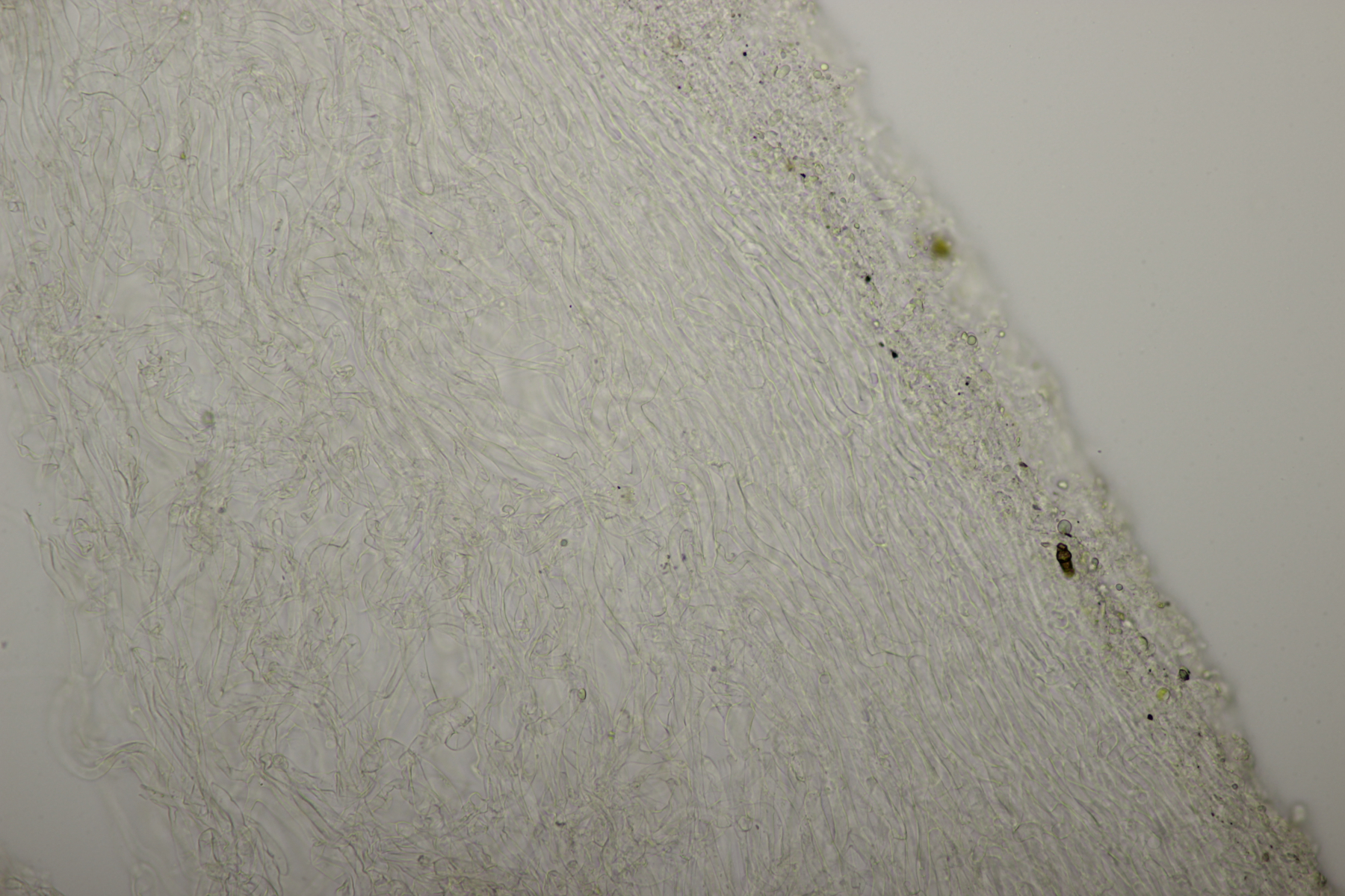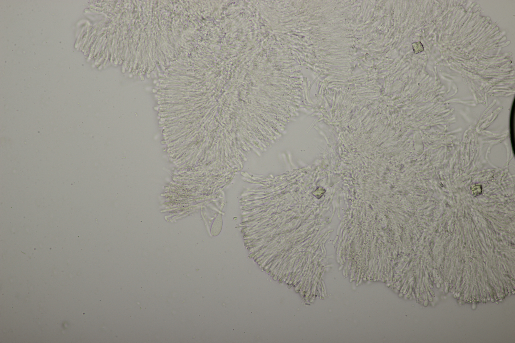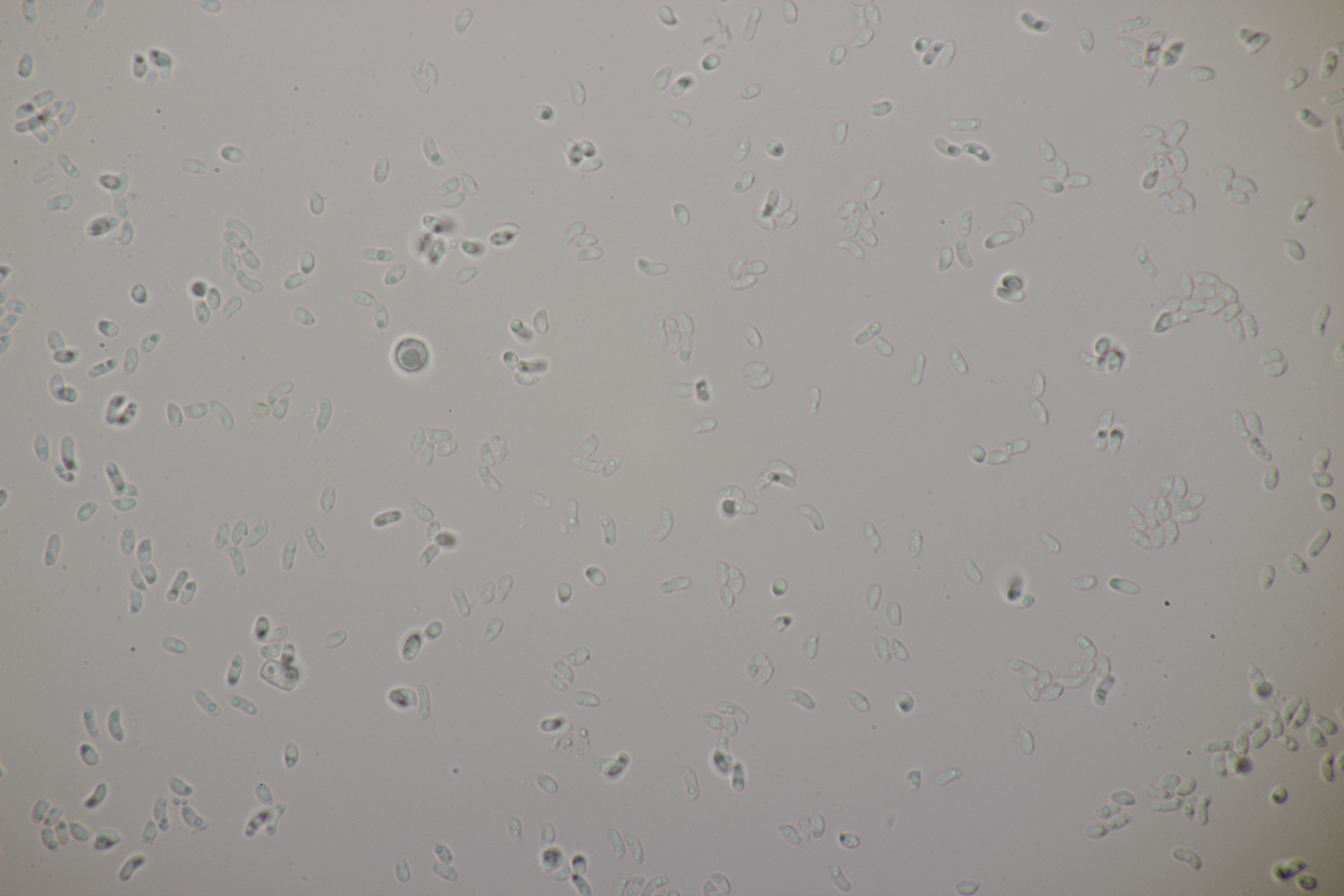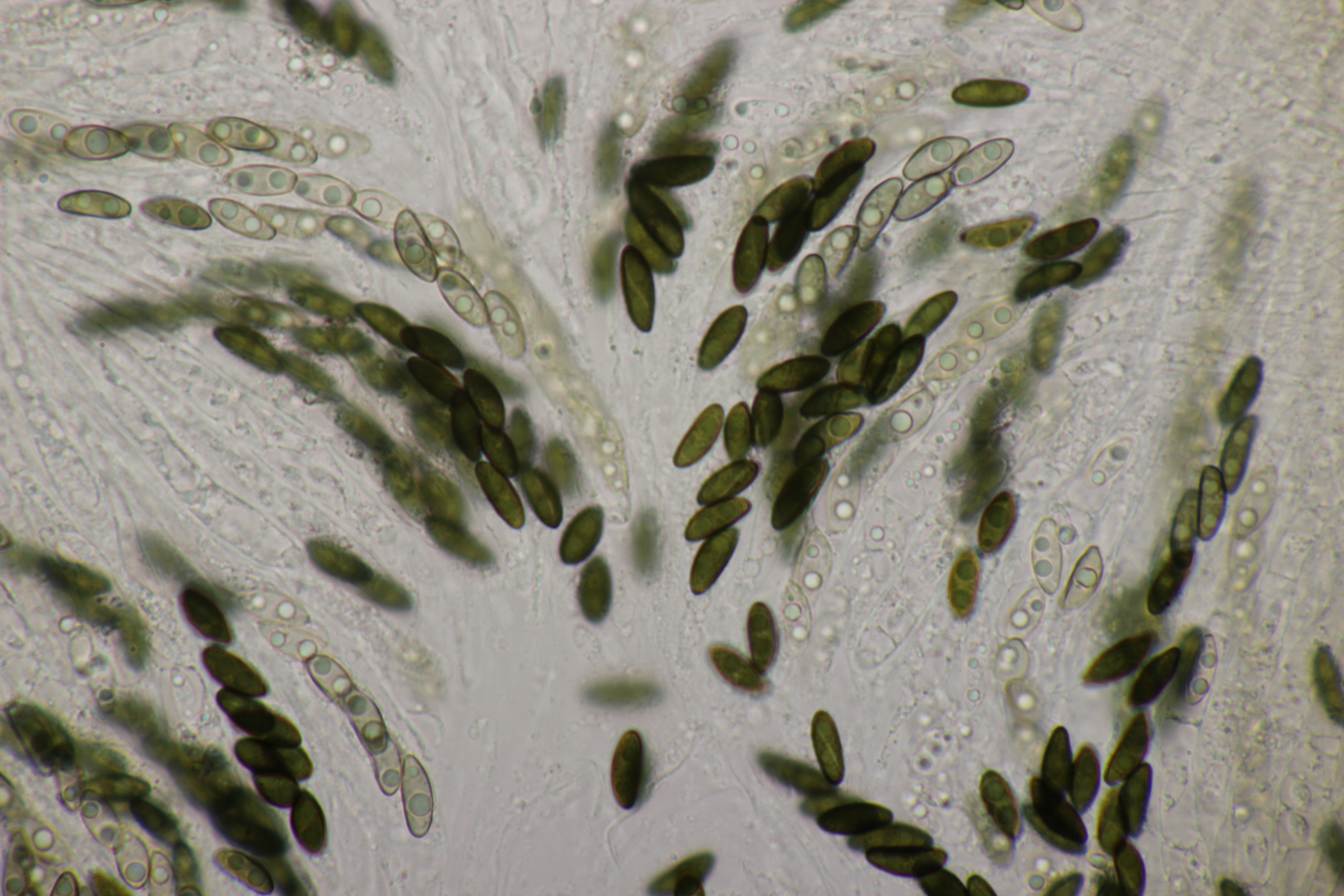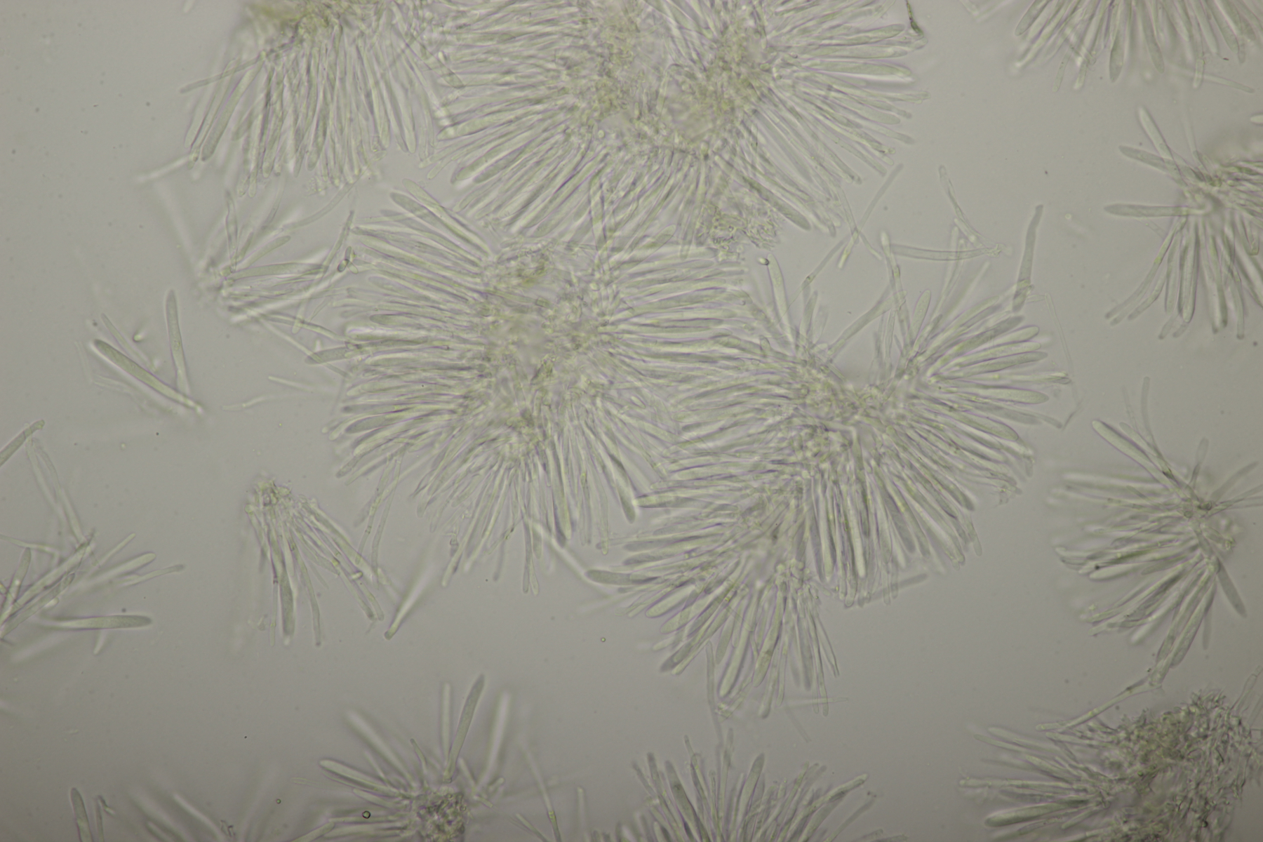 Leider war da kein Kern drin, von daher bin ich unschlüssig, ob das eine der weißen Exidias ist oder etwas aus dem Myxarium nucleatum agg., wo es ja auch Arten ohne Kerne gibt. Sporengröße (13.7+-0.8) µm x (5.0+-0.4) µm, Q=2.7+-0.2
