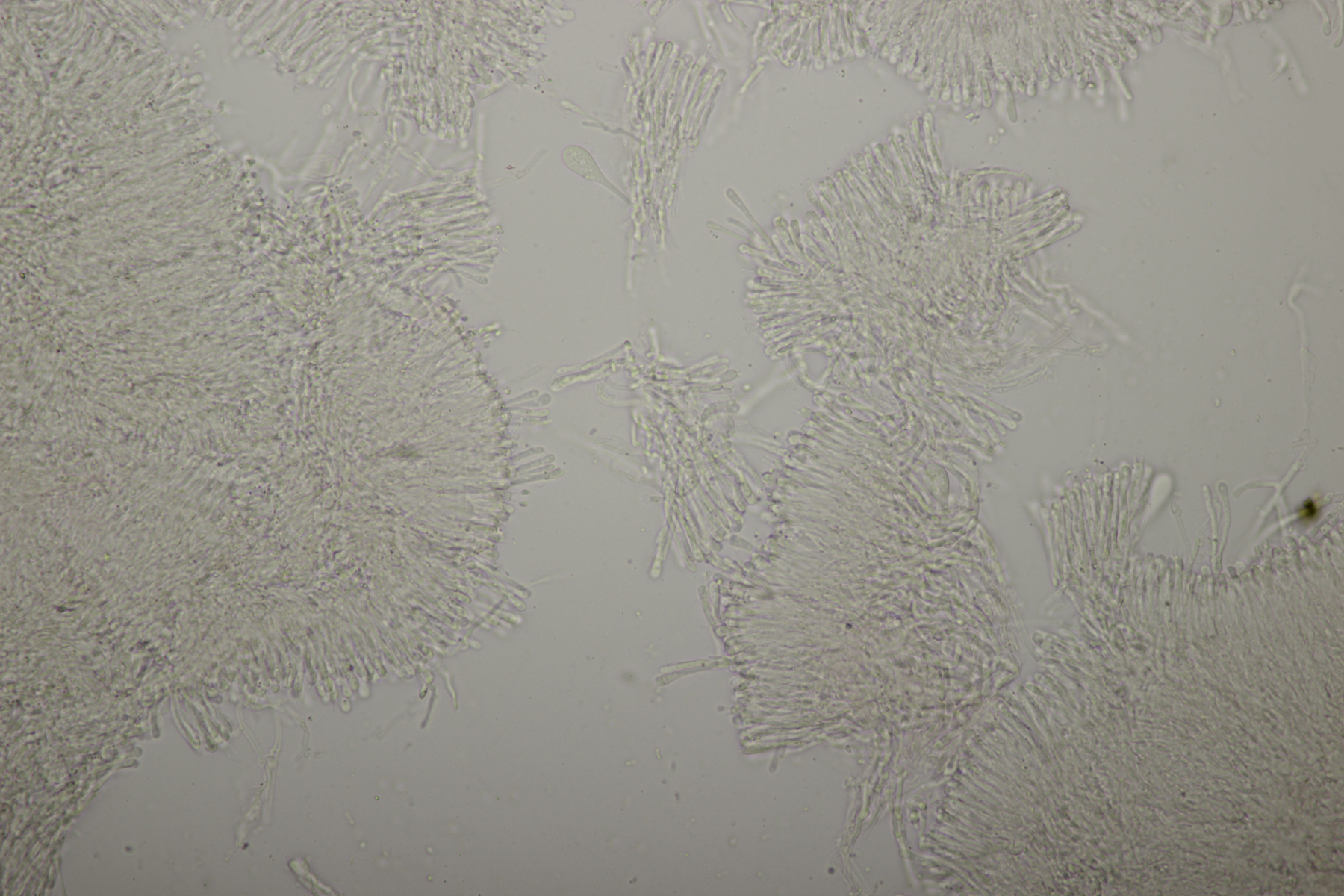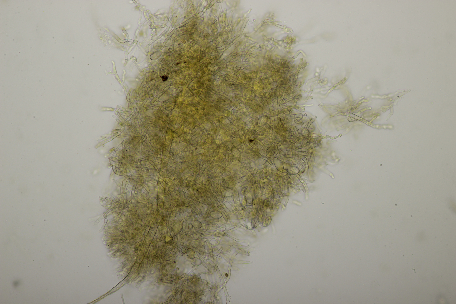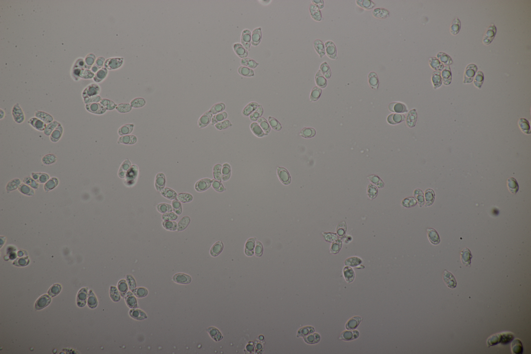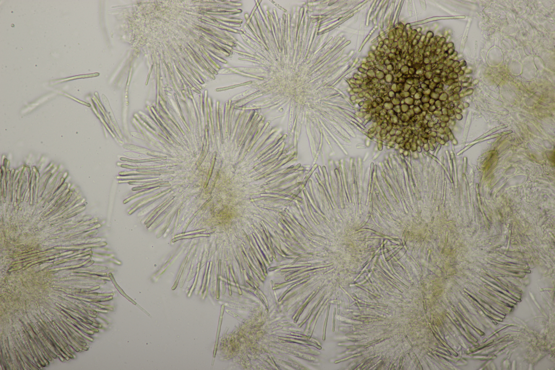 Leider war da kein Kern drin, von daher bin ich unschlüssig, ob das eine der weißen Exidias ist oder etwas aus dem Myxarium nucleatum agg., wo es ja auch Arten ohne Kerne gibt. Sporengröße (13.7+-0.8) µm x (5.0+-0.4) µm, Q=2.7+-0.2