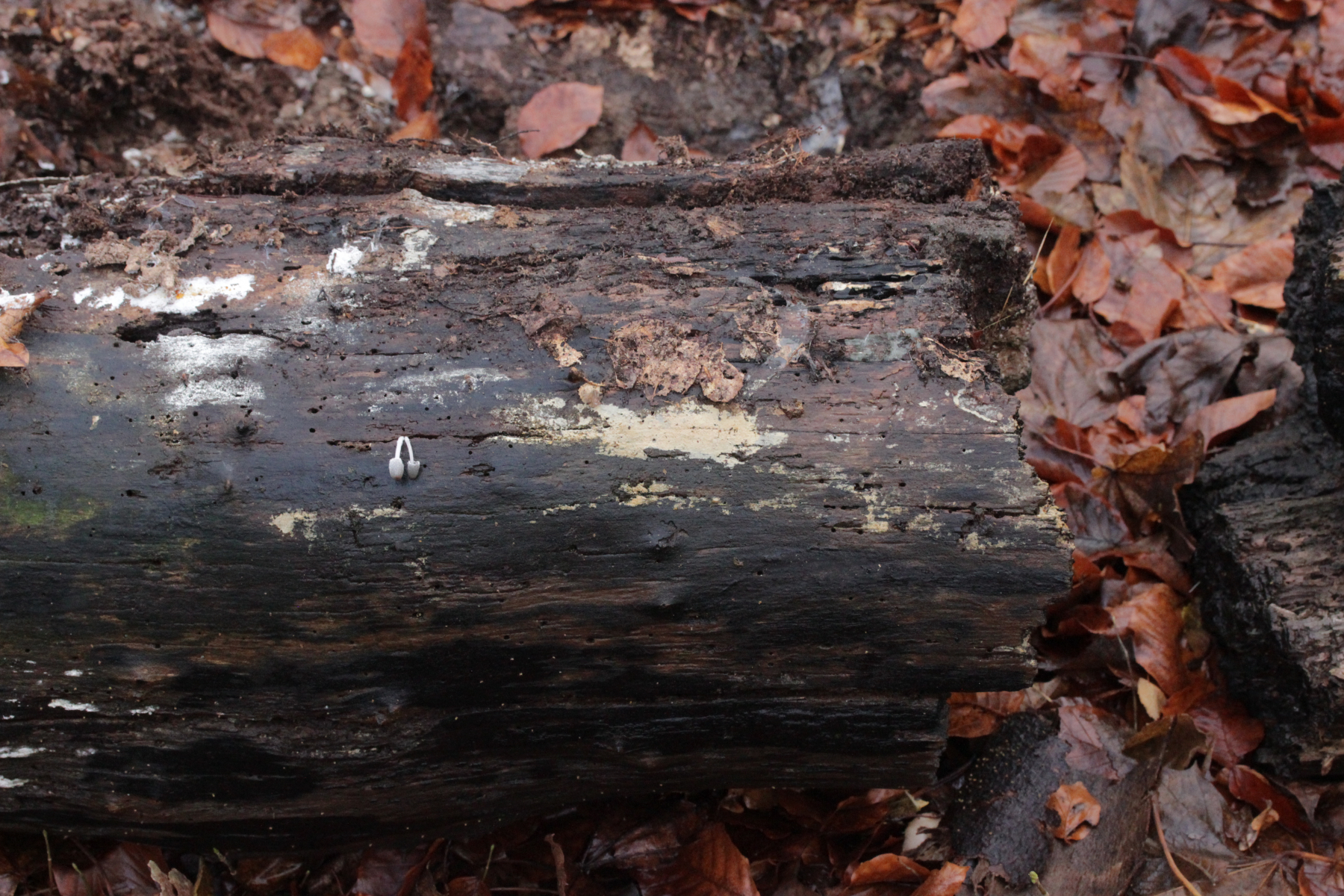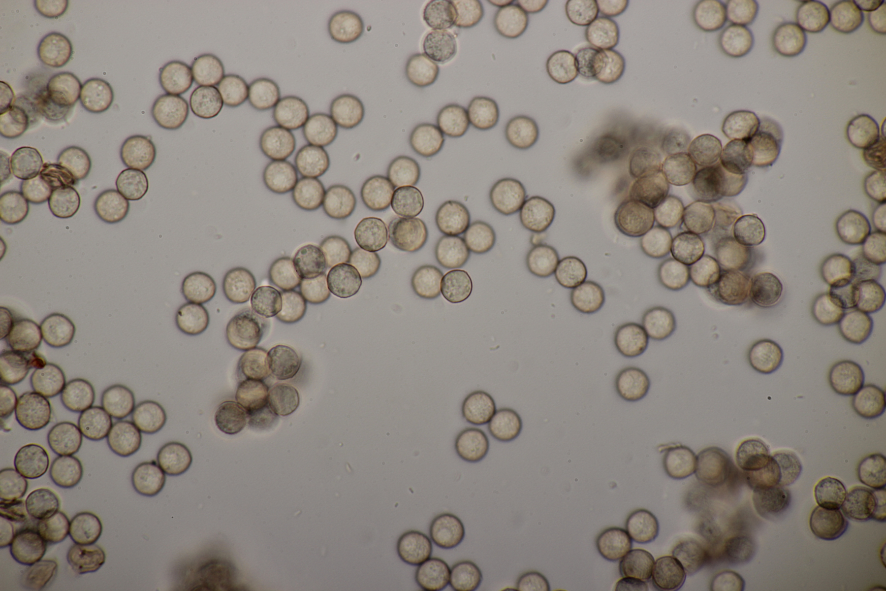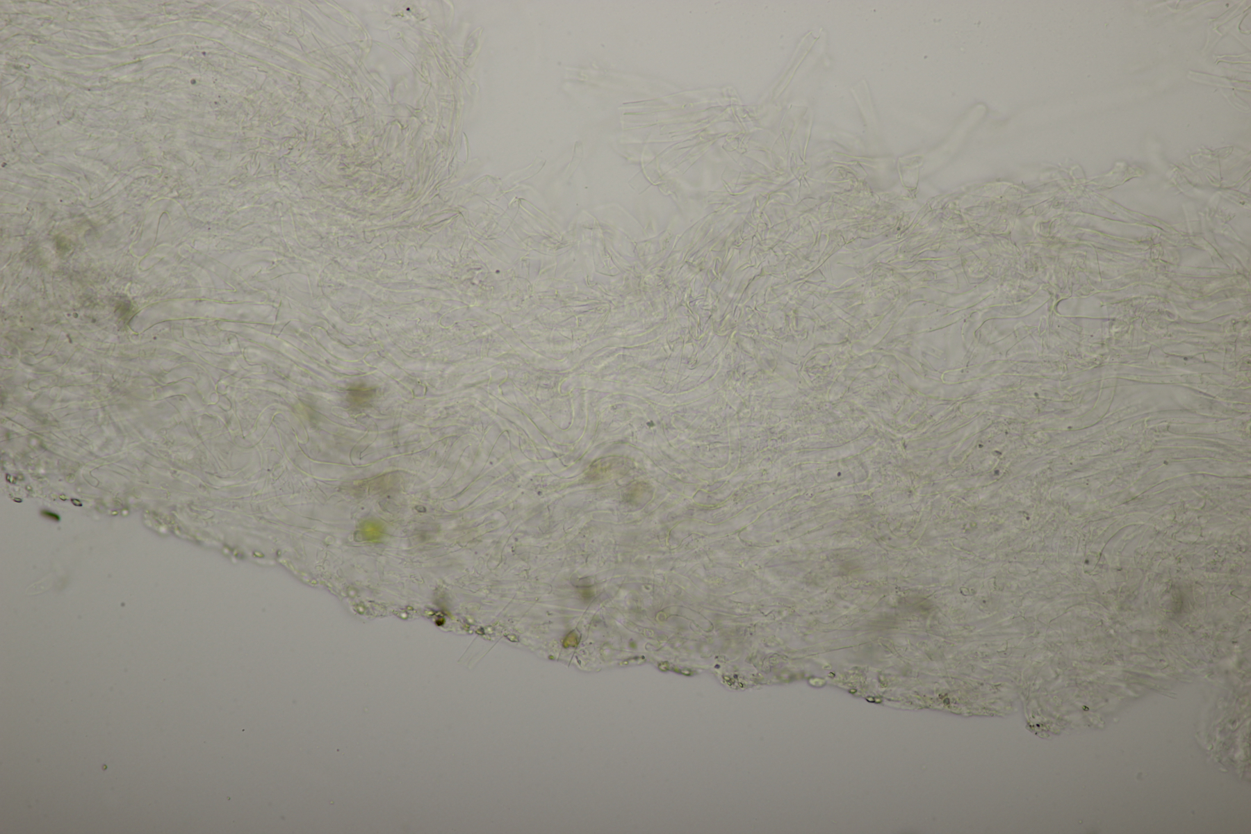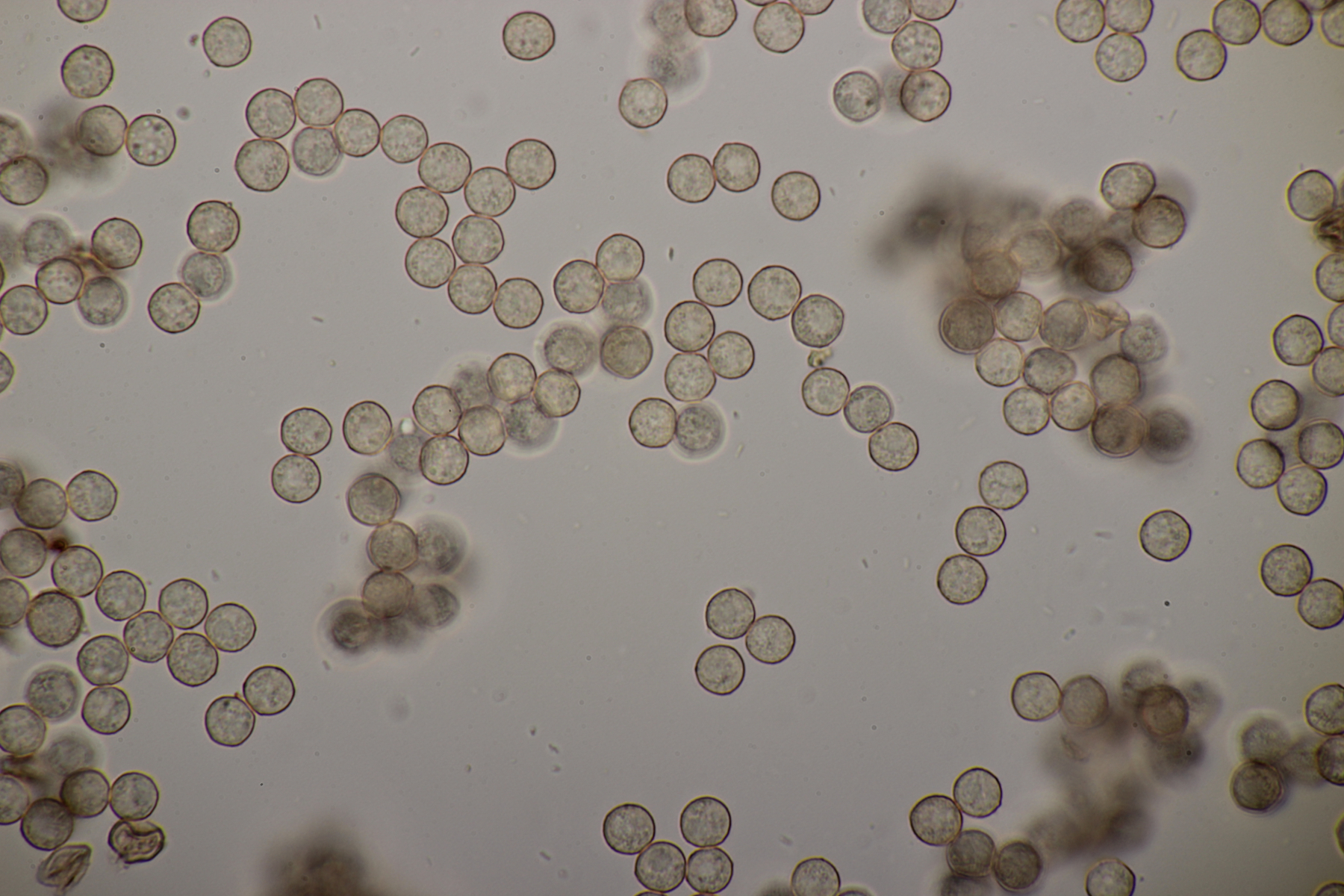 Leider war da kein Kern drin, von daher bin ich unschlüssig, ob das eine der weißen Exidias ist oder etwas aus dem Myxarium nucleatum agg., wo es ja auch Arten ohne Kerne gibt. Sporengröße (13.7+-0.8) µm x (5.0+-0.4) µm, Q=2.7+-0.2