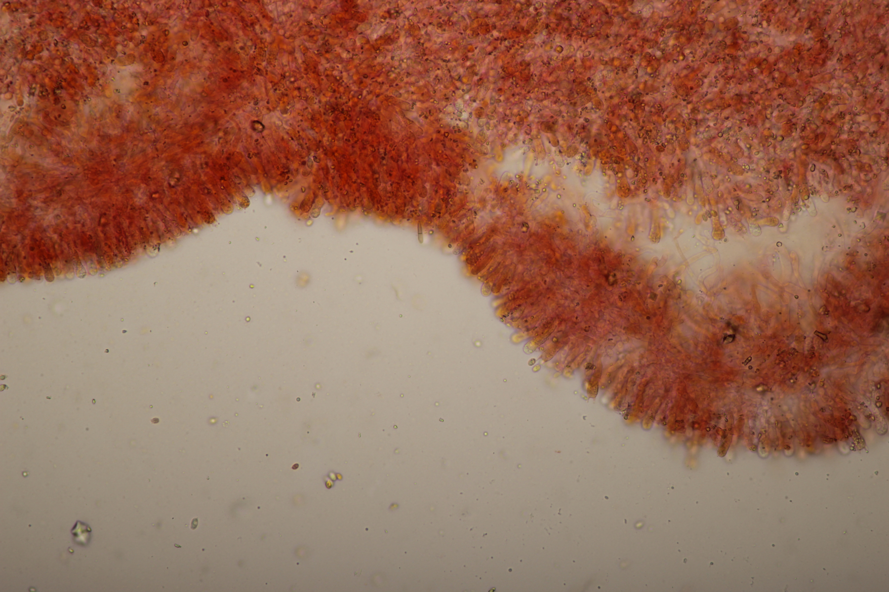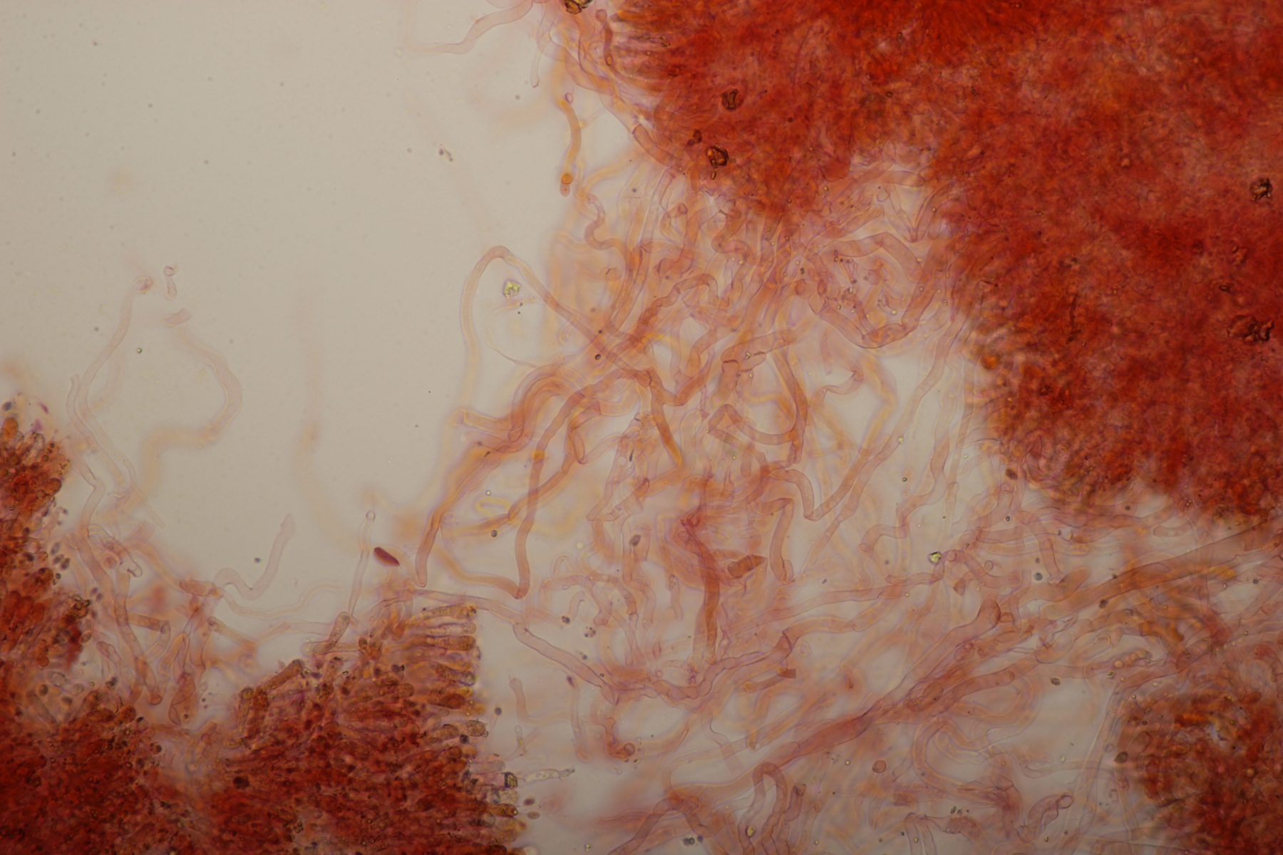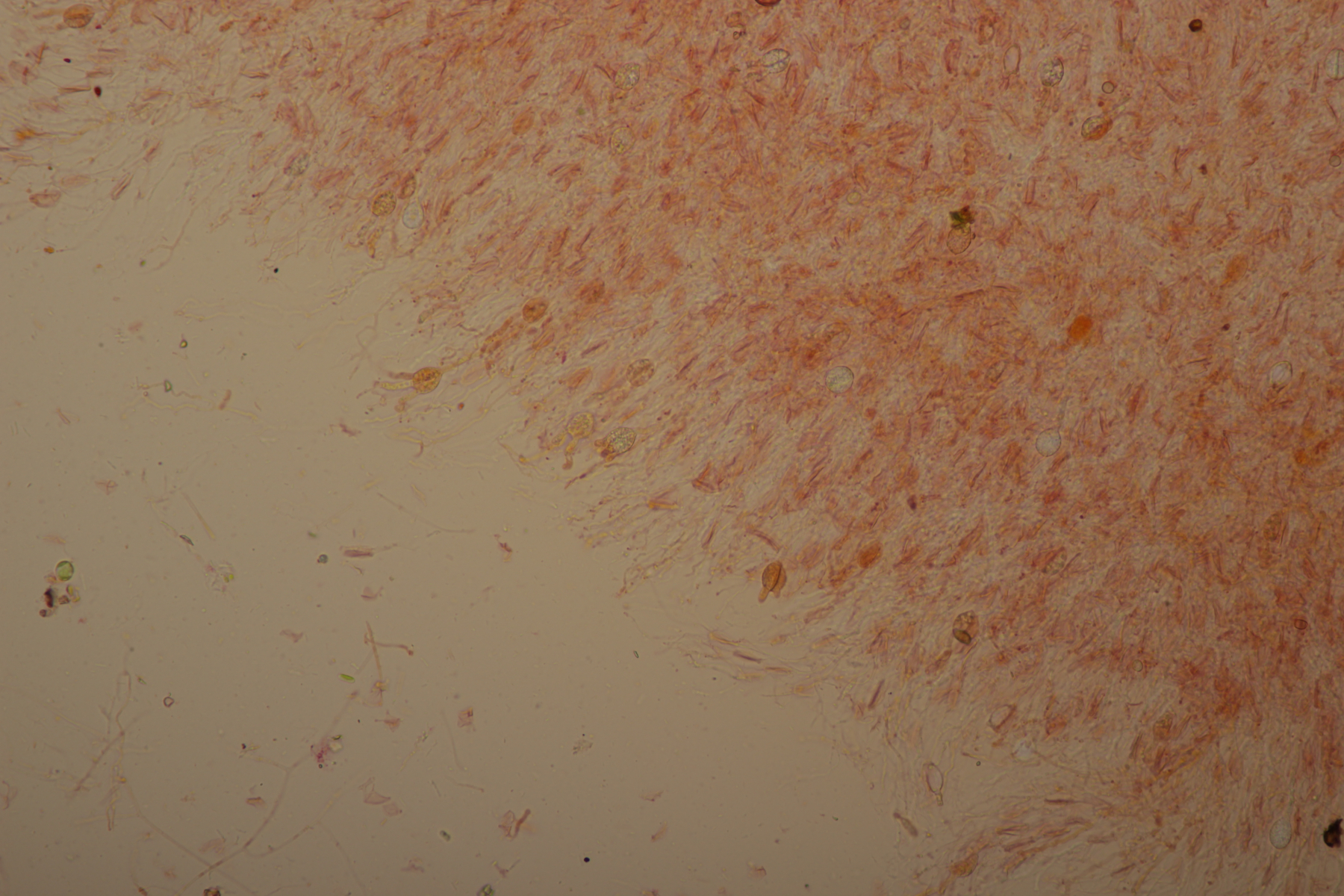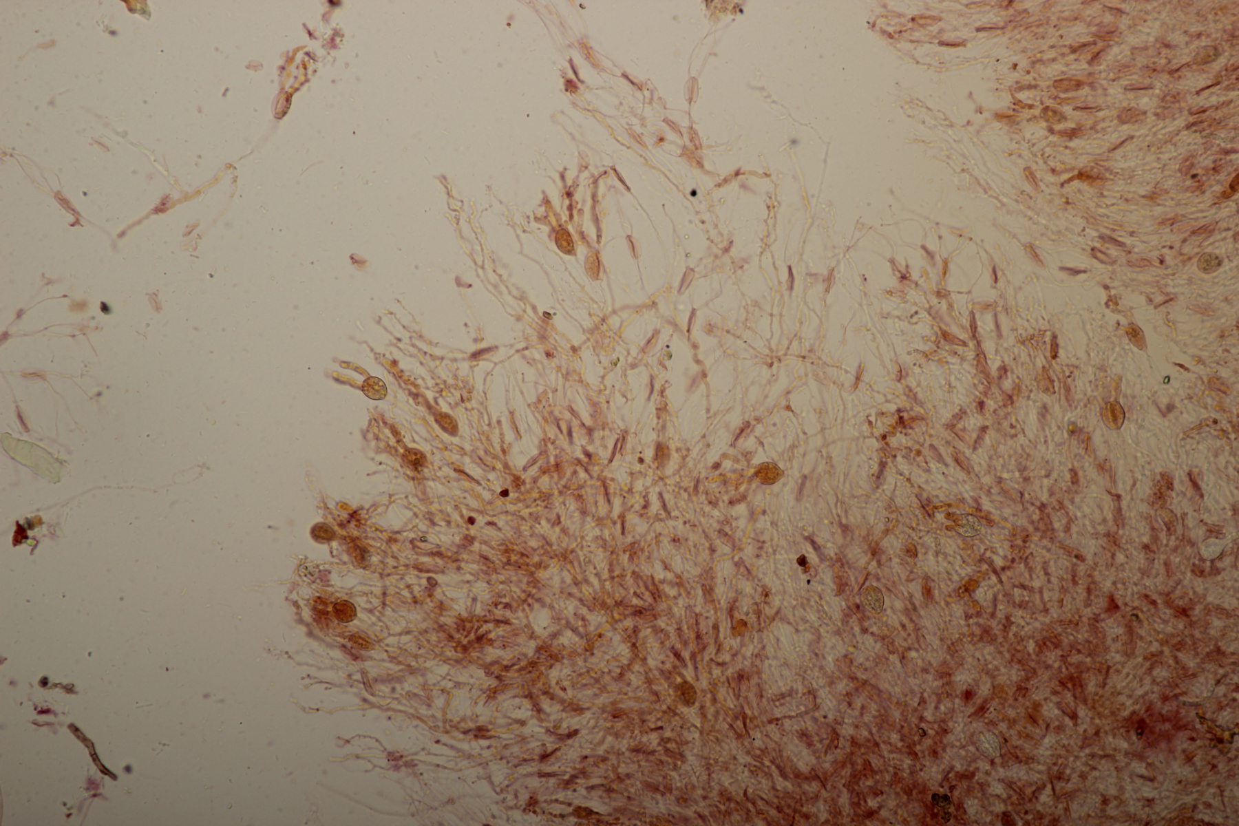 9. Hier lande ich mit den 8-sporigen, urnenförmigen Basidien erstmal bei Sistotrema. Wenn ich dann noch die Zystiden berücksichtige, die durchsichtig waren, lande ich bei Sistotrema coroniferum. Sporengröße (4.7+-0.3) µm x (2.0+-0.2) µm.