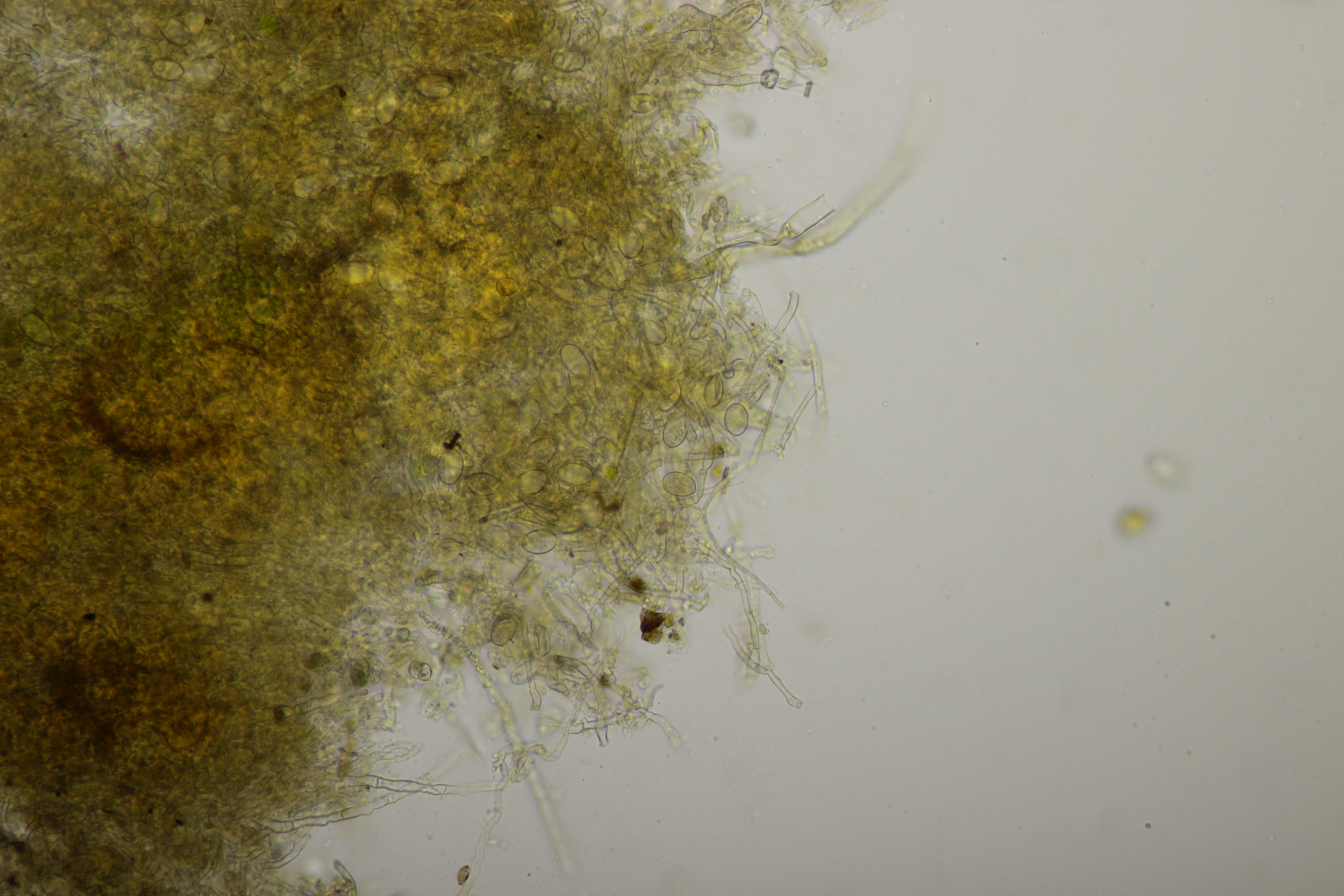 Leider war da kein Kern drin, von daher bin ich unschlüssig, ob das eine der weißen Exidias ist oder etwas aus dem Myxarium nucleatum agg., wo es ja auch Arten ohne Kerne gibt. Sporengröße (13.7+-0.8) µm x (5.0+-0.4) µm, Q=2.7+-0.2