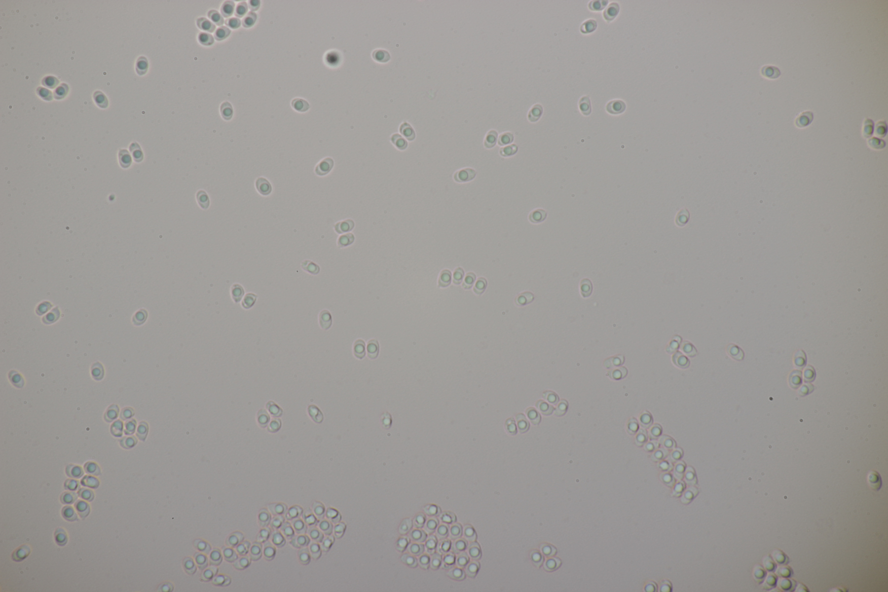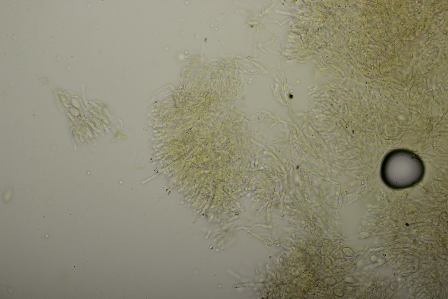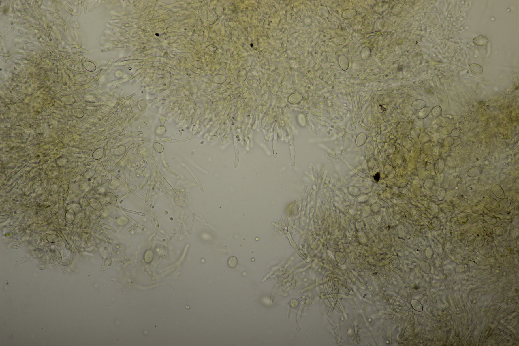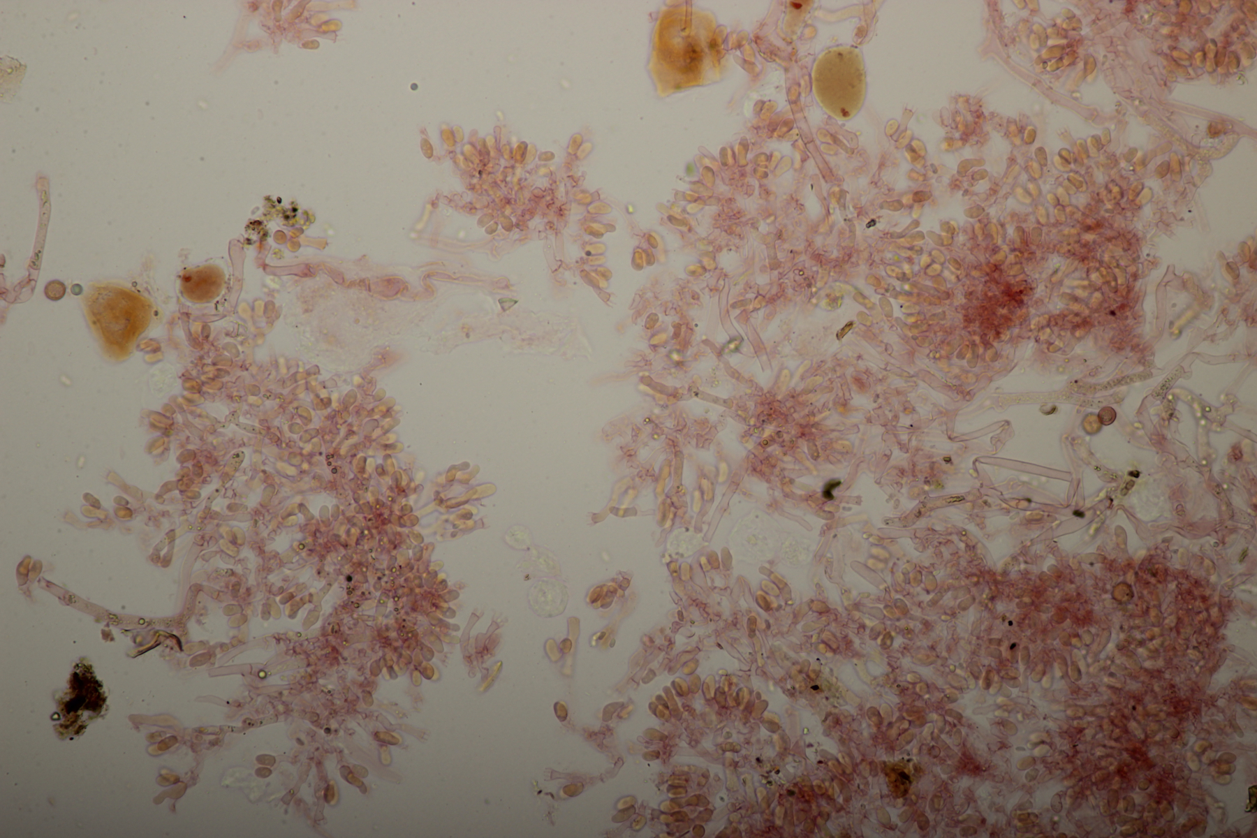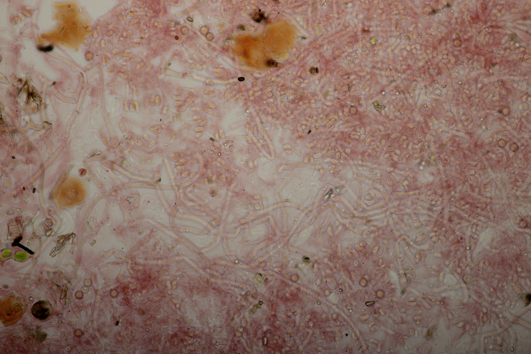 3. Weißer Glibber :D Leider war da kein Kern drin, von daher bin ich unschlüssig, ob das eine der weißen Exidias ist oder etwas aus dem Myxarium nucleatum agg., wo es ja auch Arten ohne Kerne gibt. Sporengröße (13.7+-0.8) µm x (5.0+-0.4) µm, Q=2.7+-0.2