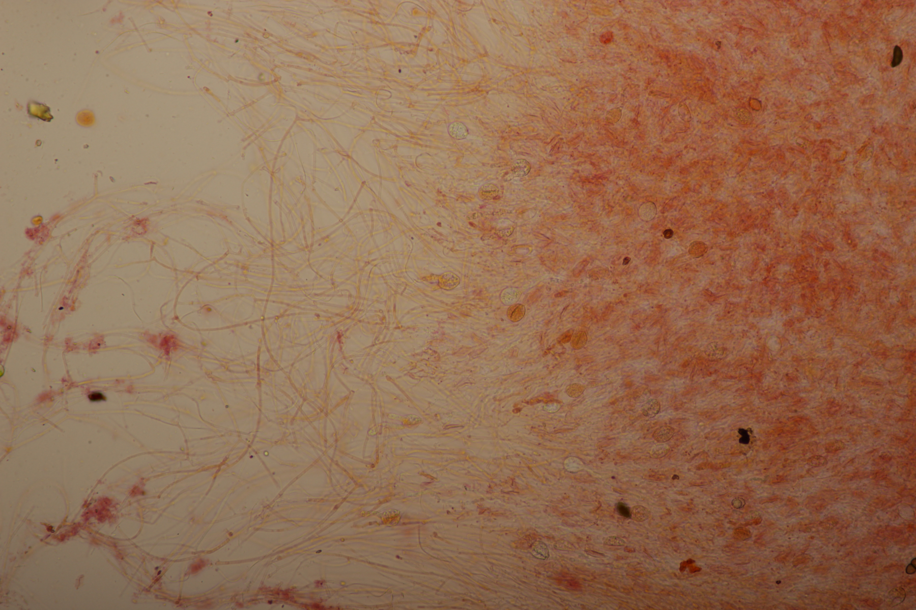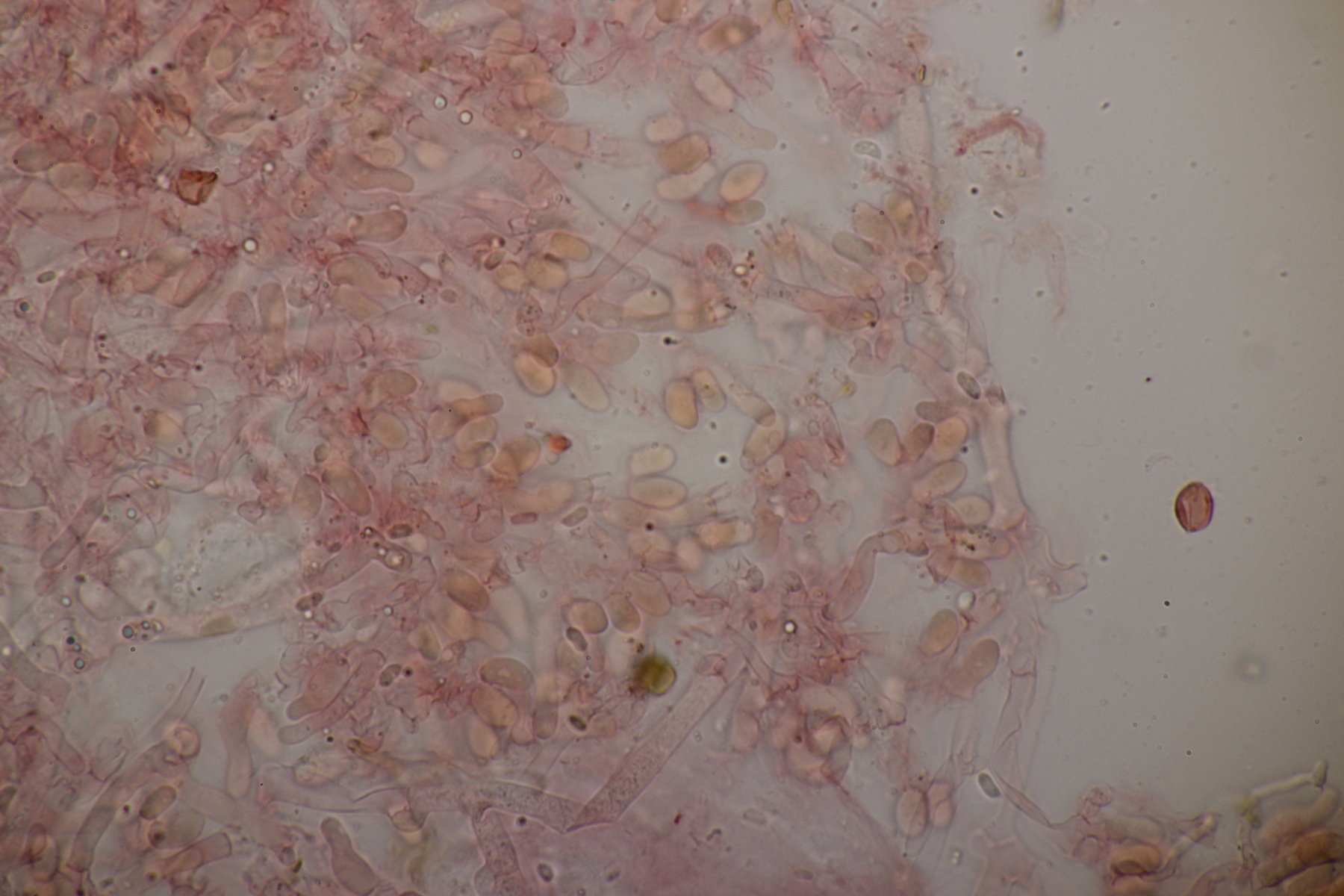 9. Hier lande ich mit den 8-sporigen, urnenförmigen Basidien erstmal bei Sistotrema. Wenn ich dann noch die Zystiden berücksichtige, die durchsichtig waren, lande ich bei Sistotrema coroniferum. Sporengröße (4.7+-0.3) µm x (2.0+-0.2) µm.