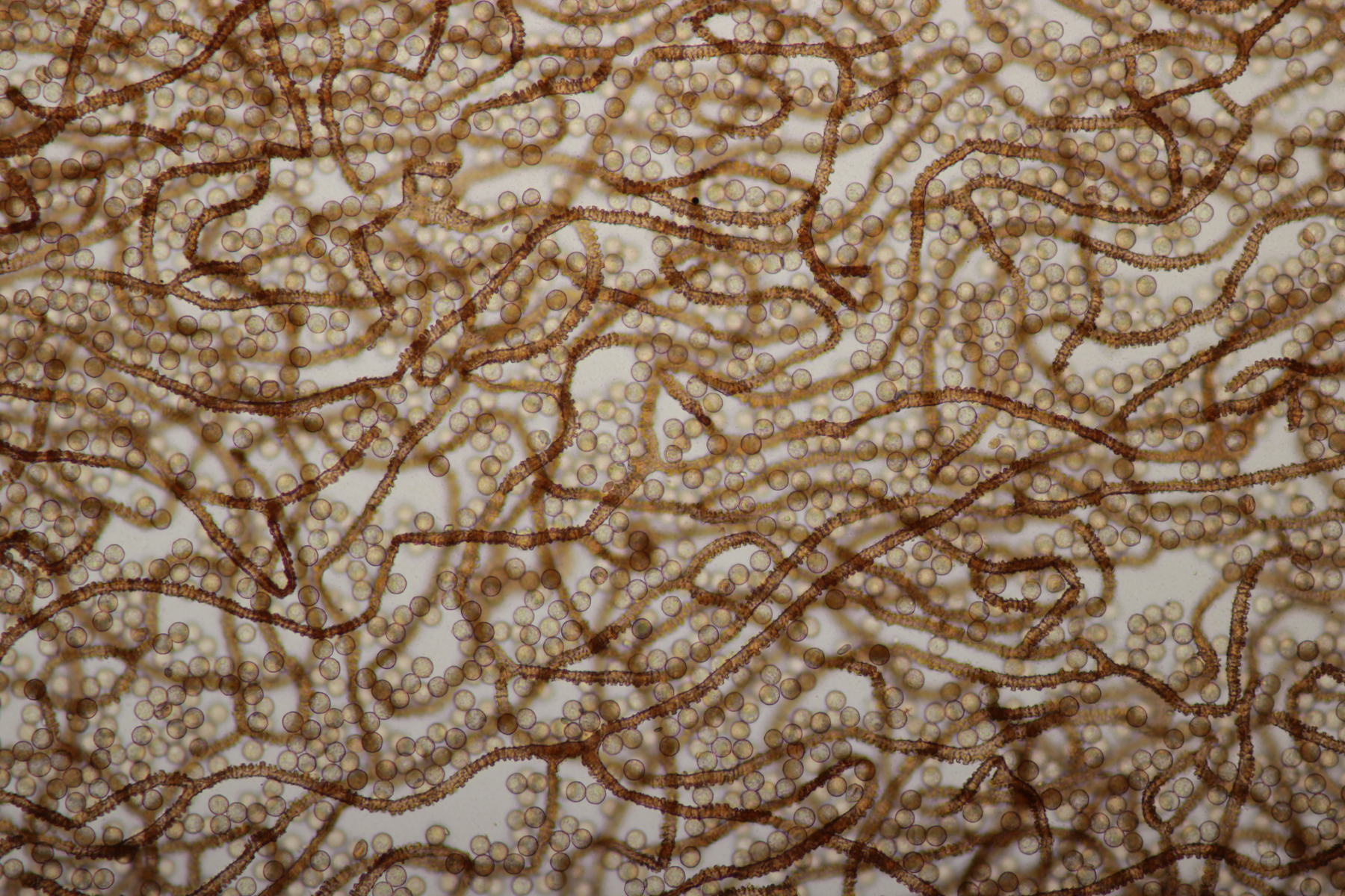 8. Arcyria sp. Das Capillitium ließ sich sehr leicht vom Becher lösen. Sporengröße war (8.2+-0.4) µm. Wenn ich schlüssele, lande ich tendentiell irgendwo bei A. major oder A. affinis.