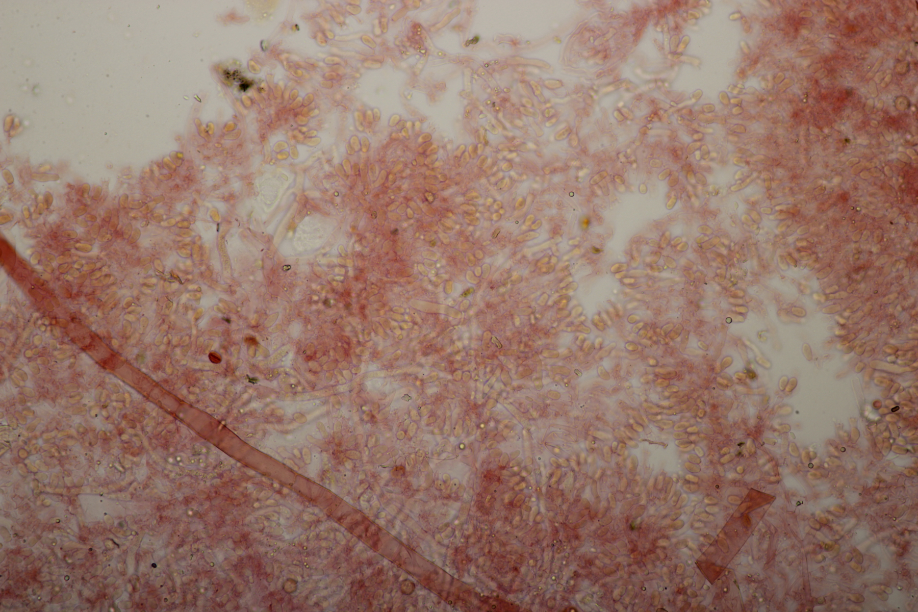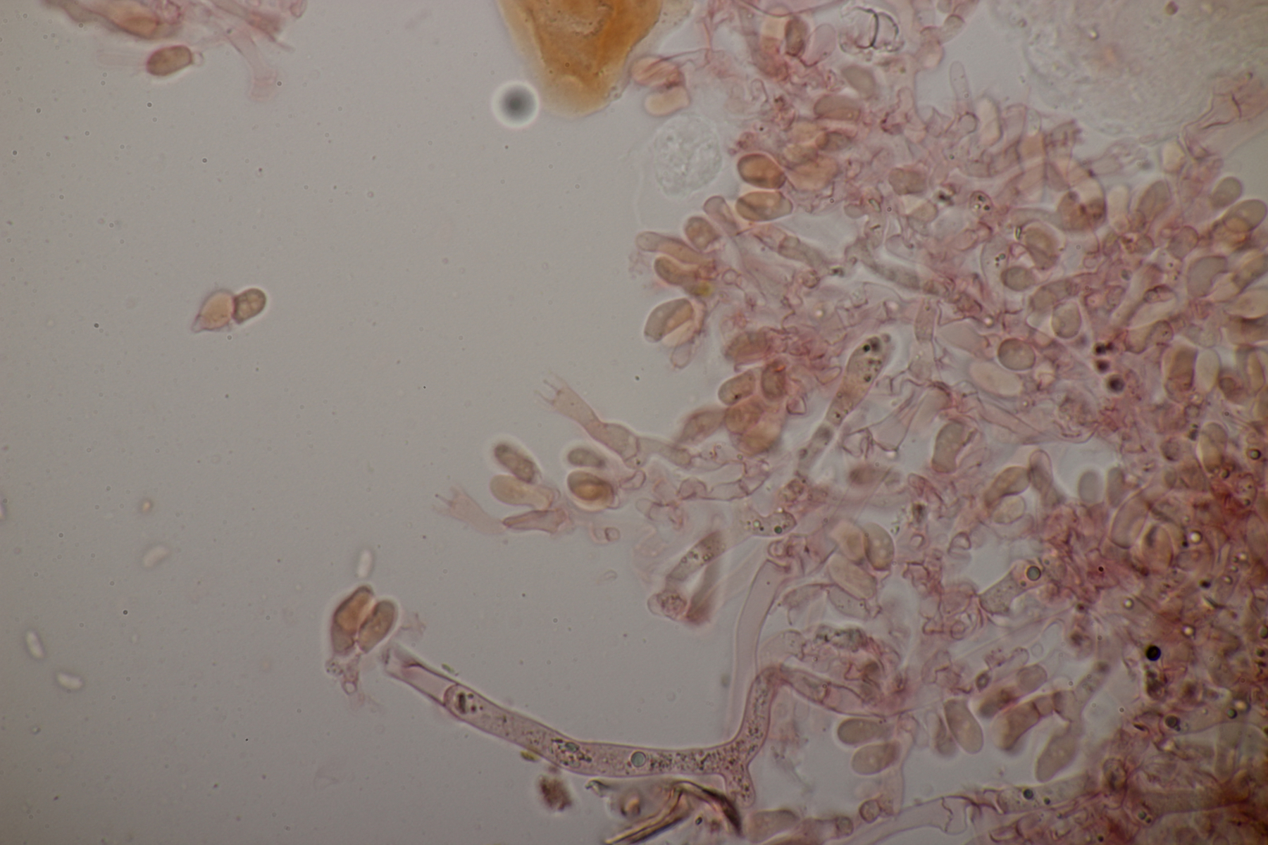 1. Ein Rindenpilz auf Laubholz. Da habe ich mal wieder gar keine Ahnung. Auffällig waren die ovalen Gebilde, die sich überall im Pilz fanden. Aber ob das jetzt dazugehört (Konidien?) oder etwas ganz anderes ist, vermag ich nicht sagen. Ansonsten hatte der Pilz Schnallen und Zystiden, die teilweise leicht kopfig waren und scheinbar von außen einige wenige Kristalle trugen. Sporengröße (4.6+-0.3) µm x (2.9+-0.3) µm.
