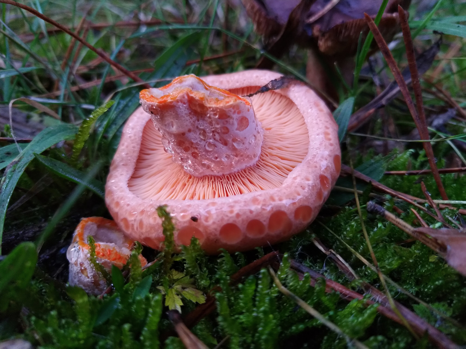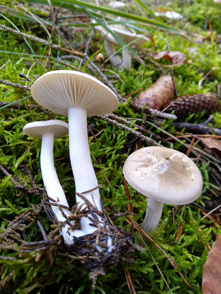 Ich habe heute einen Schneckling unter Kiefern gefunden, welchen ich gern als Hygrophorus suaveolens bestimmen würde. Diese Art wurde erst Letzes Jahr von Jesko Kleine und Ellen Larsson aus Sachsen neu beschrieben. Sie gehört mit Ihrem Geruch nach Bittermandeln und Ihrem Aussehen in den Artenkreis um Hygrophorus agathosmus. Sie Unterscheidet sich von diesem durch ihr Vorkommen unter Kiefern. In dieser Sektion der Unter Kiefern wachsenden, nach Bittermandel riechenden Arten gibt es noch eine unbeschriebene Art welche nur auf Kalkböden vorkommen soll. Mein Fund Stammt aber vom Sauren Boden, so dass H. suaveolens am nächsten scheint. Inwiefern die Saure Art sich aber von der Kalkholden Art unterscheidet, Außer durch die Dunkle Scheibe, welche ich nur bei einigen und nicht bei allen Fruchtkörpern ausmachen konnte, erschließt sich mir nicht ganz. Hier muss ich wohl mal Herrn Kleine persönlich Fragen. Die Fruchtkörper werde ich aber definitiv erstmal exikieren.