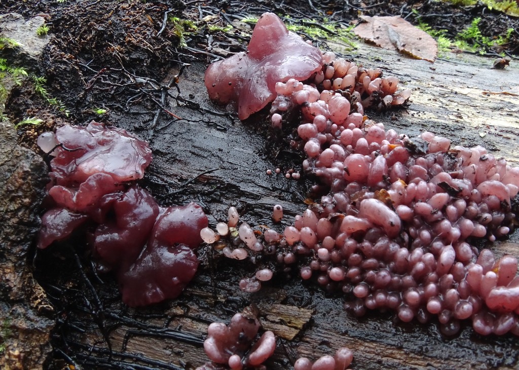Verschiedene Arten Gallertbecher wuchsen üppig und massenhaft. Am auffälligsten Ascocoryne sarcoides, der Fleischrote Gallertbecher, den wir meist zusammen mit seinem Konidienstadium Coryne dubia antrafen (Foto: CE):