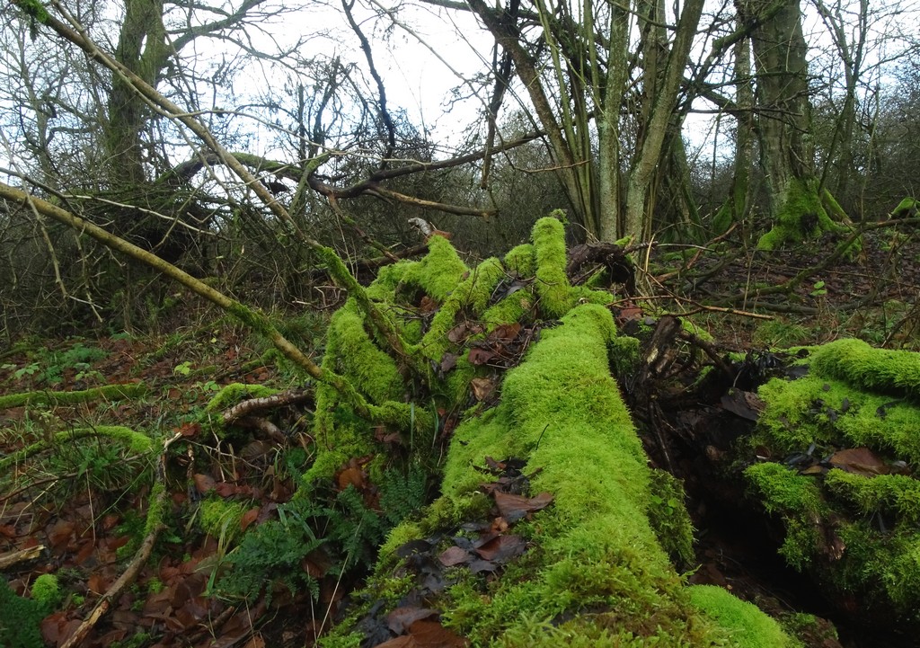 Da hinten wollen wir eigentlich in die Büsche - aber überall lebensvolles Totholz herum. Hier ein dicker Stamm mit einem Überzug von Hypnum cupressiforme (Zypressenschlafmoos). (Foto: CE)