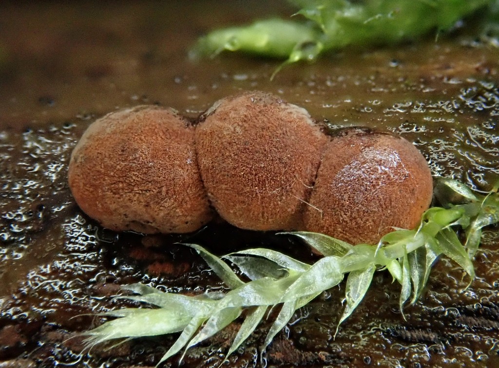 | Ein häufiger Vertreter, der auch schonmal größere Flächen herumliegender Totholzäste besiedeln kann, ist Bertia moriformis, der Maulbeer-Kugelpilz (Foto: CE): |