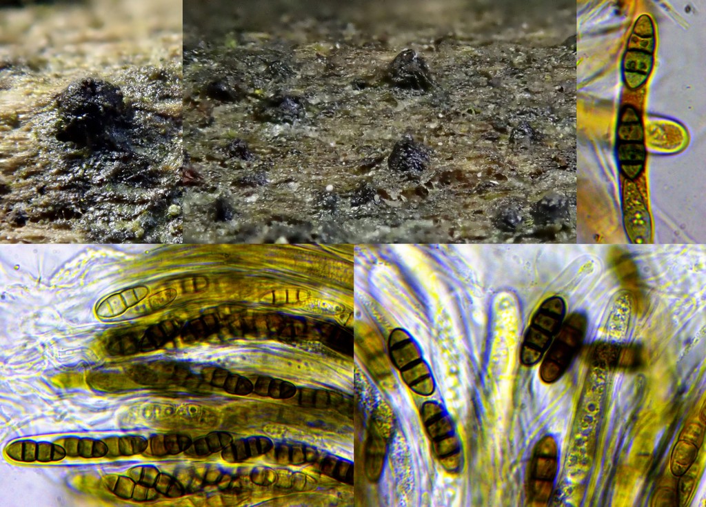 Die Sporenmaße hier sind 17,2-20,9 x 6,6-7,5 µ; auffällig finde ich die 4 Tropfen, die in manchen Sporen zu sehen sind. Bestimmungsversuche bewegen sich hier zwischen Melanomma und Nigrograna....