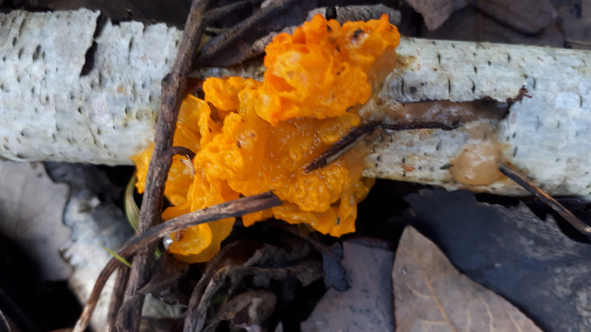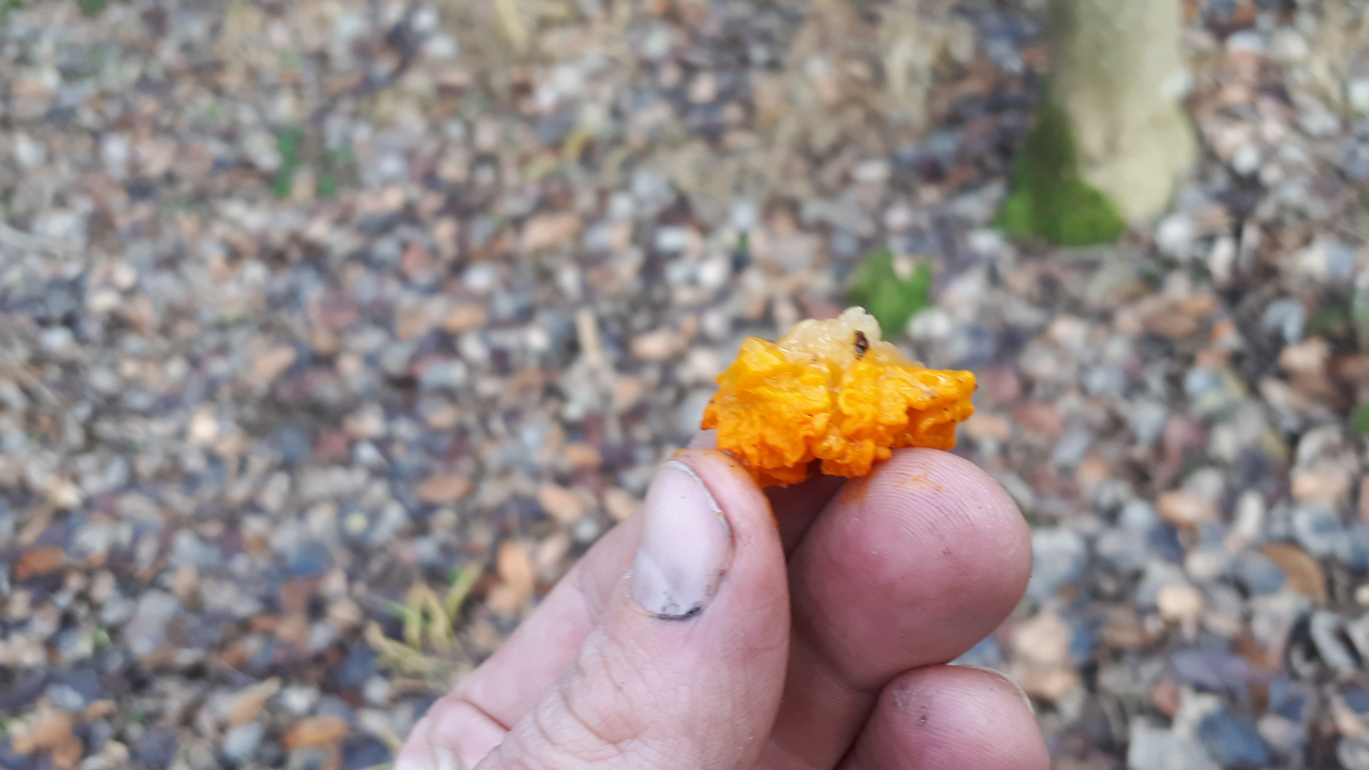 Es käme auch noch Tremella aurantiaca infrage. Man sollte immer mal schauen, ob an dem Ast eine Peniophora wächst oder Stereum hirsutum. T. mesenterica wächst auf Peniophora, T. aurantiaca auf Stereum hirsutum.