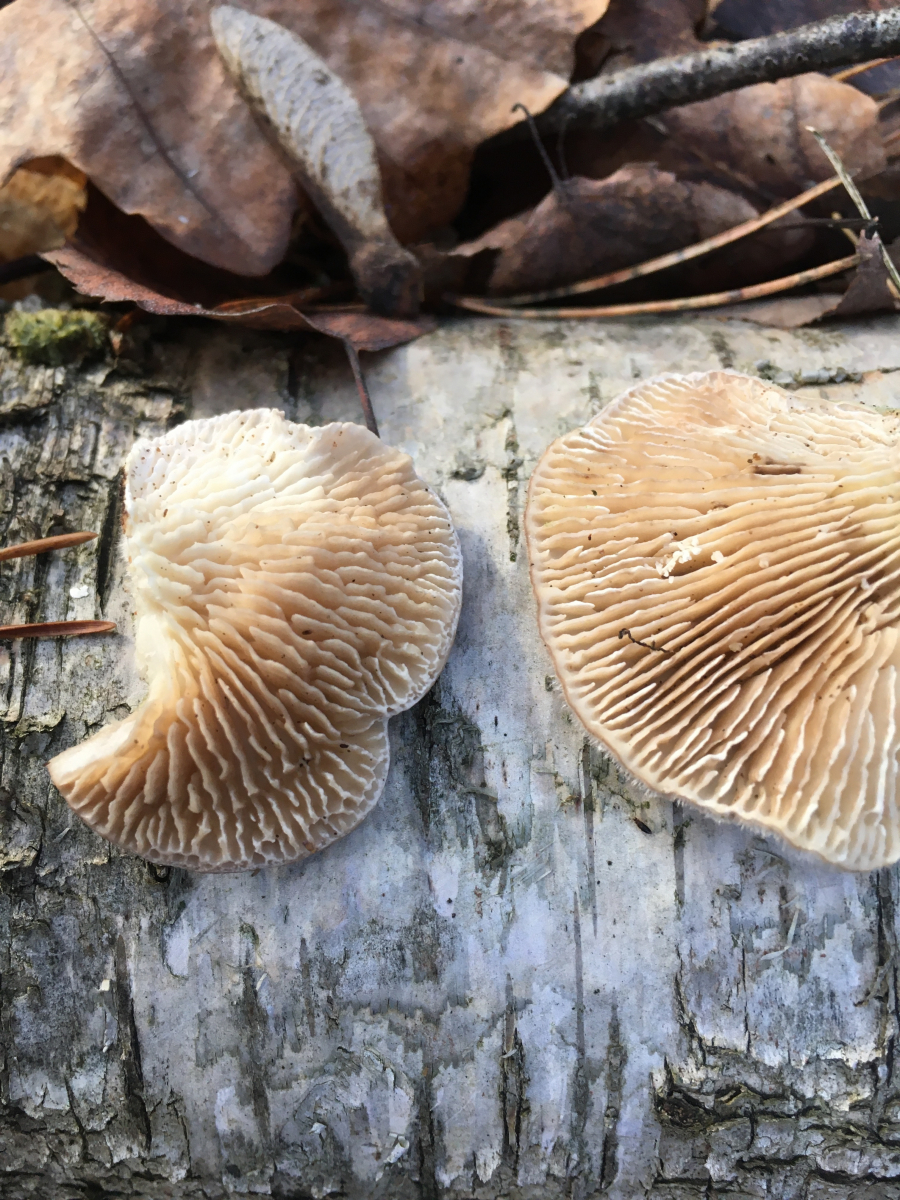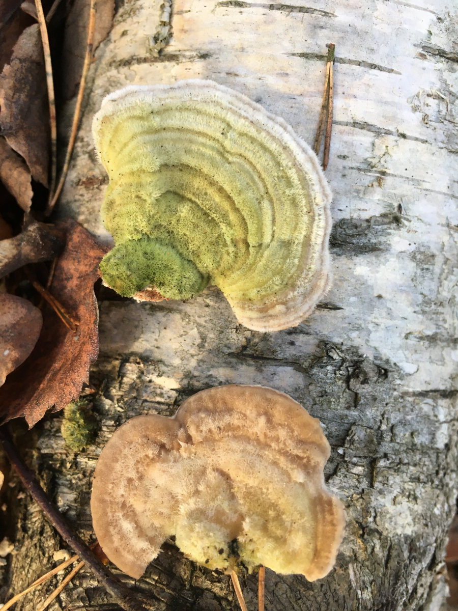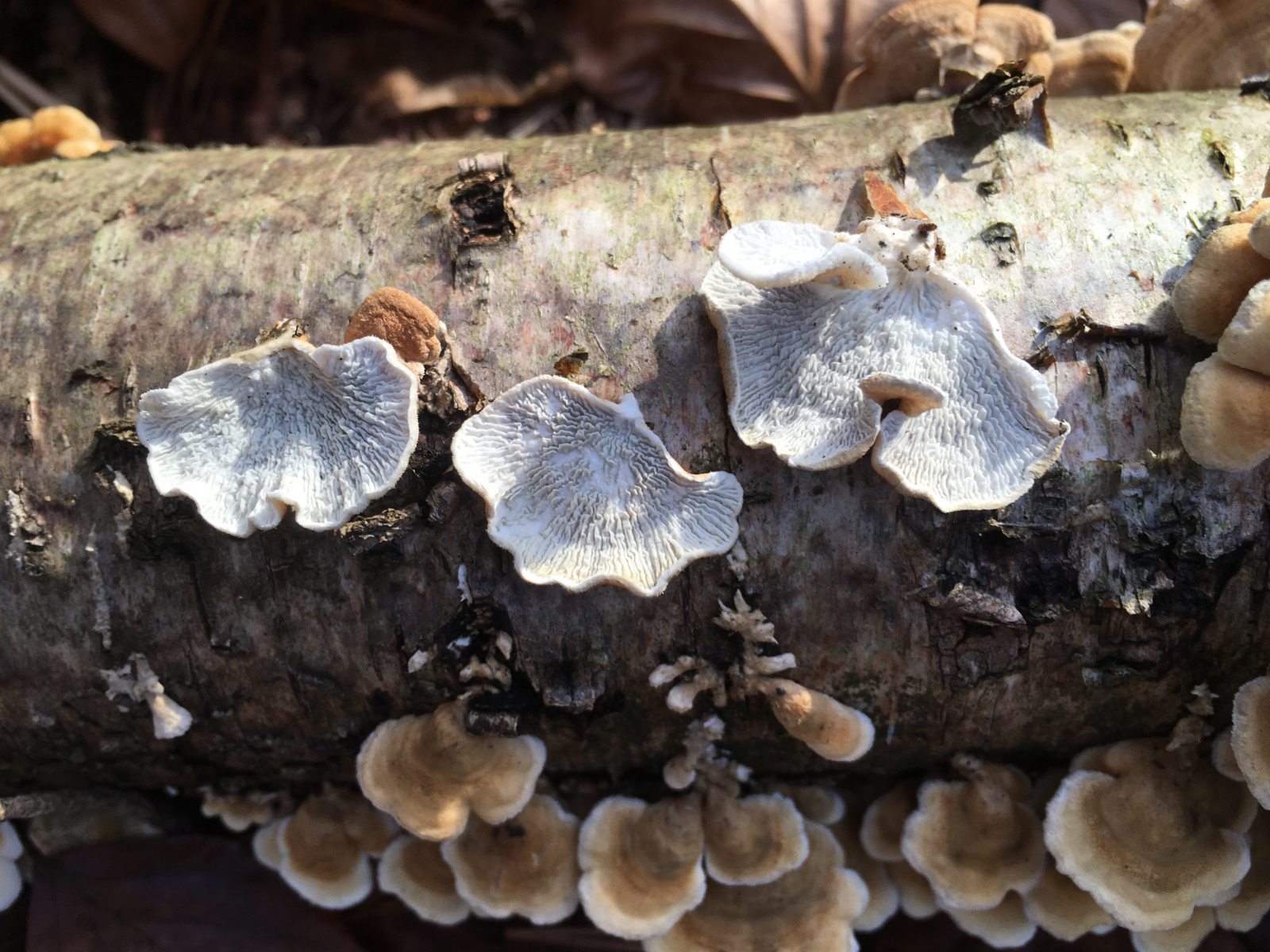 Pilz 6 an Birke liegend, hat mich sauber getäuscht, von oben dachte ich an den samtigen Schichtpilz wegen des Algenbewuchses, doch die Unterseite war gesägt wirr lammeliert.. dann eher der Birkenblättling (Lenzites Betulinus)?